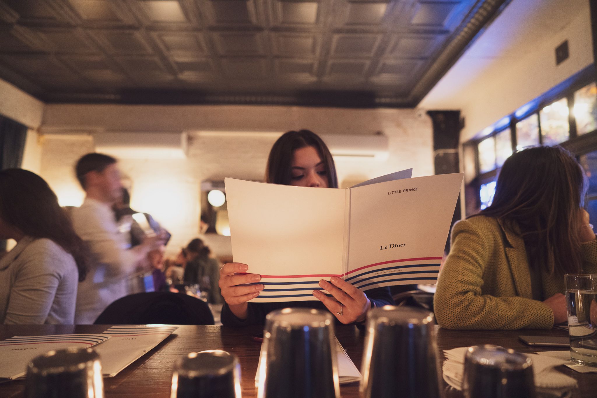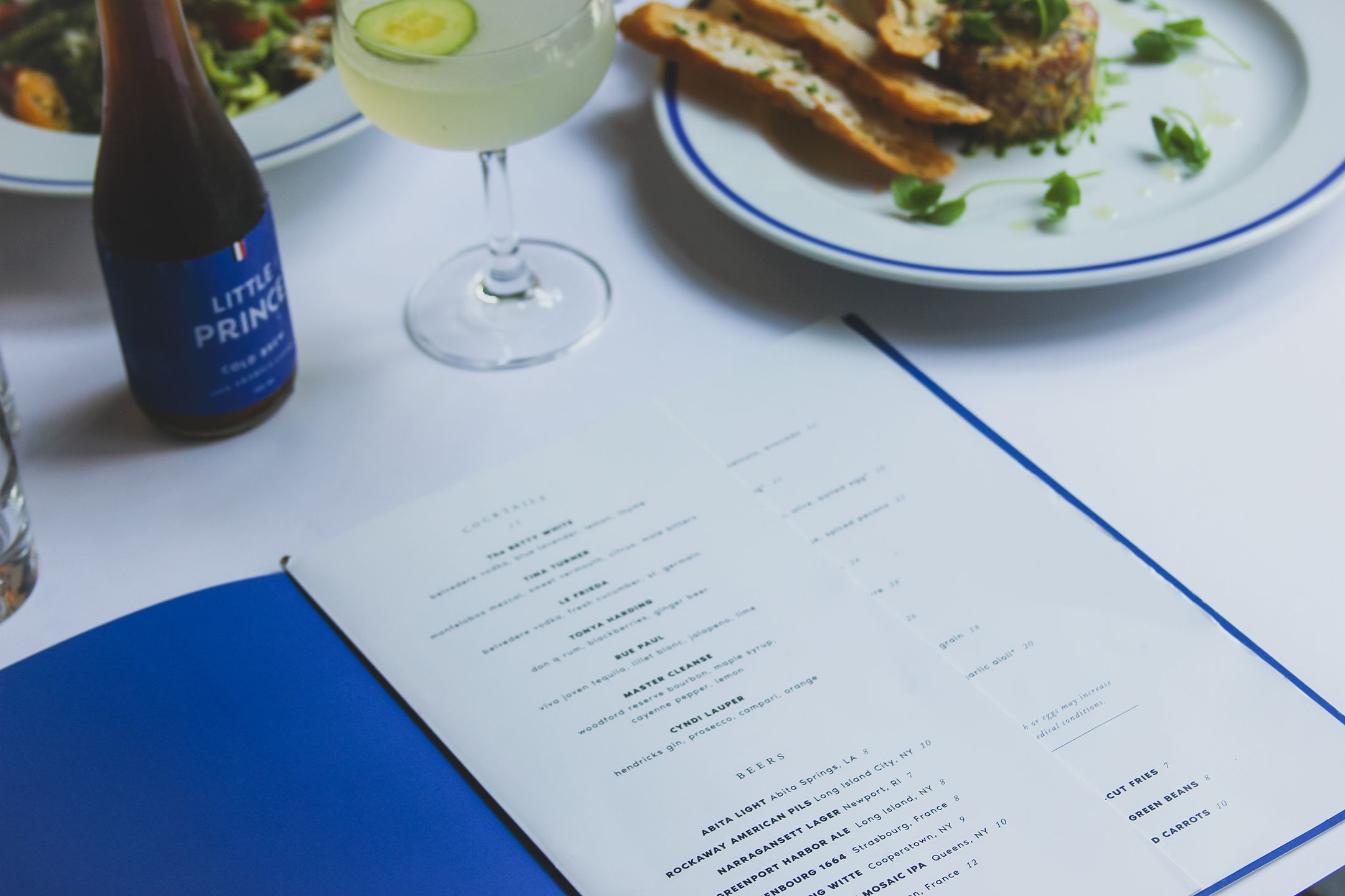 Little Prince holds a frequently rotating wine & beer program, highlighting unique French and local beers and seasonal French cocktails. Dramatic floral arrangements accent the light-filled space, with floor-to-ceiling windows that look out on to bustling Prince Street. Caramel banquettes line the walls and the wooden bar is warmly lit by classic glove pendant lamps. Hand-painted ceramic floor tiles complete the bistro ambiance.