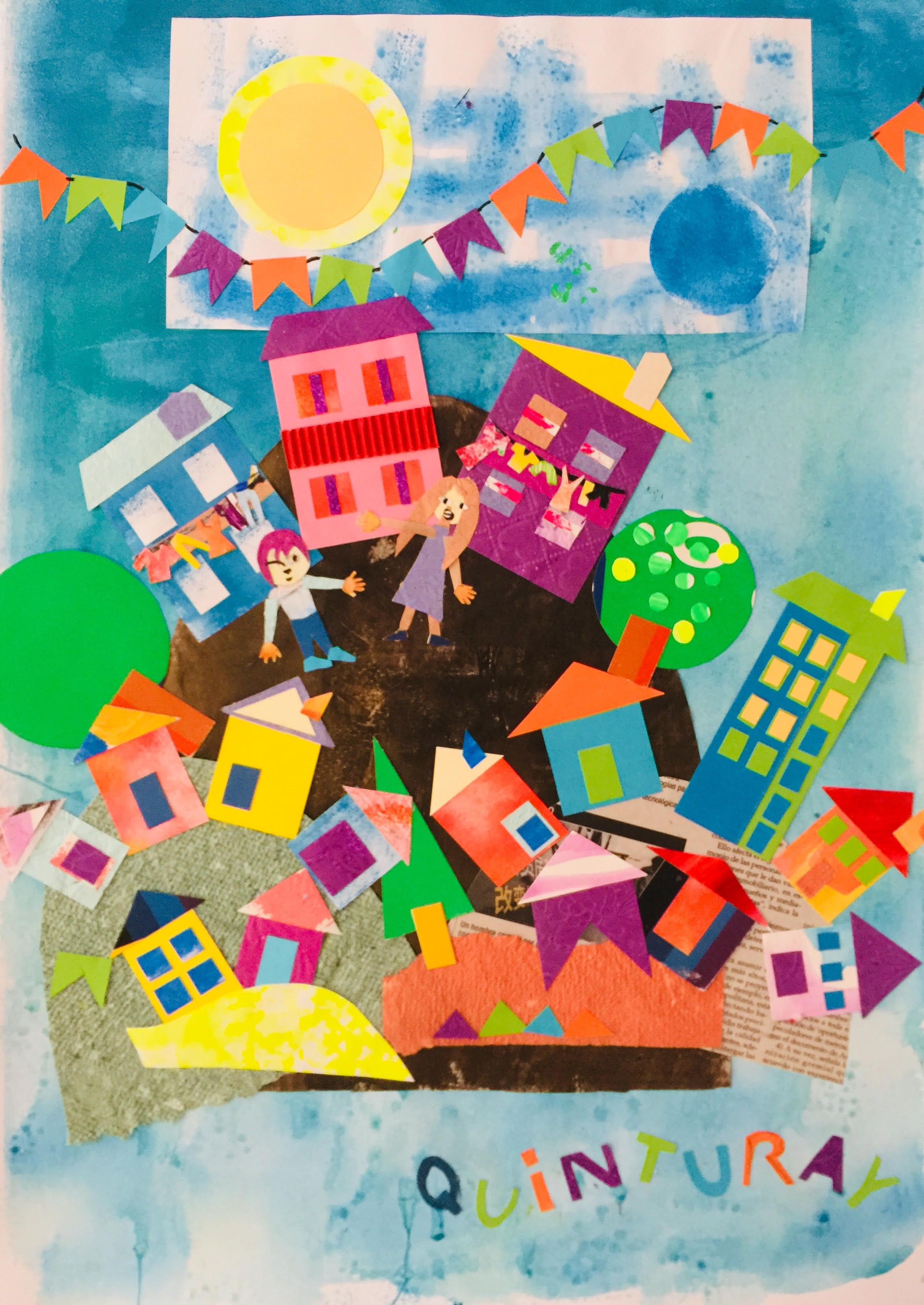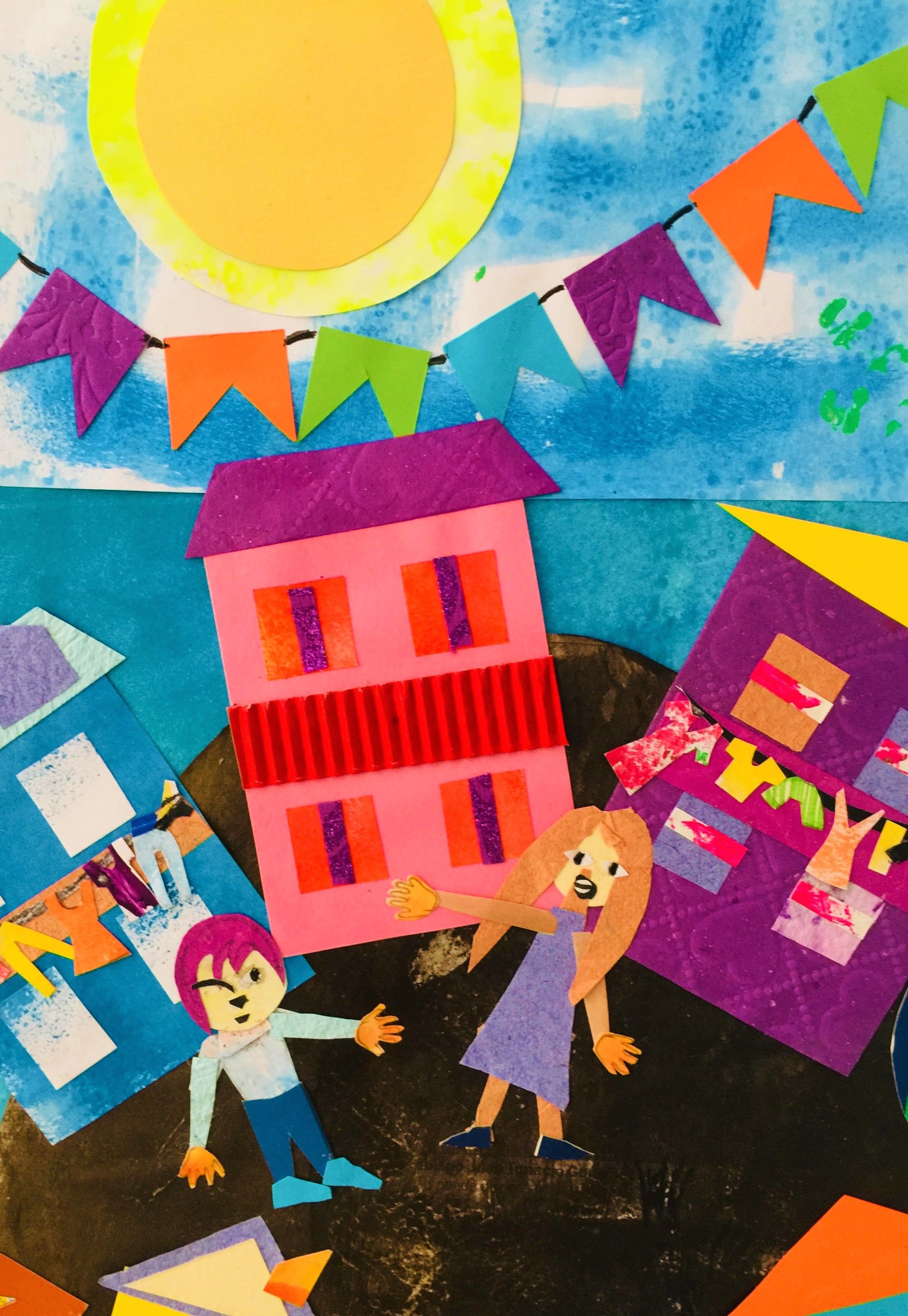 Para realizar la parte técnica recorté muchos papeles pintados a mano, recorte algunos papeles elaborados a mano que tenía en retazos, y después de presentar las escenas comencé a pegar. Se que debo mejorar la parte final de la presentación pero quedé muy conforme con el trabajo en general.y sobre todo homenajeo a los niños con discapacidad visual que por ahí aparecen en mis trabajos.