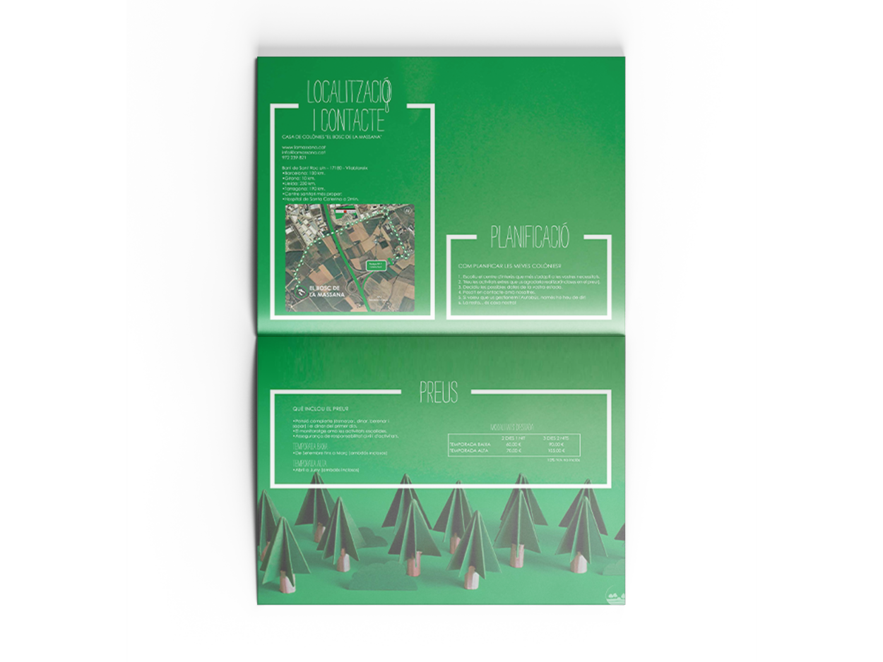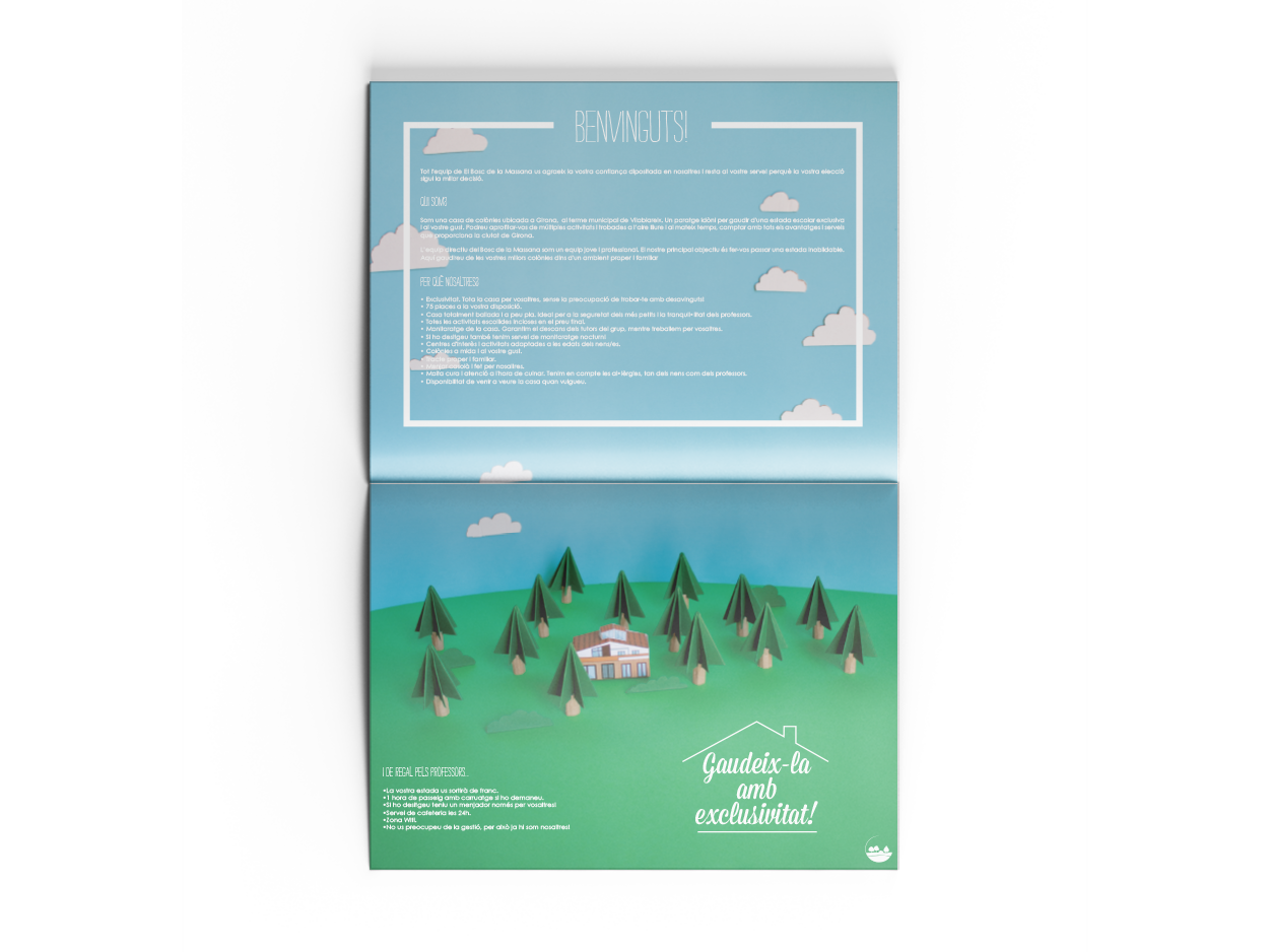 Para el catálogo, se han ilustrado las páginas con fotografías de el bosque y la casa hechas en papiroflexia como manera de evocar las actividades infantiles y además las cosas naturales y sencillas.