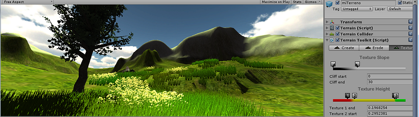 Terreno III - Unity. Tree Creator (personalizado), Terrain Toolkit (4 texturas) y Wine Zone.