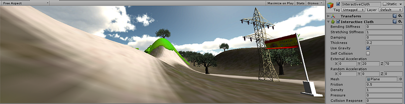 Terreno IV - Unity. Rigitbody (dotar al objeto de propiedades físicas como peso, masa, gravedad..), Material físico e Interactive Cloth (bandera simulando propiedades de la tela).
