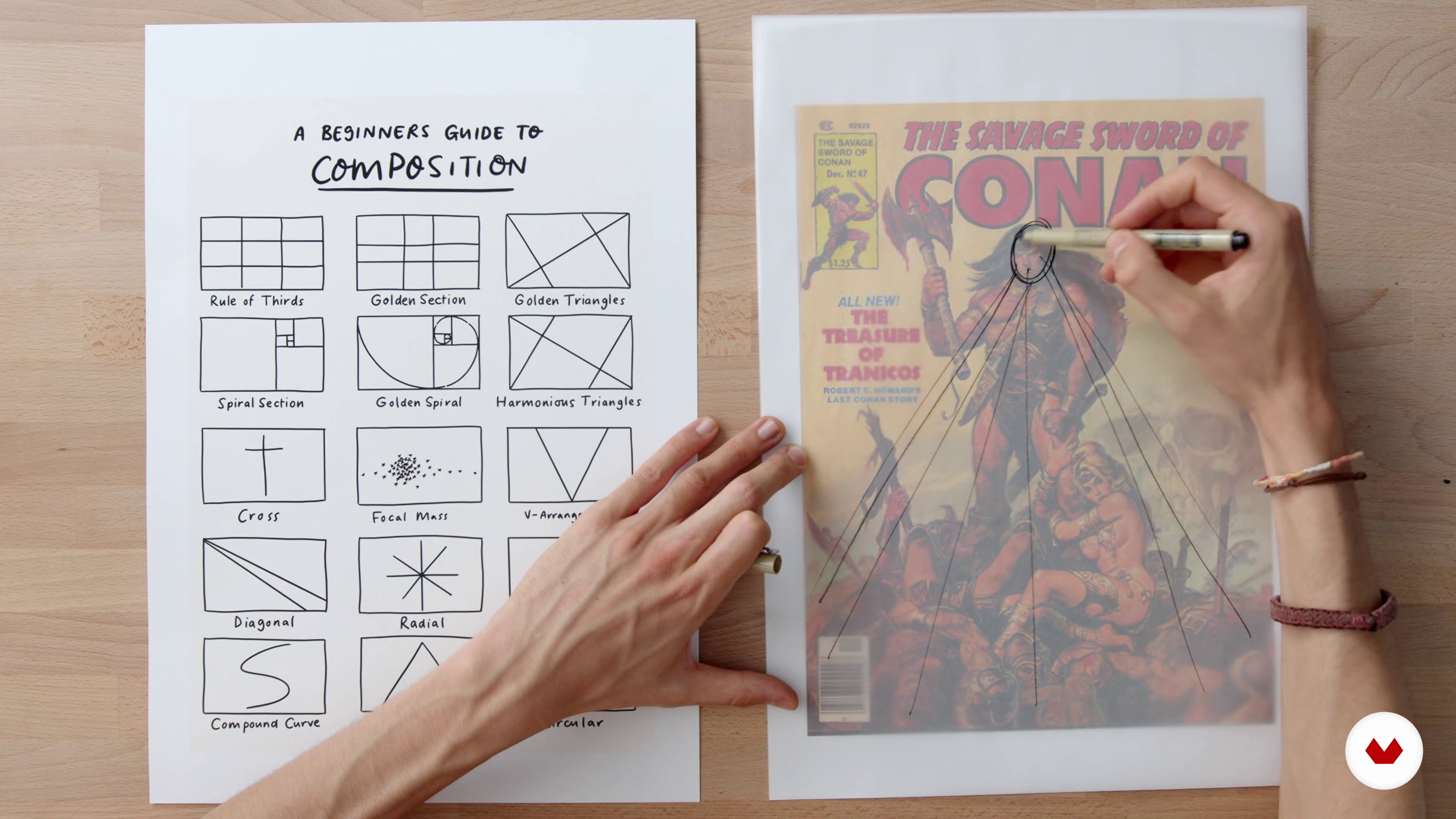 “Pekala. şimdi size tahtada bittiğini ve kapağa geçeceğimizi söyleyebilirim. Her zaman karakter storyboard'a daha fazla zaman ayırmak için geri dönebilir ve mükemmele ulaşana kadar daha fazla seçenek varyasyon bulabilirsiniz. Her neyse. şimdi kapak hakkında konuşacağız. Size getirdiğim şeyler. çok önemli veya benim çok beğendiğim bazı kapak örnekleri. Bu örneklerle ne tür kompozisyon ve ritim tekniklerini kullandıklarını biraz açıklayacağım ve belki de kendi resimli kitabınız için kapak yaparken ilham alabilirsiniz. Önemli noktaları detaylı bir şekilde anlatıp. size faydalı olabilecek birkaç...”