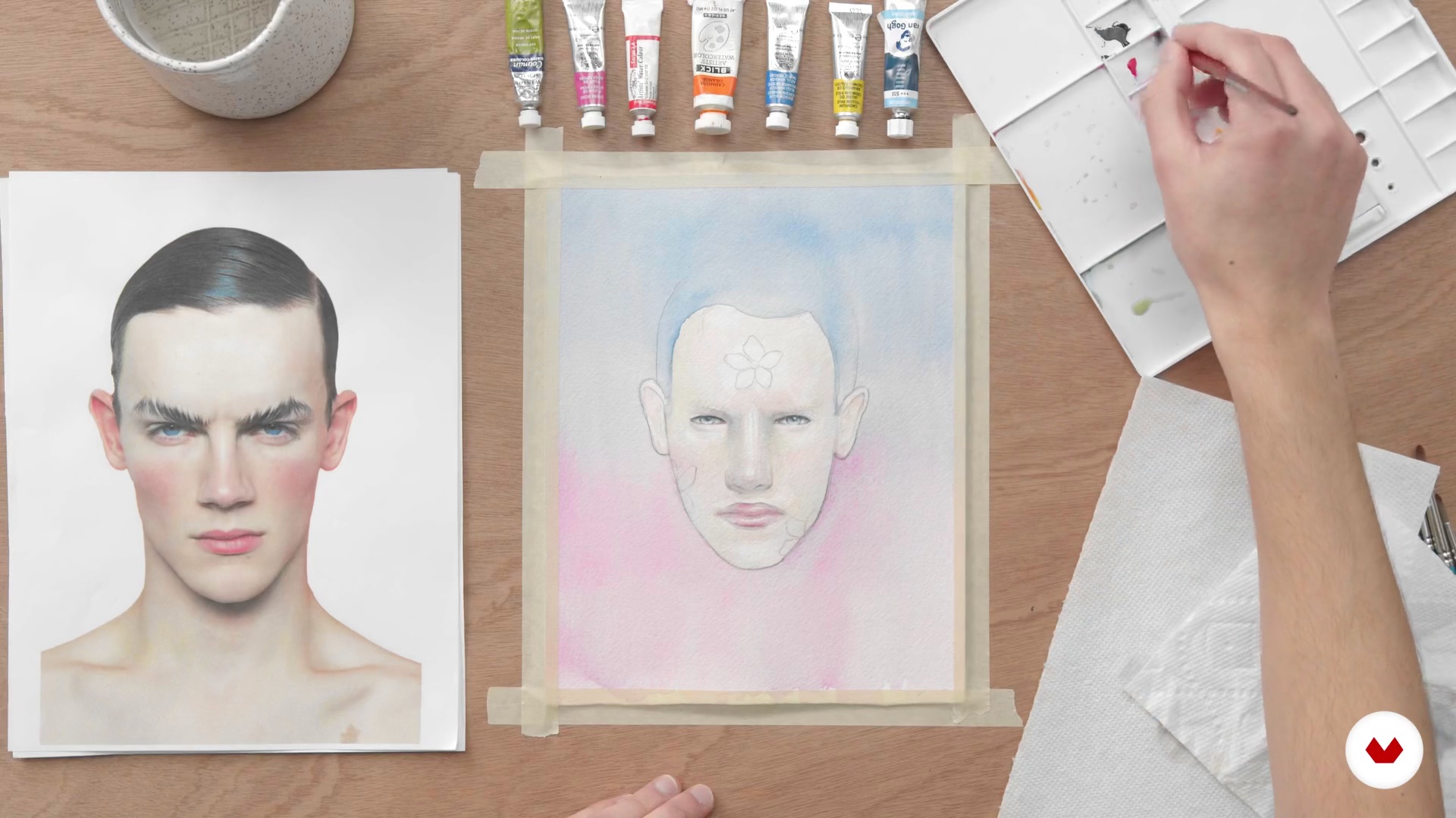 Bu video dersinde Arthur Braud Domestika çevrimiçi kursunun bir parçası olan Cilt Tonlarını Boyama 2 konusunu ele alıyor: Etkileyici Suluboya Portreler . Güçlü bir mesaj içeren büyüleyici portreler oluşturmak için renk, kompozisyon ve tekniği keşfedin.