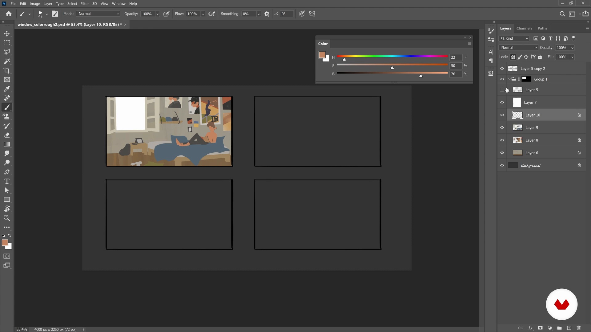 “Renk paletindeki yinelemeler Artık birkaç eskizimiz olduğuna göre, en sevdiğimiz kompozisyonun bulunduğu görüntüyü seçeceğiz. Aynı taslaktan, Sadece aydınlatmayı değiştirerek farklı atmosferlere sahip olabilirsiniz. Çizimimize renk katacağız ve farklı renk paletleri sunuyoruz. Kişisel olarak bu benim en sevdiğim adımdır. Hadi gidelim ! Bir önceki adımdaki favori taslağımızı seçtik ve şimdi, renklerle çalışmaya geliyoruz. Yeni bir katman oluşturuyorum ve oldukça nötr bir temel renkle başlıyorum. Hafif sıcak tonlarla başlıyorum. Göreceksiniz çünkü parke zemin yapacağım. Poligonal Kement ile i...”