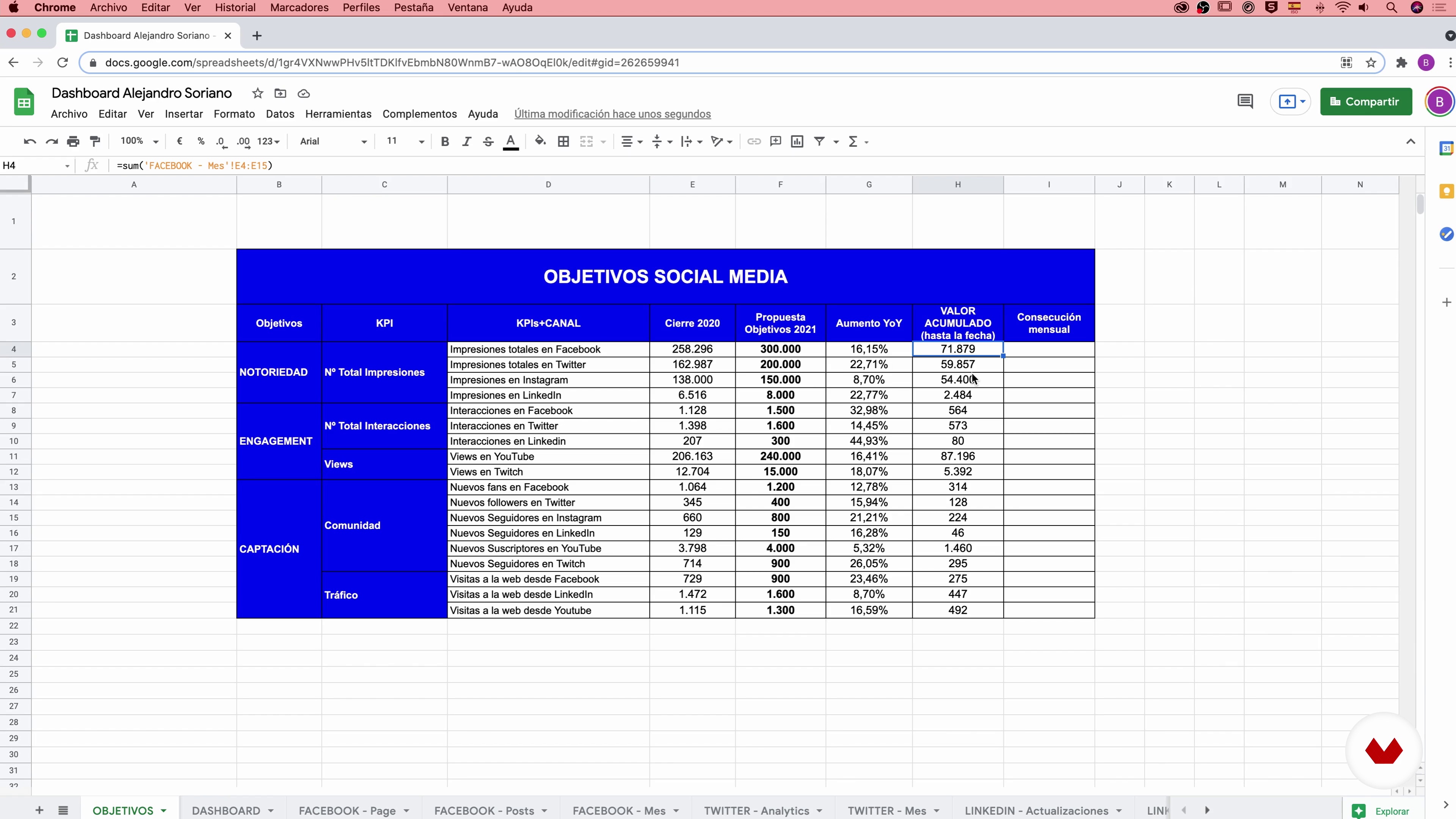 “Bu derste hedeflerimizi tanımlayacağız. bunları nasıl takip edebileceğimizi ve belirlenen sürede başarıp başaramayacağımızı göreceğiz. Haydi bakalım. Bunu yapmak için elektronik tablomuzun ilk sekmesine dönüyoruz. Burada tanımladığımız hedefler ve KPIs yer alıyor. KPIs sütununun yanına 5 yeni sütun ekleyerek her kanal için bu sütunları oluşturuyoruz. Böylece. her bir kanal için detaylı bir izleme yapabiliriz. İlk sütunda 2020 kapanışını koyacağız. Bu ne anlama geliyor? Yıllık hedeflerimi belirlemeye çalışırken. önceki yılın KPİ'lerini ve hedeflerimizi incelersek daha faydalı olacaktır. Bu s...”