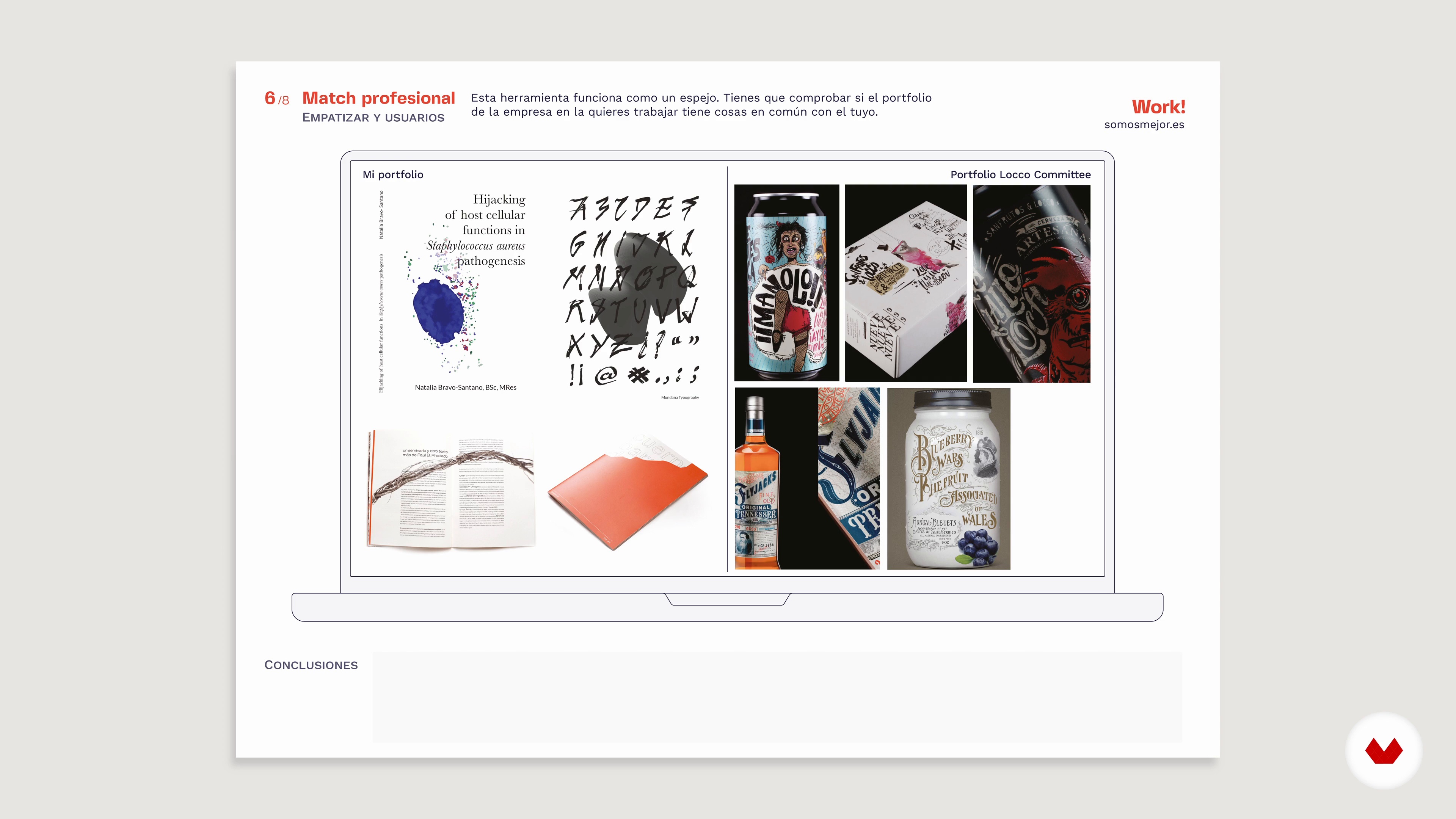 “Profesyonel maç Bu derste size bir Work! aracını sunacağım. profesyonel maç. Ayna gibi çalışır, portföyünüzün solda olup olmadığını kontrol etmelisiniz Şirketin portföyüyle ortak noktaları var çalışmak istediğin kişi, burada sağda. Isabel'in profesyonel Eşleştirme aracına bakalım. Isabel çalışmak istediği büyük bir ajansı seçti ve iki küçük stüdyo. Bu durumda Isabel benzer olabilecek işleri almıştır Wearebold.es'in çalışmalarına. Bazı ortak noktaları olan bu postere bakın Fluye'un bu diğer çalışmasıyla. Aşağıdaki posterlerde de bazı diyaloglar olabilir, Bu açık hava yaz sineması posterleriy...”