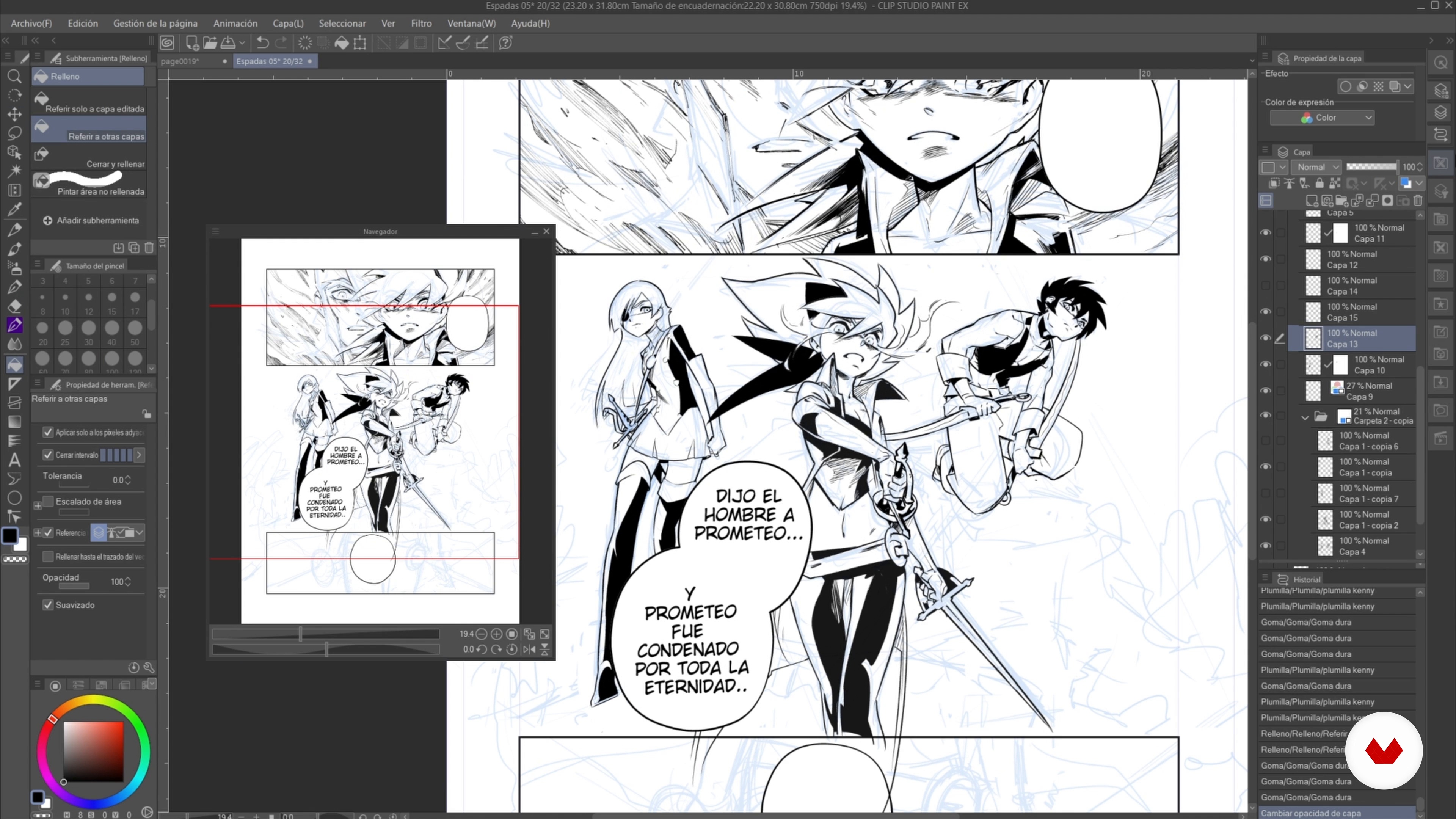 “Bu çizimleri oldukça iyi çözmüştüm. böylece güzelce boyayabilirlerdi ama dikkat edin şimdi Nemo'ya geldiğinde... Şuradan doğrudan mürekkepleme yapmaya cesaret edemiyorum bu kadar şematik bir konsept üzerinde. dolayısıyla çok düşünmeden ve üşenmeden. Başka bir katman oluşturup biraz daha bitiriyorum. Özellikle bu ifade. önceden yaptığım tüm çalışmayı kaybetmemeye çalışacağım. ifadesini analiz etmeyi denemeliyiz ve bu tutumu savunarak ulaşmak istediğimiz nihai amaca dair kesin Dagos'u çizmek için. Sayfanın tamamının penceresini görmek istiyorum ki sayfada ne çizdiğimi sürekli algılayabileyim....”