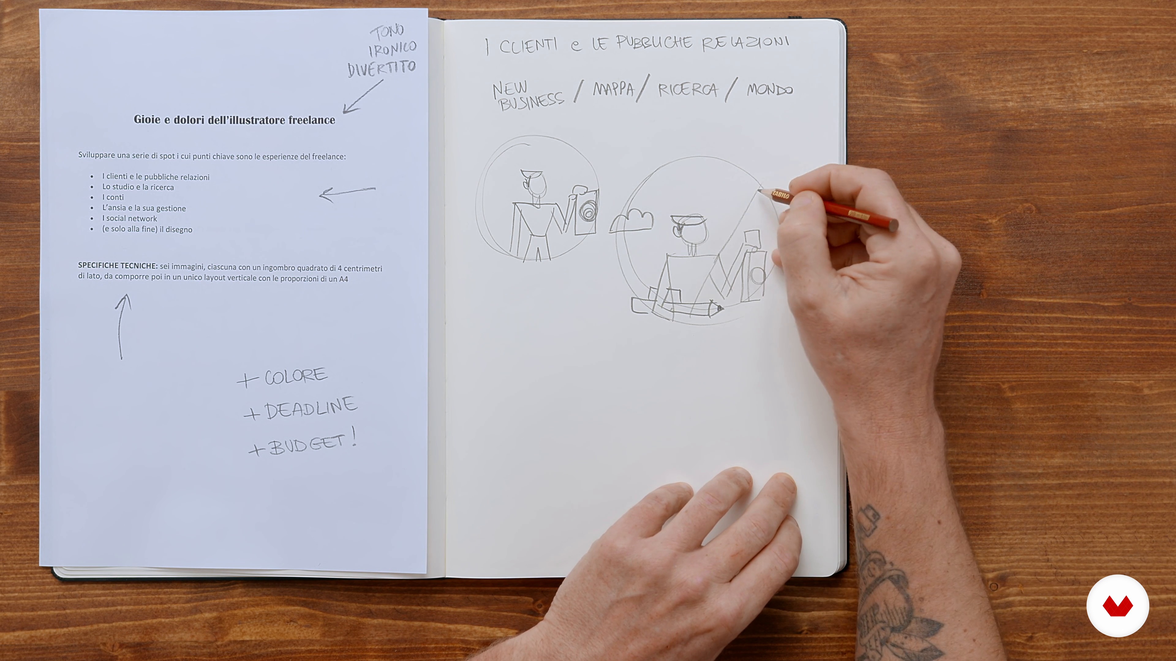 “İlk eskiz Kalem ve kağıt ve başlamaya hazırız. Bu dersimizde ilk eskizimize başlayarak fikri geliştiriyoruz. Her zaman bir parça kağıt ve kalemle başlarım. ama hangi enstrüman sizi rahat hissettiriyorsa, aynısını yapacaktır. Bu aynı zamanda biraz büyülü bir an fikirlerinizin şekillenmeye başladığı yer ve kağıt üzerinde bitiyor. Yapılacak ilk şey Kendinizi mümkün olduğunca kısa özetin içine kaptırmaktır. Kullanabileceğiniz yöntemlerden biri onu kelimelerle daha iyi geliştirmektir. Bu durumda benim için oldukça kolay. çünkü serbest çalışan bir illüstratör olarak kişisel deneyimimden yararlanı...”