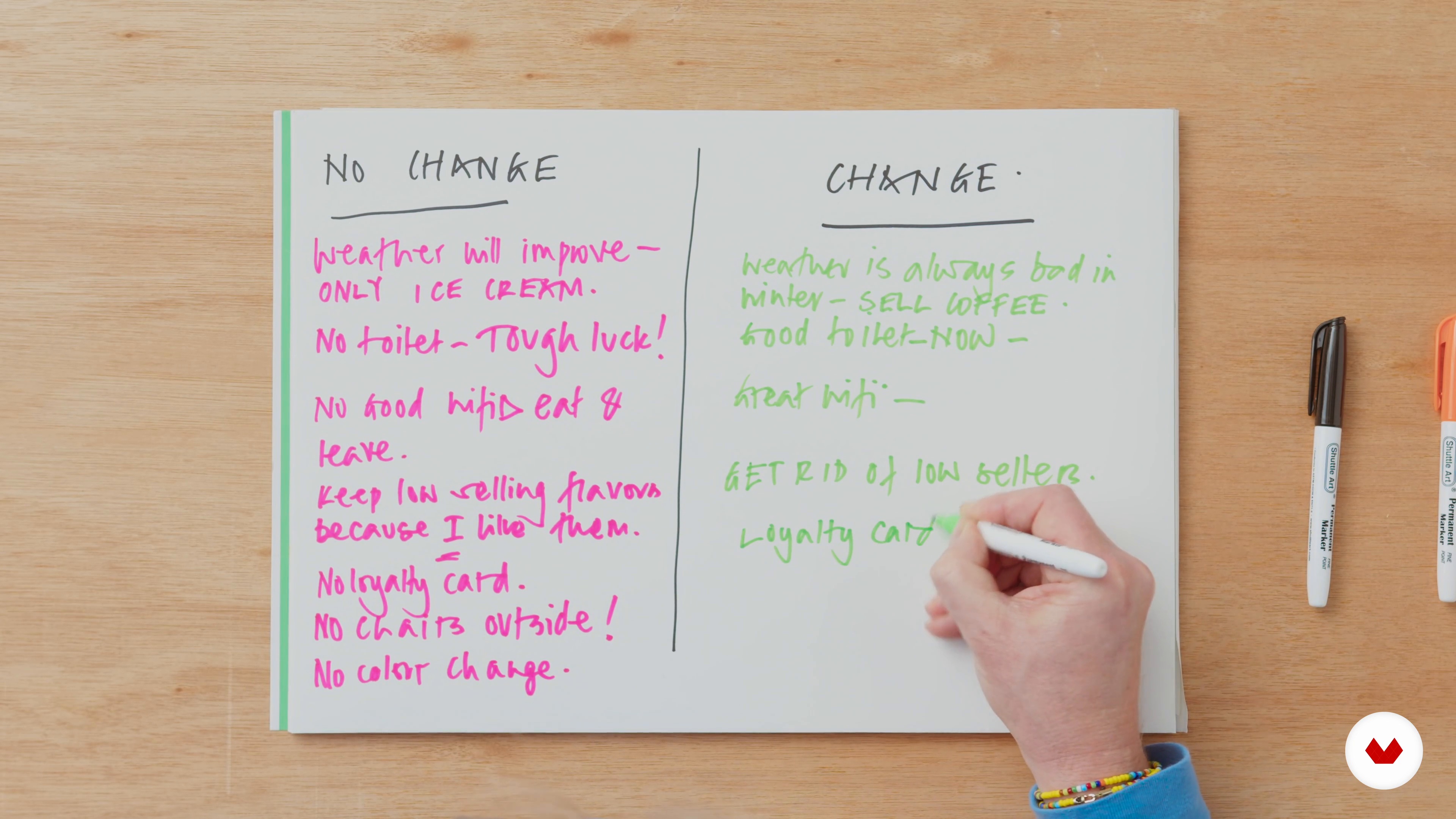 “İkinci sütuna geçiyoruz. değişiyoruz. Şimdi hava berbat. Bazı günler hiç dondurma satmıyorum. Birçok ülkede kışın insanlar dondurma yemez. Bunu kabul edelim. Peki. bunu değiştirmek için ne yapabilirsiniz? İnsanların istediği şeyleri satmaya başlayabilirsiniz. Kış aylarında sadece dondurma satan bir dükkân fikrinizin işe yaramadığını fark etmelisiniz. dondurma yemediği gerçeğini kabul edin. Bunun çözümü. çay ve kahve satmaya başlamak gibi görünüyor. uyum sağla. Bakalım insanlar bunu istiyor mu. Üzerine inşa et. Değişen kişi değişir hava her zaman havadır. dedi. her zaman kötü. iç kış Hadi sa...”