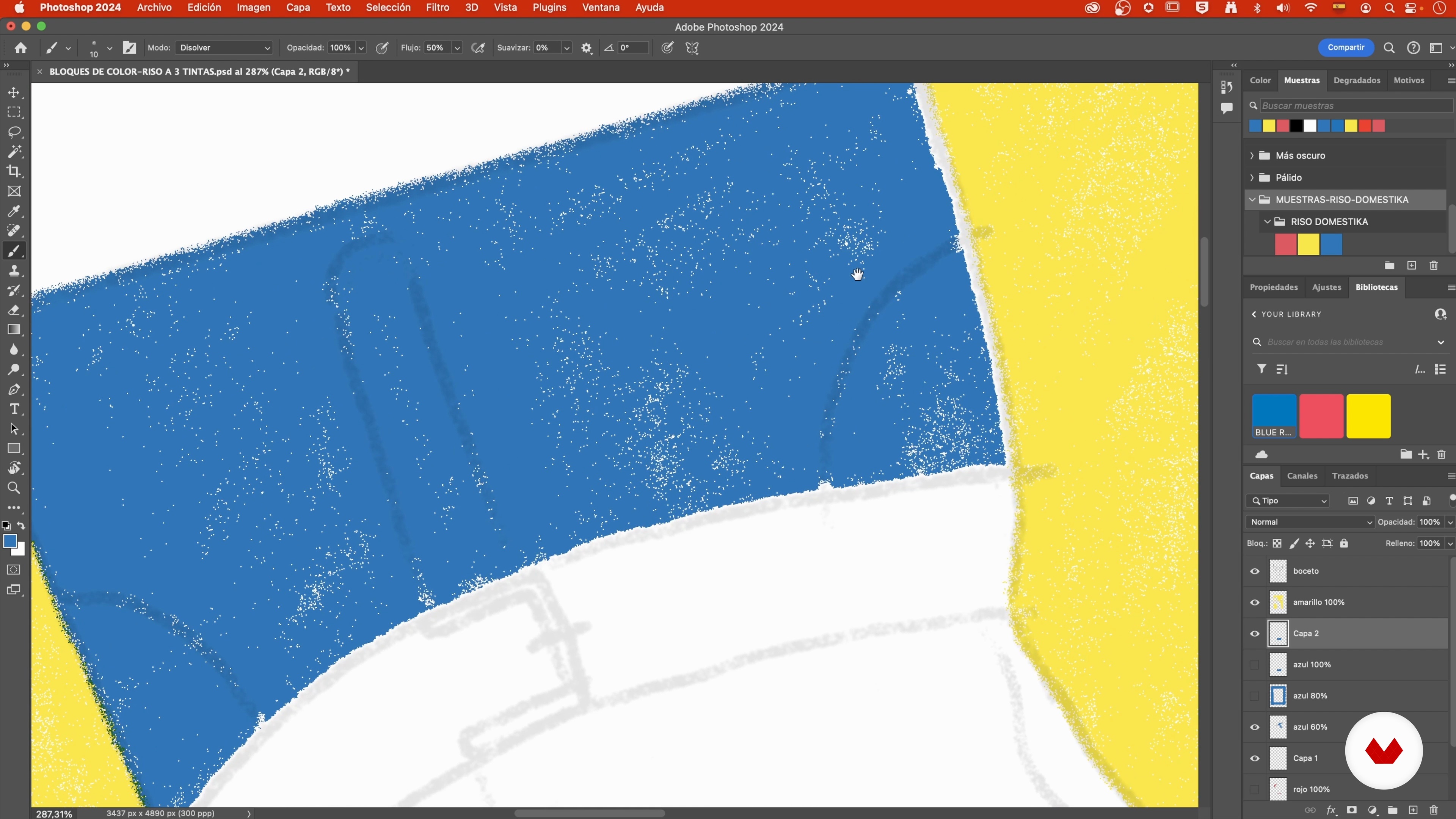 “Bu derste. dokuları bir renk gibi uygulayacağız. Riso baskısının görüntüye oldukça ilginç bir doku katacağını unutmayın; bu. çalışmanıza benzersiz bir karakter ve derinlik kazandırır. Ancak biz. fırçalarımızla. dilersek görüntüye daha fazla zarafet veya zenginlik ekleyebiliriz. Bu. çalışmamıza özgün bir karakter kazandırır. daha önce gösterdiğim gibi. bende var... çalışmayı sevdiğim birkaç fırçam var. ve kendi çizilmiş dokularımı yaratmayı sevdiğim fırçalarla. Yapacağım şey. katman katman yeniden çizerek onu yeniden oluşturmaktır. Örneğin. sarı rengi seçip ona odaklanacağım ve diğer renkler...”