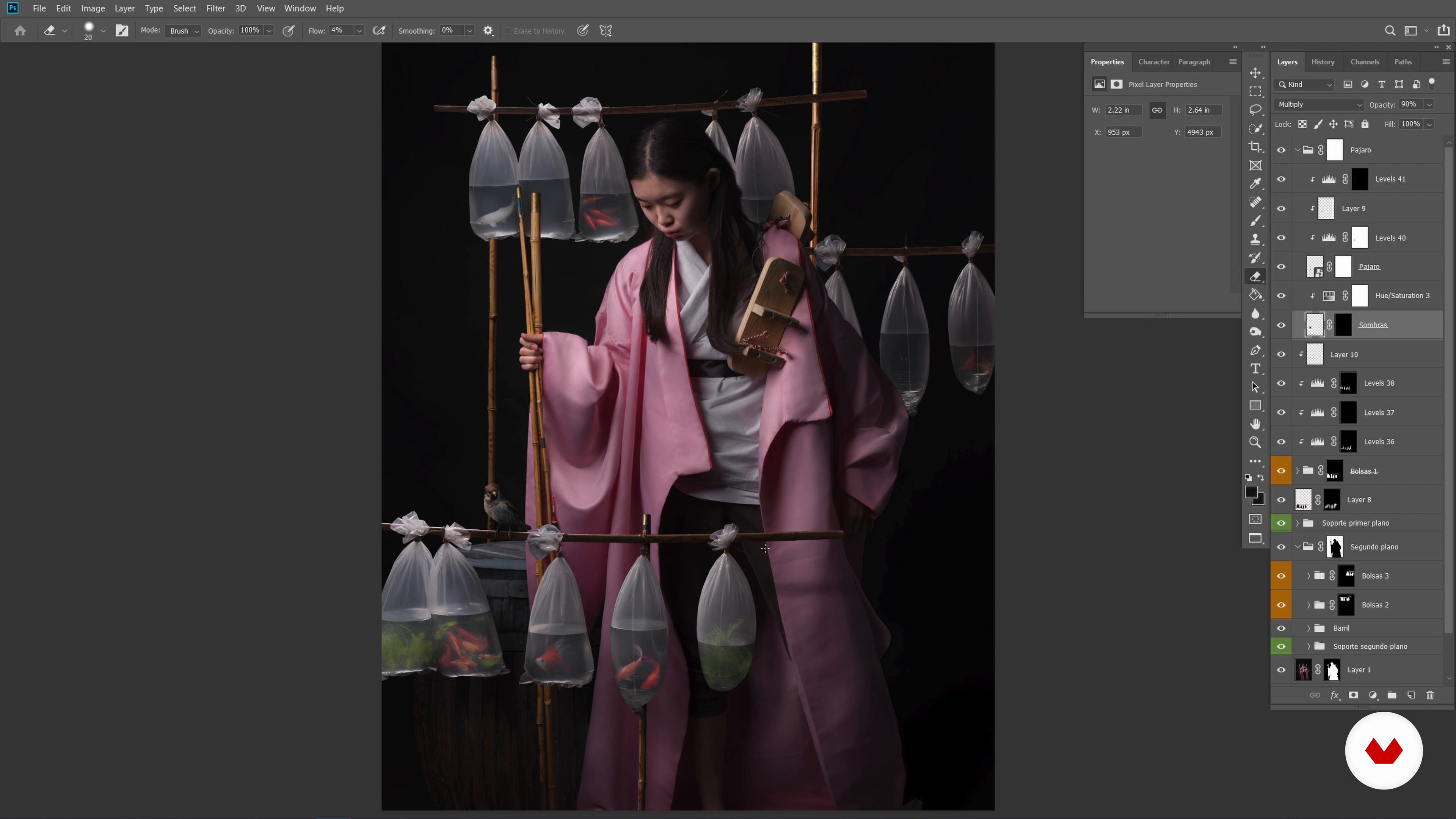 “Bu ayar katmanlarını torbaların bulunduğu klasöre uygulayacağım. böylece etki hem torbalara hem de balık yosunlara yansıyacak. Bu şekilde tüm unsurlar etkilenmiş olacak. Seviyeyi yükseltip daha derin bir karartma yapacağım. Varille kullandığımız şemayı takip ederek parçaları karartacağım. Ve eğer hacmi daha da artırmak istersem. başka bir seviye ayar katmanı ekleyebilirim ve bu sefer orta ve yüksek ışıkları aydınlatırım. Siyah bir maske üzerine çizerek. daha fazla ışık gerektiren alanları ortaya çıkaracağım. Böylece daha kontrast yaratırım. daha fazla ses Torbalara henüz şeffaf olmadığını d...”