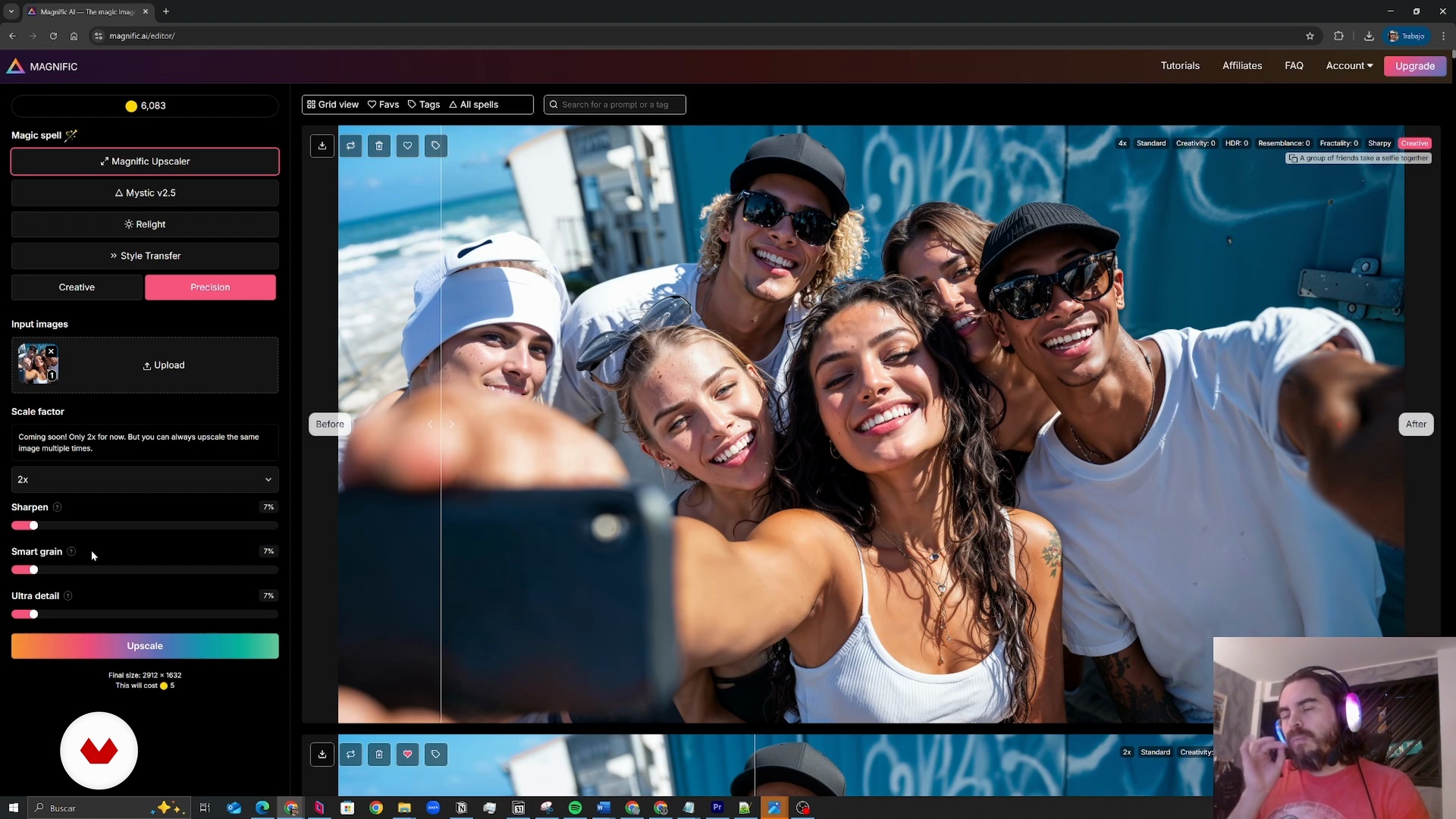 “Başlayalım. tek seferde tamamlayalım. Görüntümüzü yükledik. İstemimizi hazırladık. iki kat yapacağız ve önerdikleri gibi başlayacağız. İlk motorumuzu kullanarak başlayacağız ki bu motorun performansı hayal. Sonra... Çok az bir çaba gerektiğini fark ediyorlar. Bundan bir ön ayar yapabilirim. Şimdi yapmayacağız. Ama hazırız. Creative. precision. ilusio. AppSkill. Grid listemizi değiştireceğiz. Burada. resmimizin yüklendiğini fark edebiliriz. Burada hangi parametrelerin kullanıldığını söylüyor. Ve işte burada büyütme süreci başlıyor. Ne yapacağını görelim ve biraz bekleyelim. Oldukça hızlı yap...”