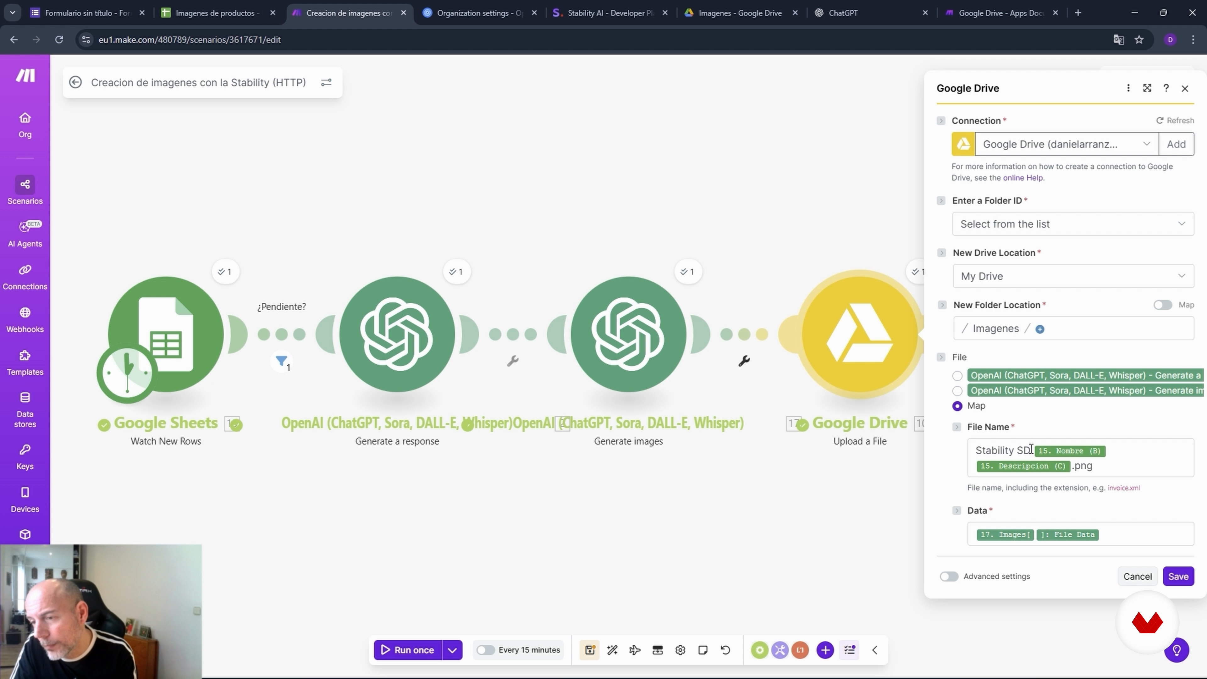 Bu video dersinde Daniel Arranz Molinero Domestika çevrimiçi kursunun bir parçası olan Make’te ChatGPT ile görsel oluşturmayı otomatikleştirme konusunu ele alıyor: Sayfadan Sanata: Excel ve Make ile Yapay Zekâdan Görseller Üret . Google Sheets, Make, ChatGPT, Stability AI ile ürün odaklı yapay zeka görsel üretimini otomatikleştir.