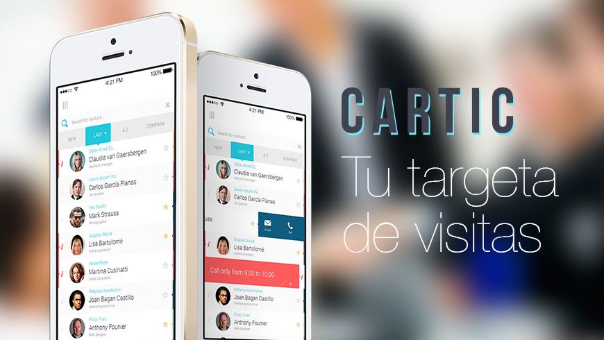 Cartic es una App concebida para sustituir las targetas de visita, por una simple y completa aplicación móvil. Una forma eficaz de organizar tus contactos e intercambiarlos de forma directa. Permite organizar todos tus contactos y acceder a ellos de una forma fácil y eficaz. Organízalos según tus necesidades, contacta con ellos de forma directa o adjunta notas a cada contacto como recordatorio. Personaliza tu perfil personal, con todos los datos profesionales. Compártelo con otros dispositivos mediante tecnología de proximidad NFC. Con un simple gesto intercambia los contactos profesionales. Rápido y fácil. Organiza tu calendario de contactos. Personaliza el tipo de acción: llamada, reunión, envío de email, etc. Y ya no te olvidarás. Accede a las estadísticas de cada contacto: cuantas veces le has llamado, cuantas reuniones has tenido con él, etc. Toda la información de tu actividad profesional con esa persona en un solo gesto.