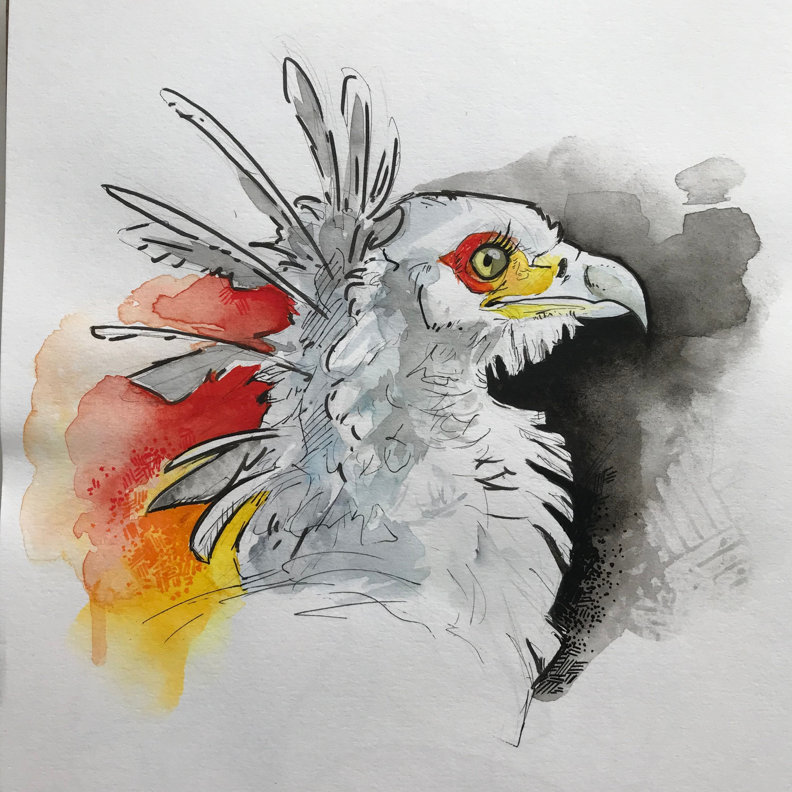 These are a series of tattoo designs I created using my watercolours. I aimed for a light wash so that the pages of my sketchbooks didn't warp too much. Enough to give a gentle splash of colour, especially for the doe and the crane. For my secretary bird, I decided that I needed a bit of extra colour to really make it pop so I used some red and orange marker pens to accentuate the bird.