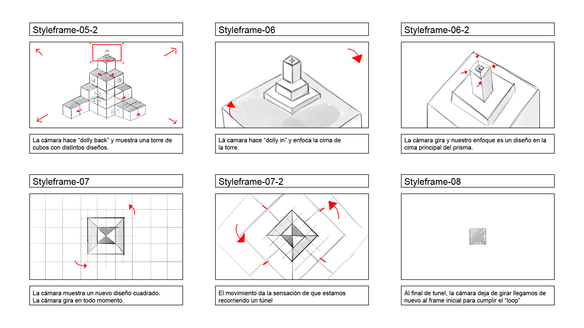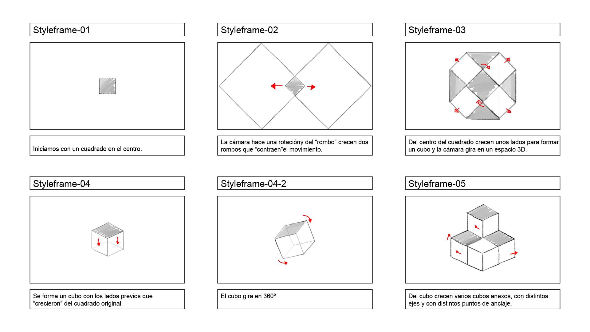 Primero, dibujé los "sketches" para el storyboard (ver imágenes). Usé unas flechas rojas para guiar al animador de cómo me gustarían las transiciones entre los styleframes.