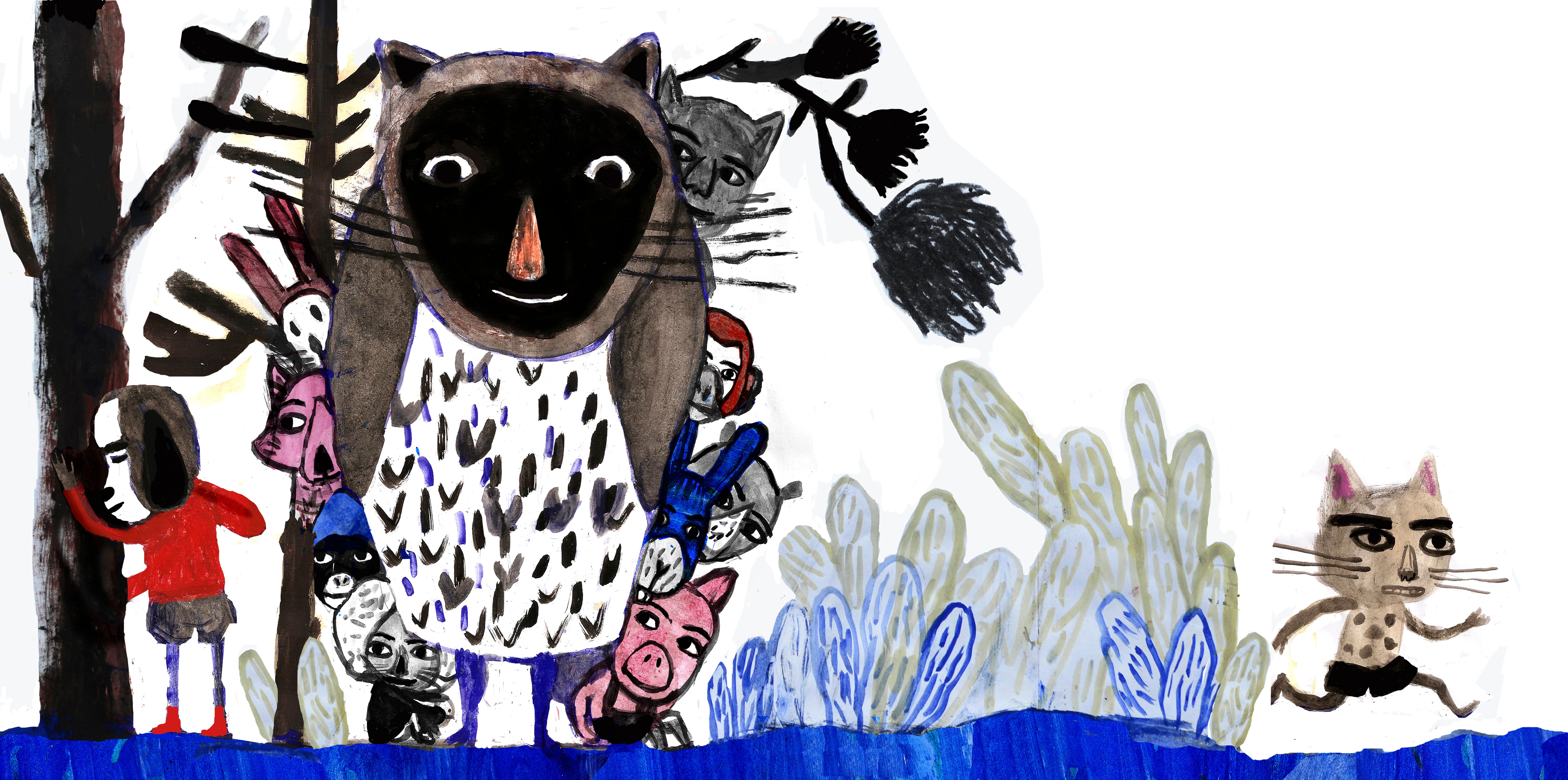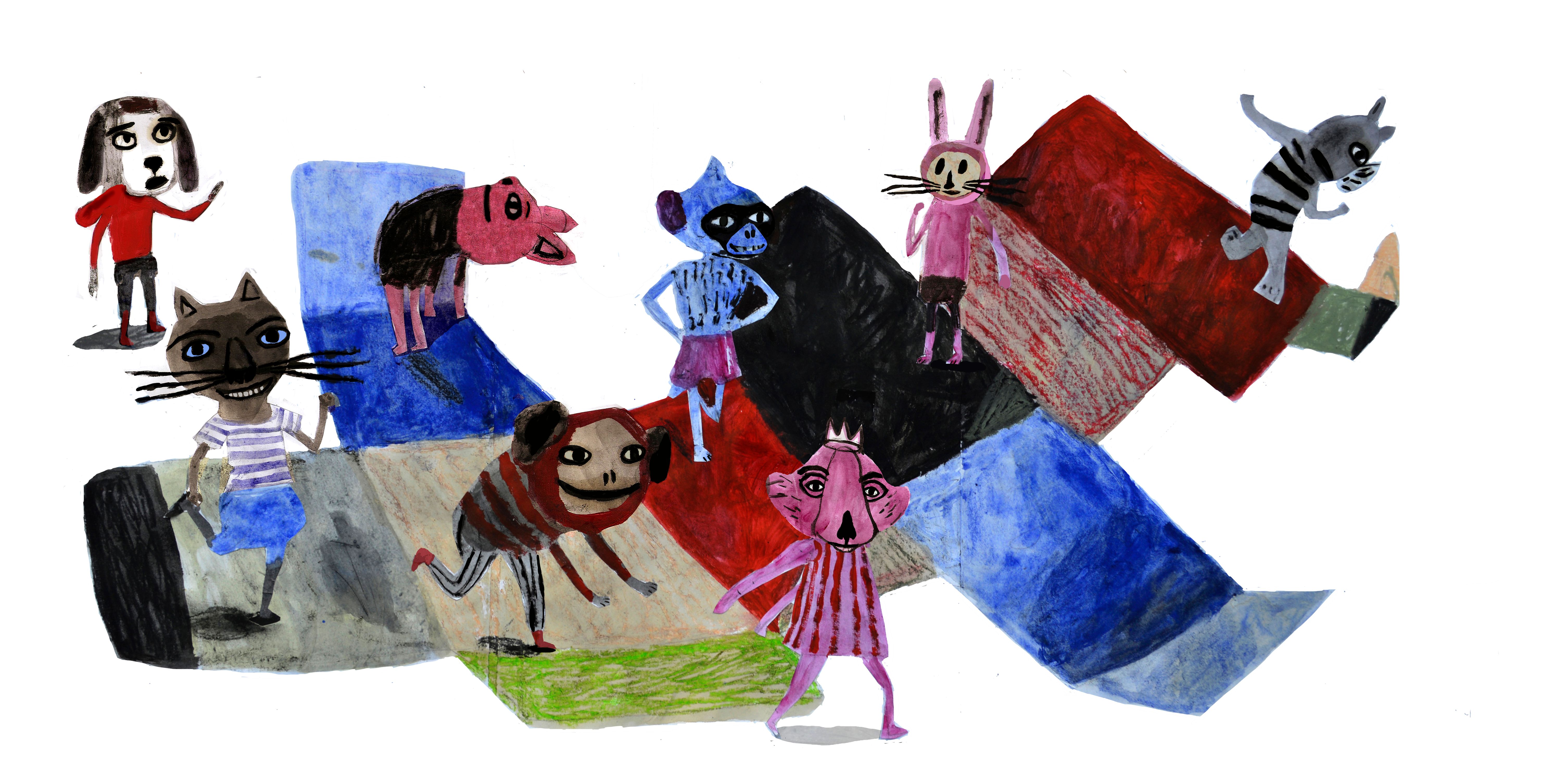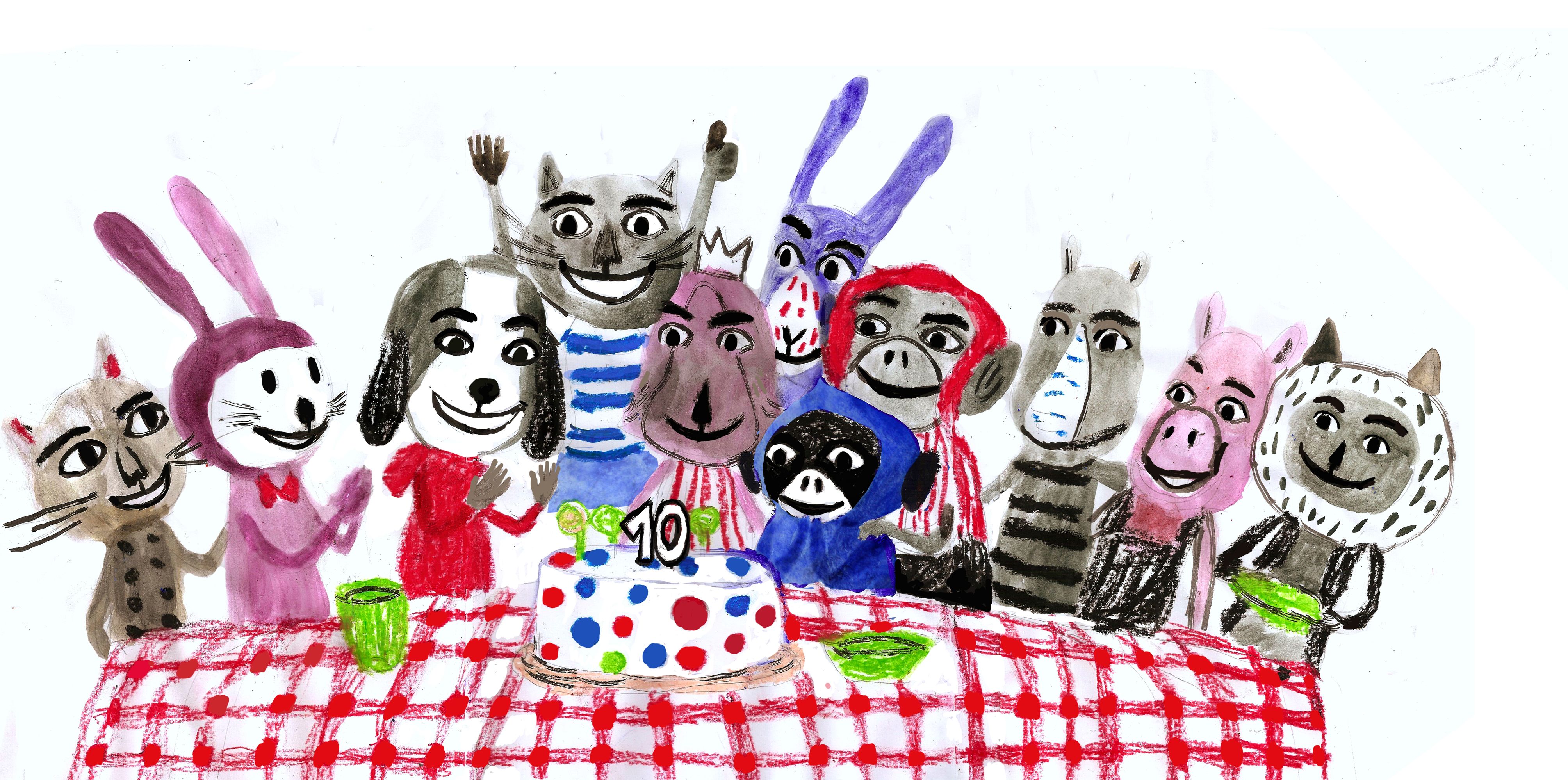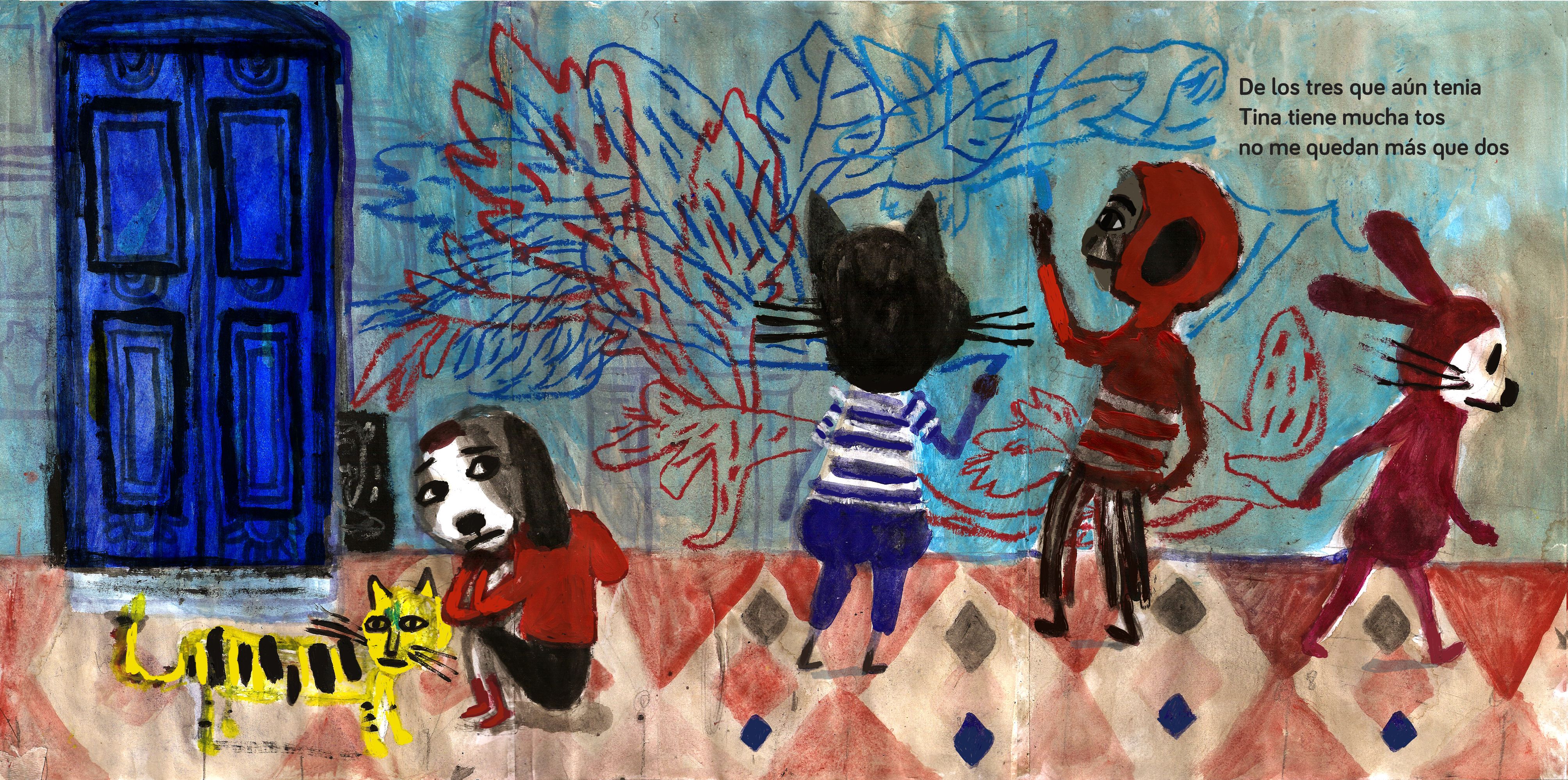 Este es un libro diferente a la canción infantil que estamos acostumbrados a escuchar. Quise aprovechar para crear a 10 personajes para estas ilustraciones y tomé algunas de mis creaciones de animales humanizados para esto. Cada doble página refleja un juego infantil que podrían hacer una pandilla de amigos al aire libre. La serie de juegos comienza con las escondidas, pasando por la rayuela, barquitos de papel. Lo curioso del libro es que he tenido que hacer un storyboard y apuntar allí muy bien cada nombre y saber que amigo se iba de la escena, pues a veces, emocionado con dibujar, volvía a colocar personajes que ya se habían ido del cuento.