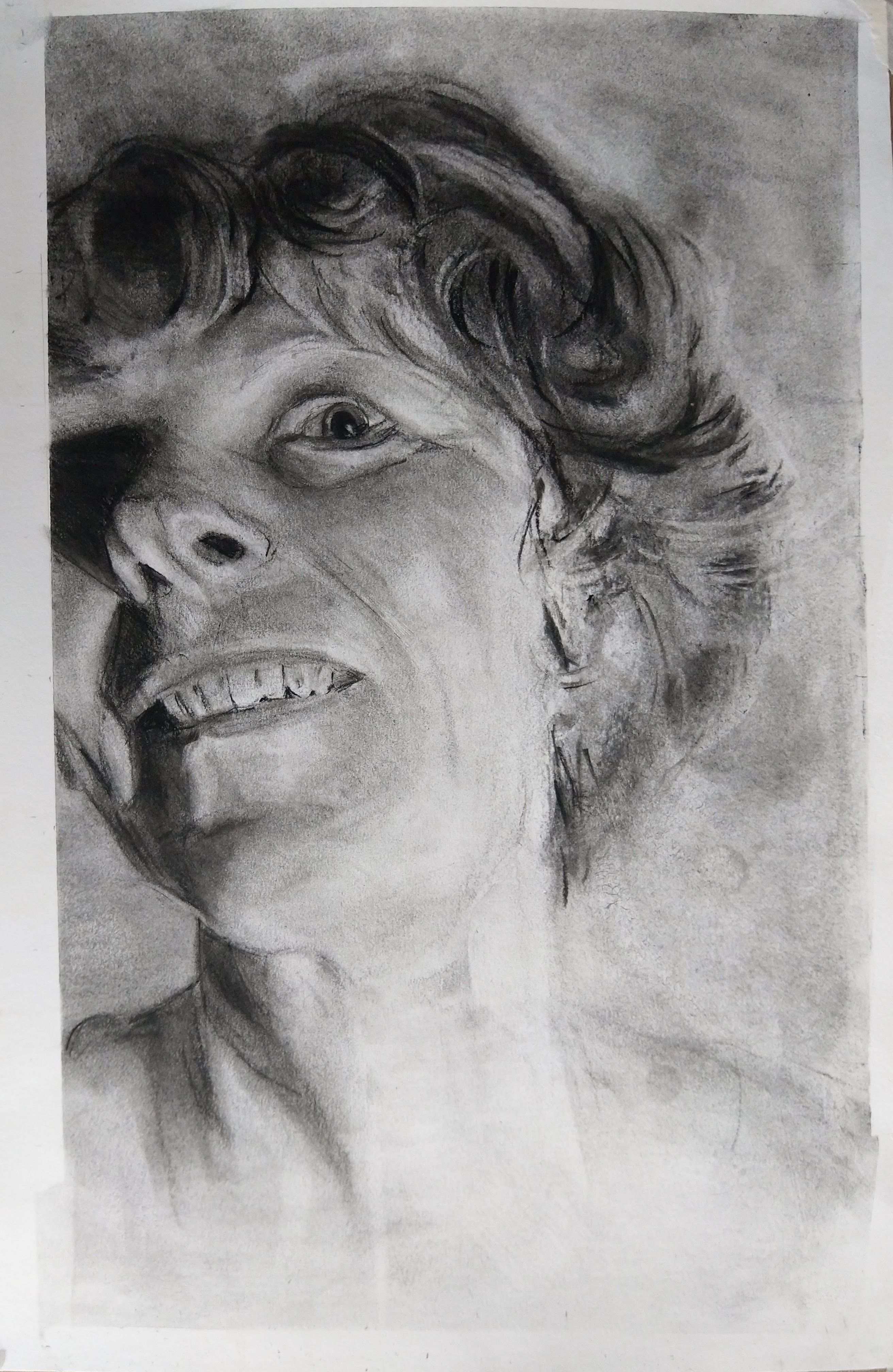 Extra attention was given to the right eye and on the hair vanishing in the background. I want to make a second charcoal drawing from the range of photos. May be combining charcoal and water color. Any suggestions for the photo and the composition?