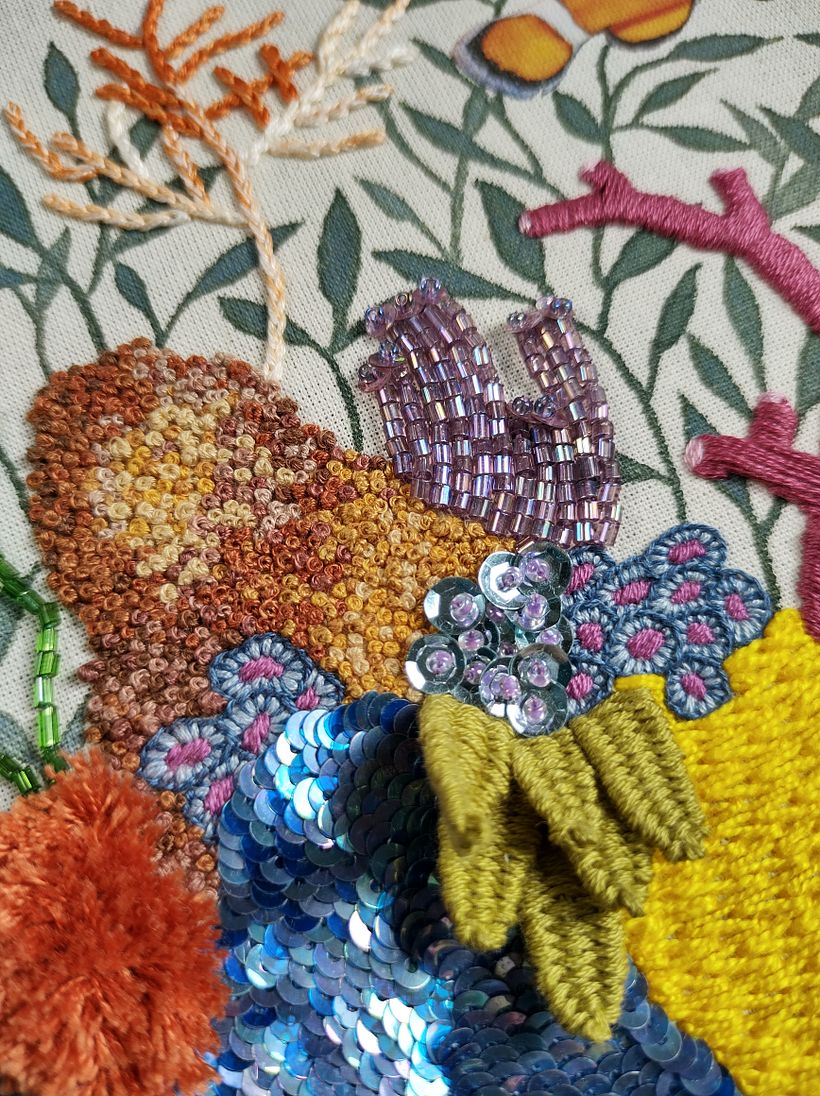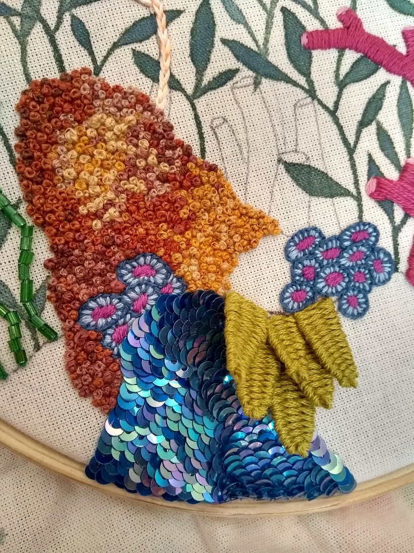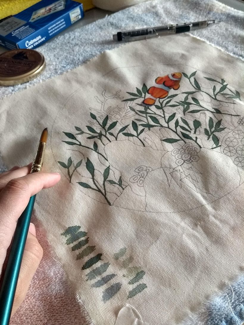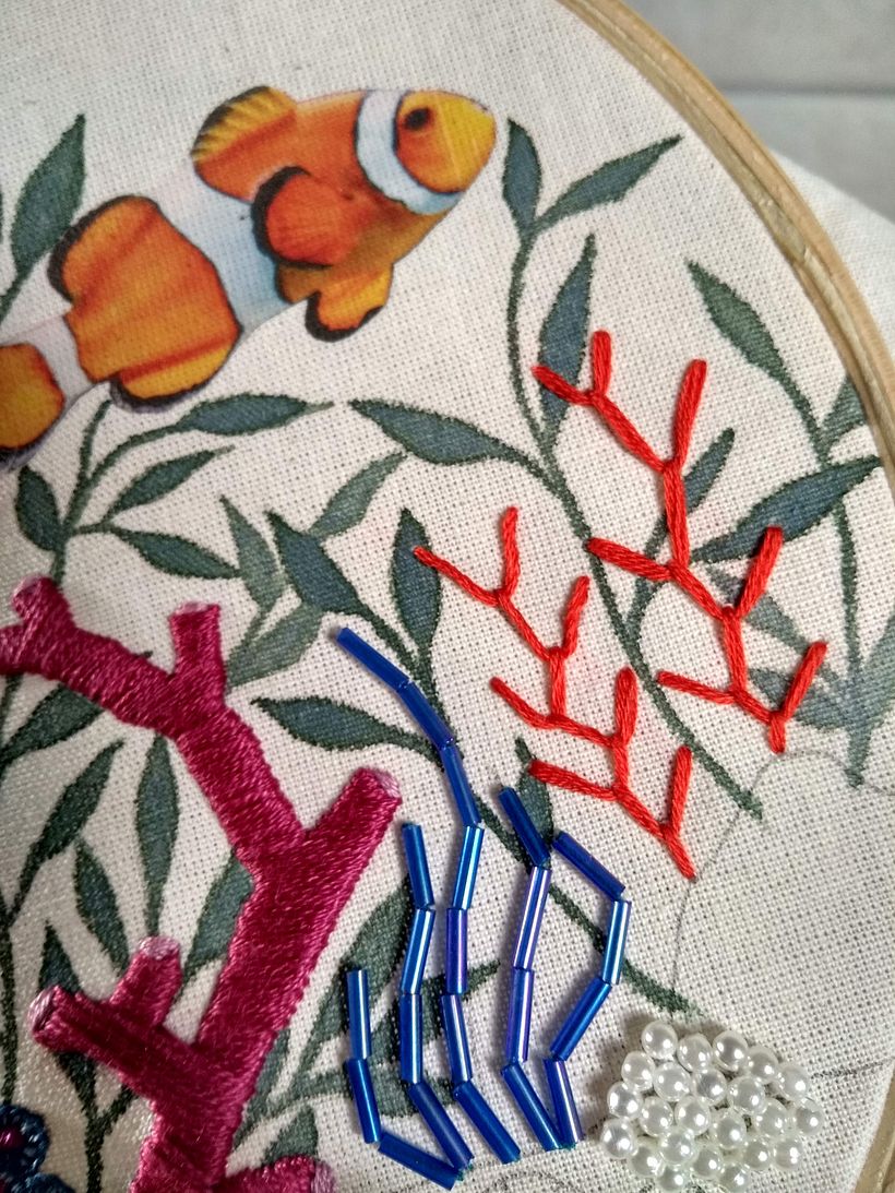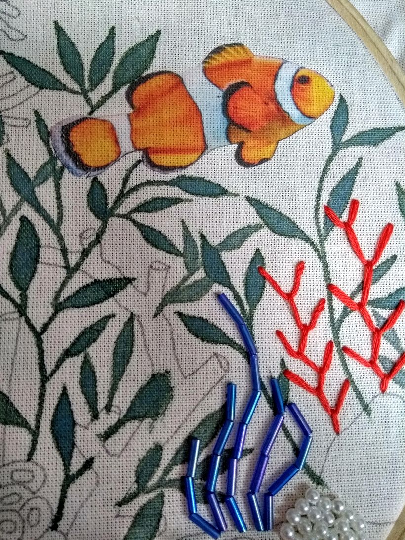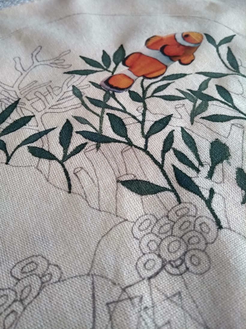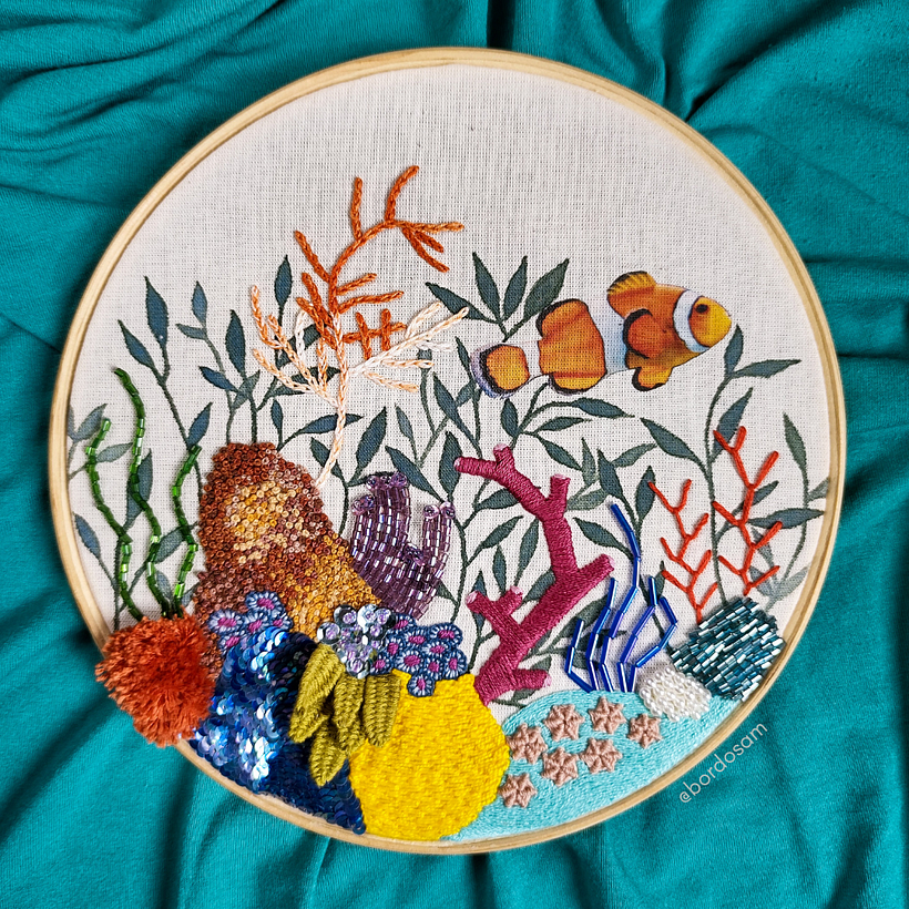No meu projeto final, escolhi mostrar um aquário, com um pouco da biodiversidade dos oceanos, muitas cores e texturas e destaque pra o peixinho-palhaço. Utilizei técnicas de aquarela, fotografia e bordado com linhas e pedrarias. Todo esse conjunto de técnicas colaborou para que eu tivesse o efeito final desejado.