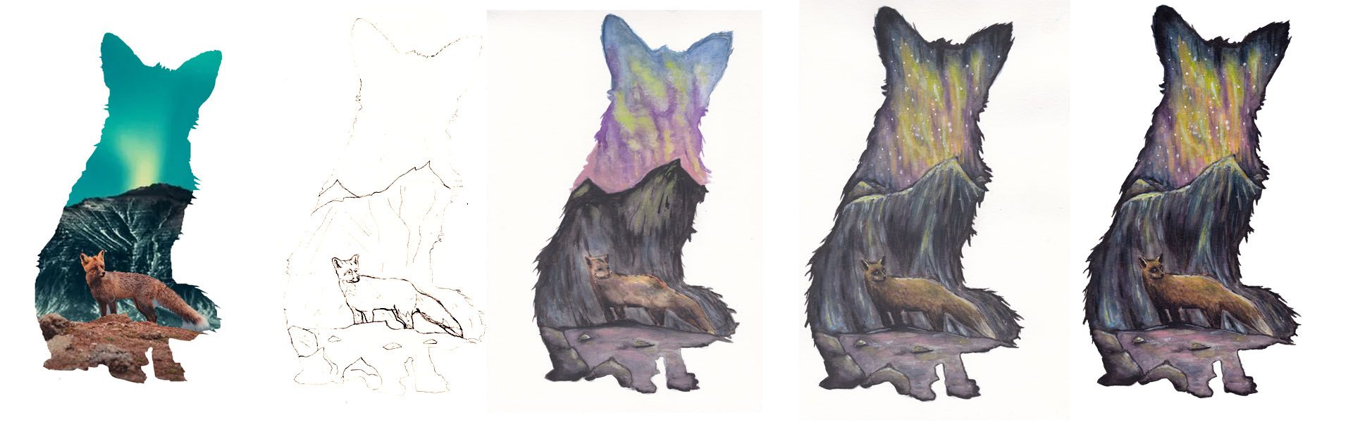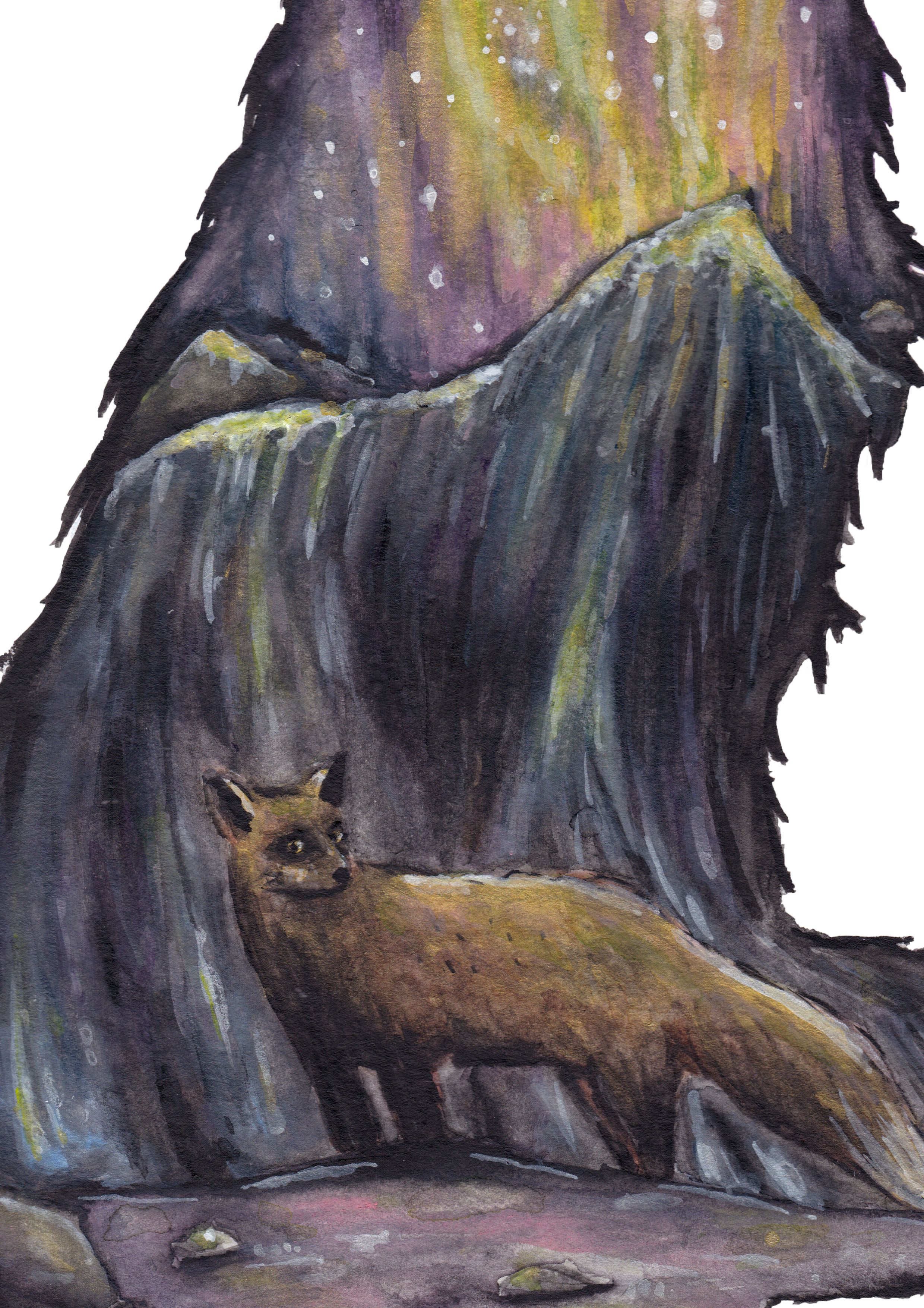 Thank you so much for posting this wonderful result as well as your steps to get there! First of all, I think you did a great job with a lot of the small details – I just love the expression on the foxes face and the creative structures in the background. One thing you could try to achieve more of a 'watercolour' look is not to use any white paint (even if it is Watercolor paint) at all. One of the most basic principles in watercolour is that you achieve lighter areas by not using any paint in these areas and letting the white of the paper shine through. I know that this takes a lot of time to get used to – I've also used a lot of white and also acrylic colours (and even coloured pencils) in my first watercolour paintings because I couldn't achieve the look I wanted with just watercolour.