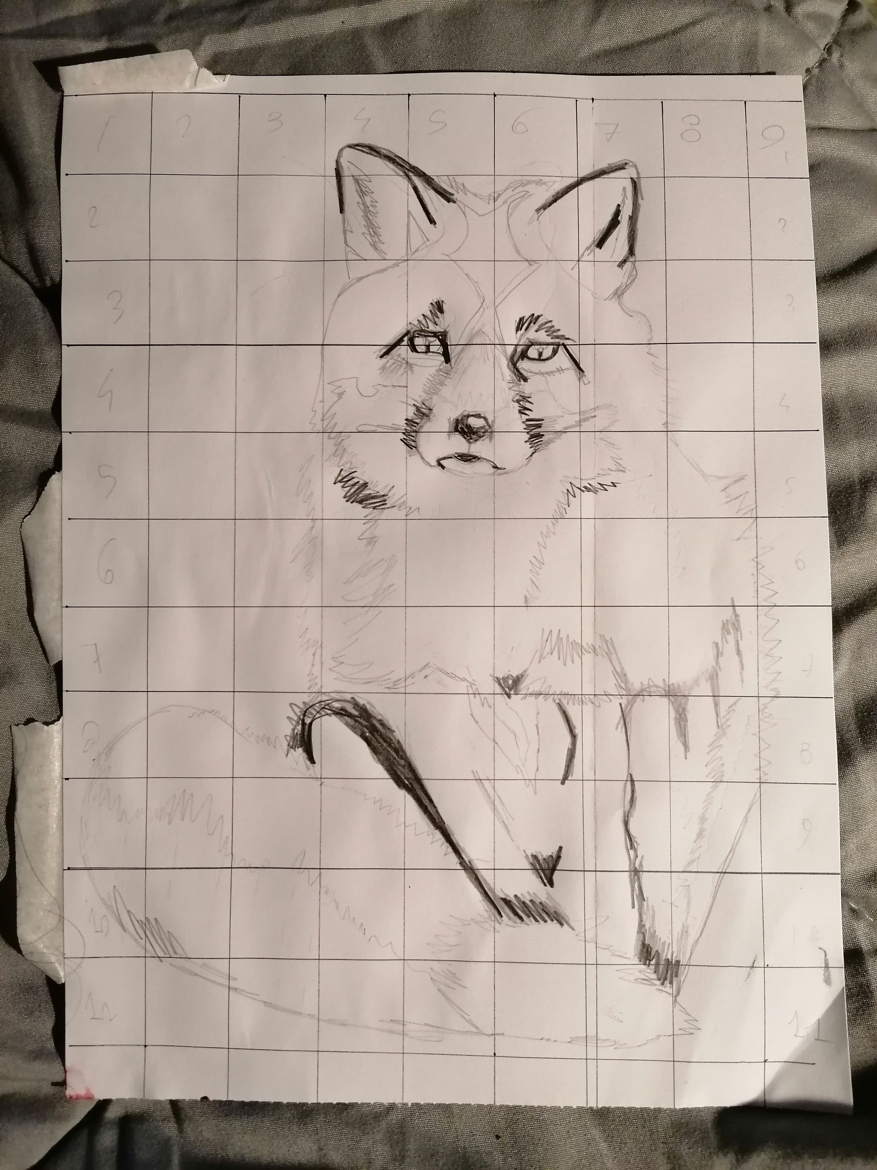 Nel progetto finale ho prima effettuato un veloce bozzetto per capire quali colori avrei potuto utilizzare. Ho eseguito poi il disegno a matita usando il metodo della griglia, pochi tratti di riferimento principali. Ho trasferito il disegno sulla carta da acquerello con la lavagna luminosa. Dopo il primo lavaggio mi sono allontanata dal riferimento e ho accumulato molti errori e più andavo avanti più la situazione peggiorava.
