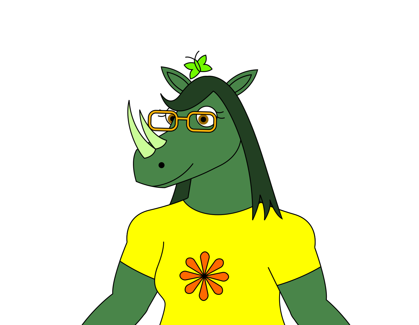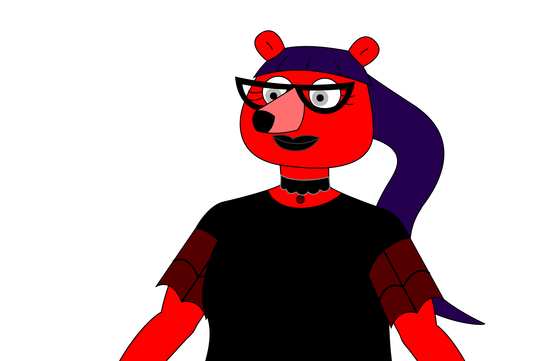 April 2022. Three girls in their twenties are sitting in the living room, eating from a plate of cookies while watching various online videos on a widescreen television. Two of them, a purple anthropomorphic raccoon and a red anthropomorphic bear, are sitting on the couch with some distance between them. The third one, a green anthropomorphic rhinoceros, is sitting on the floor near the couch. The raccoon has brown hair tied in a high ponytail, with side swept bangs and turquoise eyes. Despite her age, she wears a blue middy blouse and a matching pleated skirt, with a purple tank top, shorts, and socks underneath. The bear, much wider and taller than the raccoon, has purple hair styled in a low ponytail with straight bangs. In front of her gray eyes are a pair of glasses with thick, black frames. Favoring a darker fashion sense, her lipstick, choker, and dress are also black, though the sleeves of her dress are maroon and made to resemble spider webs. The rhinoceros wears her green hair loose with side swept bangs and a chartreuse butterfly barrette. She has brown eyes and wears rectangular glasses with golden yellow frames. In contrast with the other two girls, she wears a yellow t-shirt with an orange flower graphic and green shorts. A bloodstone is embedded in her right hand.