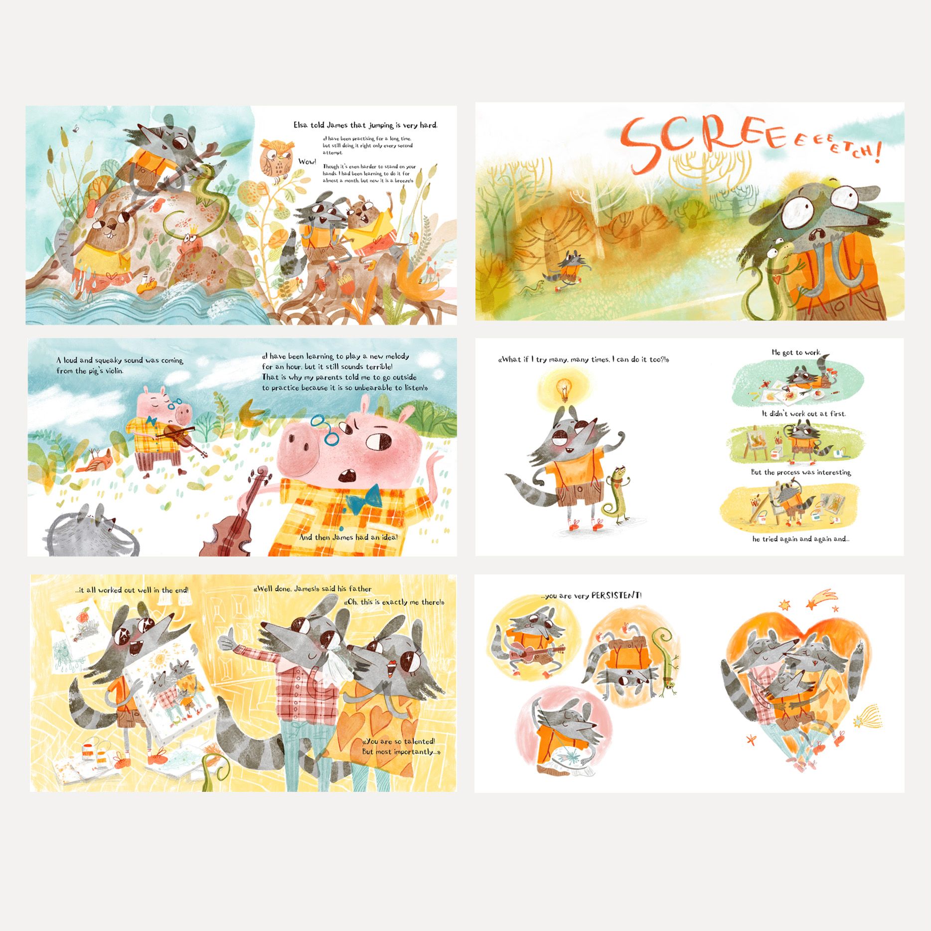 I want the story to evoke positive emotions, so the raccoon looks caricatured. Perhaps, children will see themselves in it and have a little laugh at their desire to do everything straightforwardly.