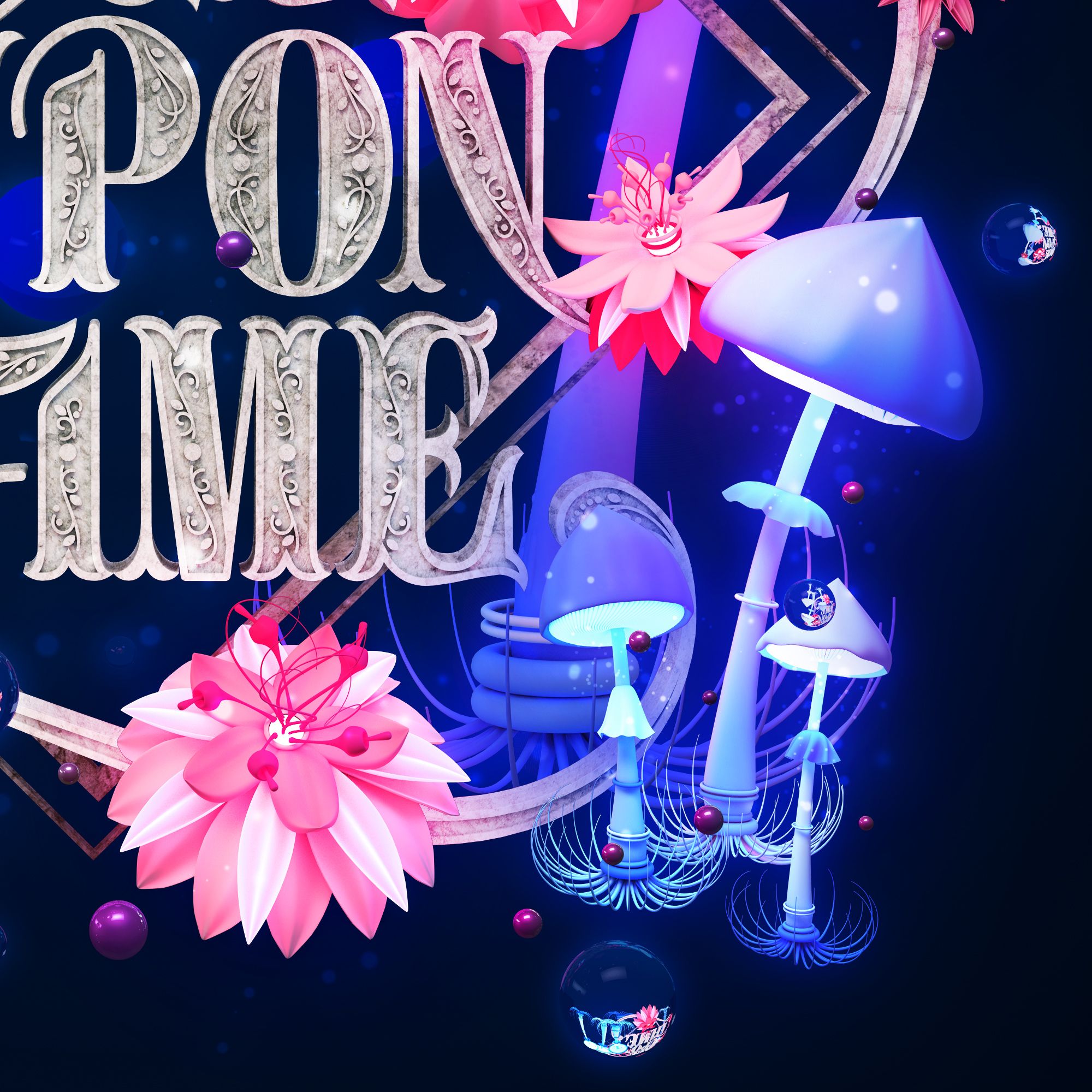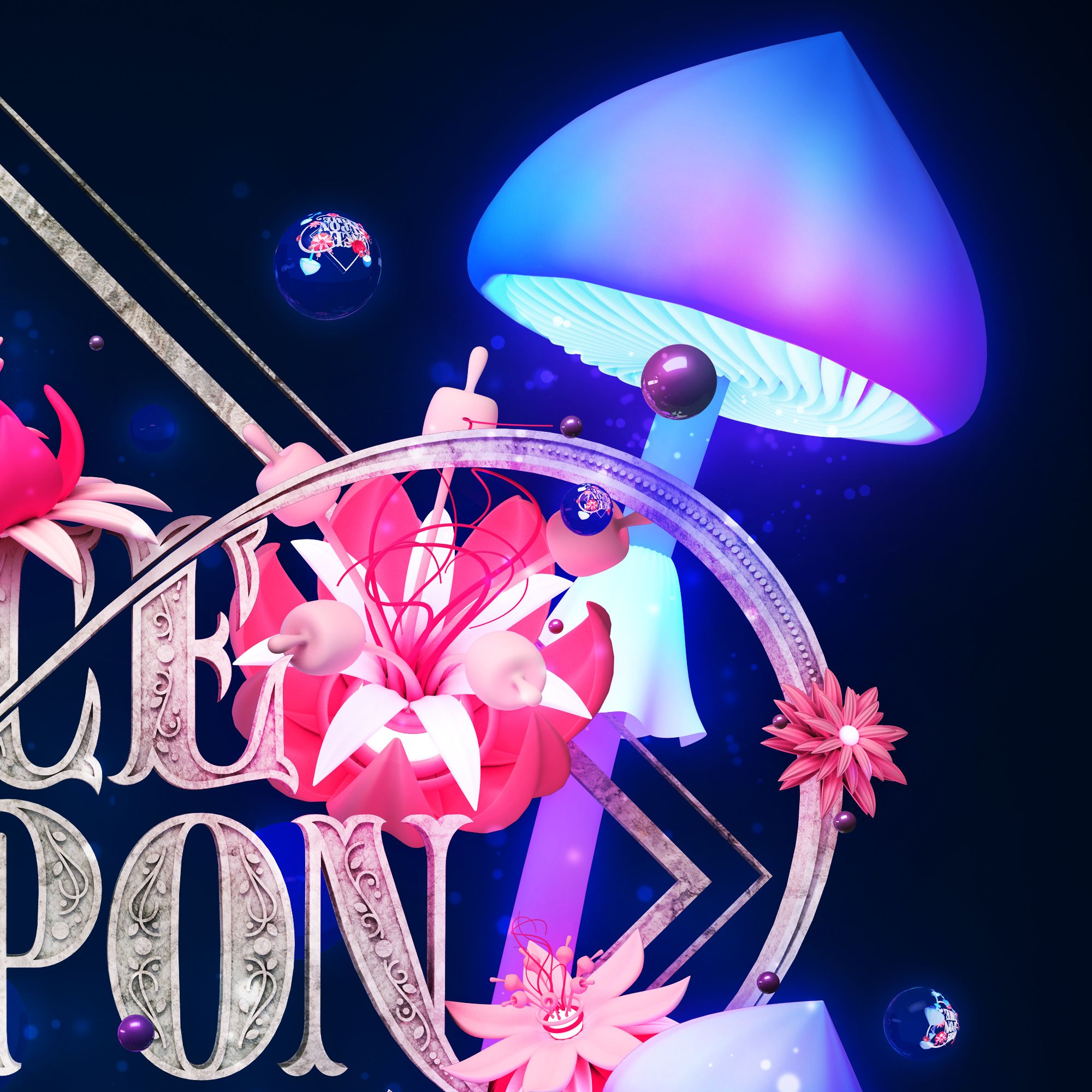 Once Upon a Time is a project that visually represents the magic and whimsical feeling of fairy tales and fantasy stories. The title itself eludes to the characteristic start of oral storytelling. I wanted to create a piece that reinforced that idea via the lettering choice, the material treatment, and the illustrative elements that complete the composition. Surreal flowers and luminescent mushrooms, on a night-inspired color palette, bring the piece to the world of folk tales.
