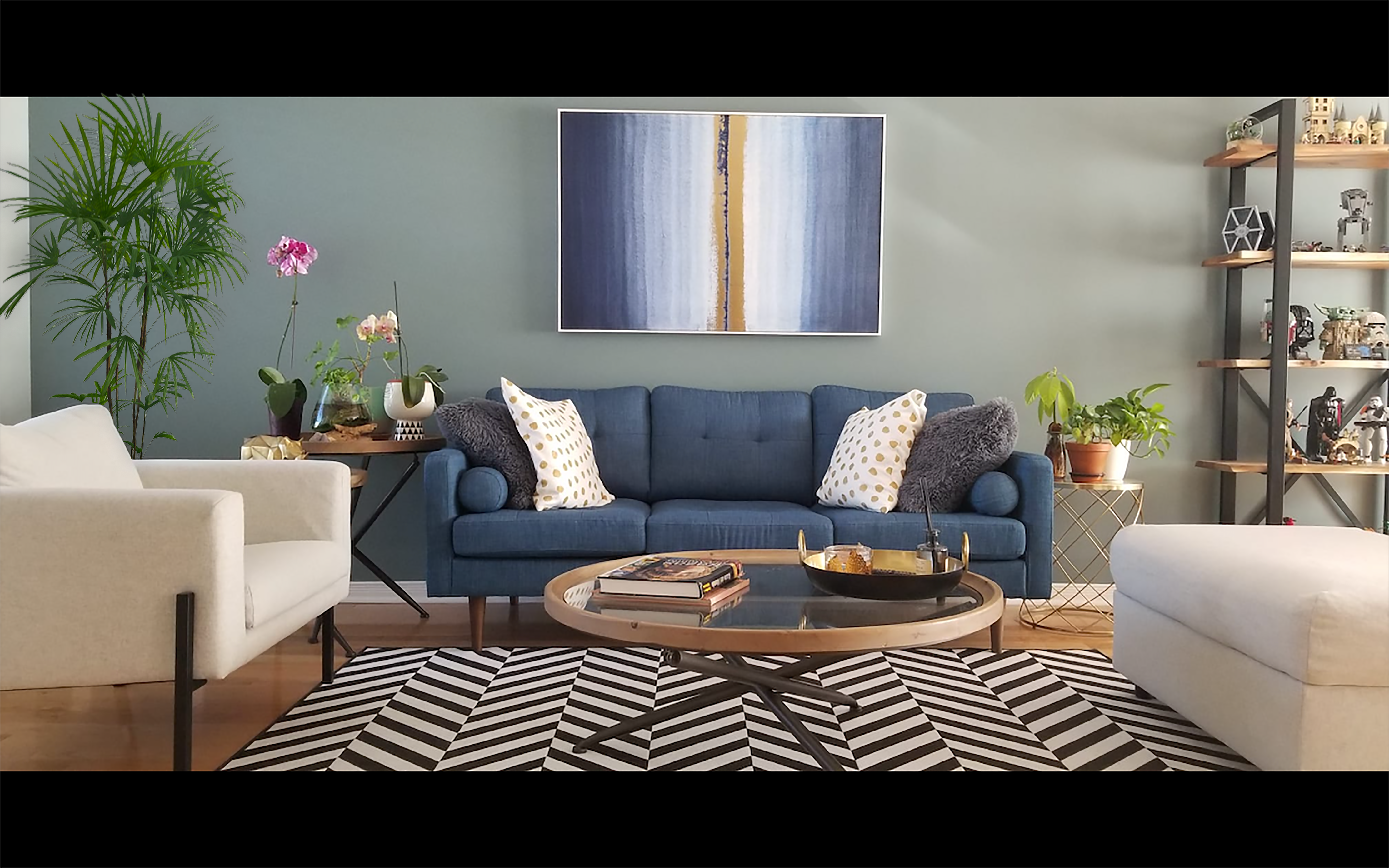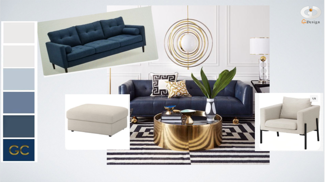 Middle-aged couple who delivered their newly purchased house and did not know how to give their living room a touch of personality so that it would have the effect of -Wowww-, and out of hand with the style of both. The idea was based on the dream blue sofa and the purchase of accessories, furniture and art that went with it. They wanted to preserve the color of the walls and followed the guidelines of the consultancy in 90%.