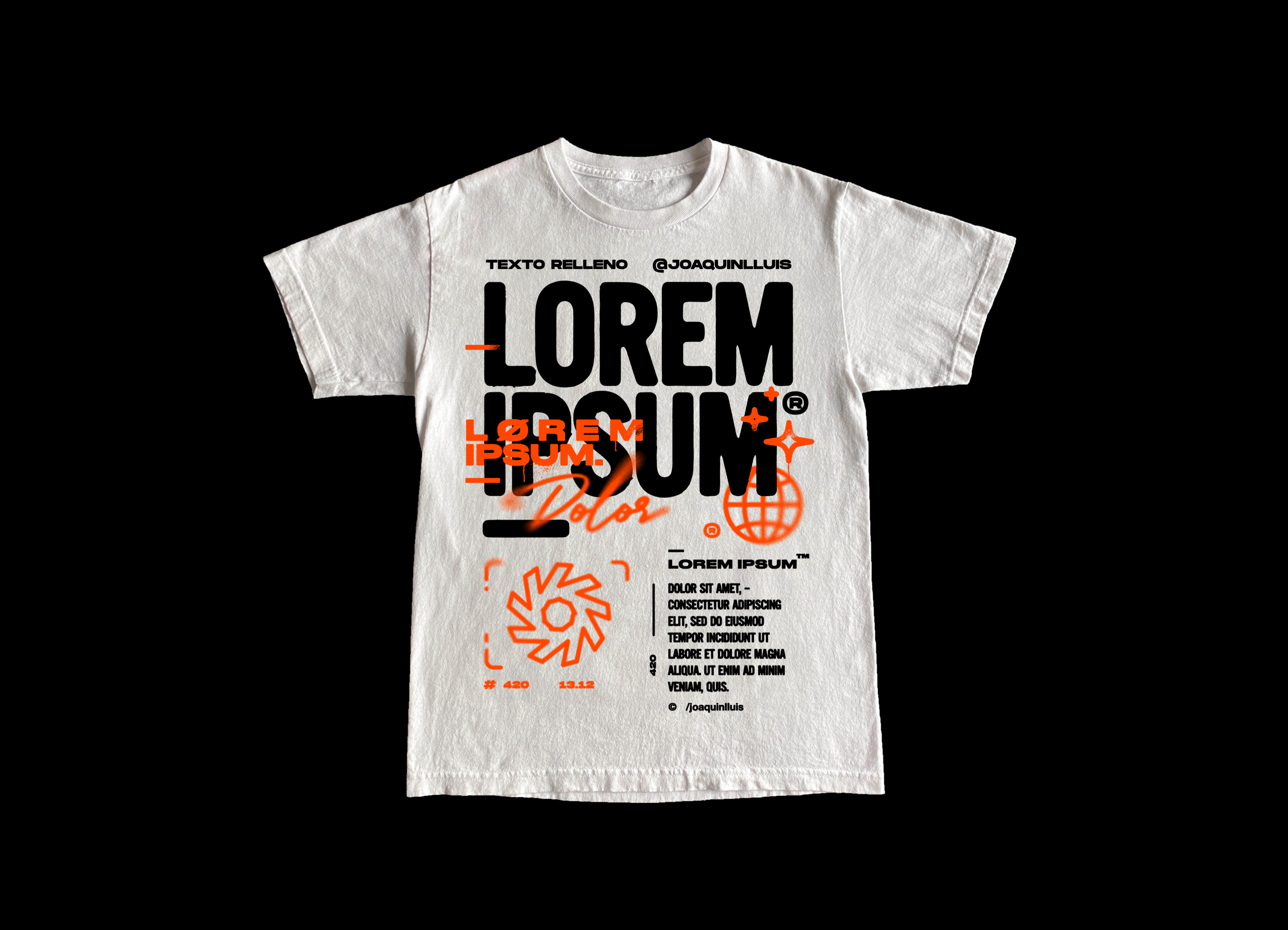Un proyecto relacionado al otro proyecto de lorem ipsum. Este fue el primer intento de componer una remera con lo que conocemos como "texto de relleno" o "contenido genérico" aludiendo mucho más a la forma visual de la remera que al contenido de la misma, pero también generando un chiste para personas diseñadoras que conozcan el uso de este "texto de relleno".