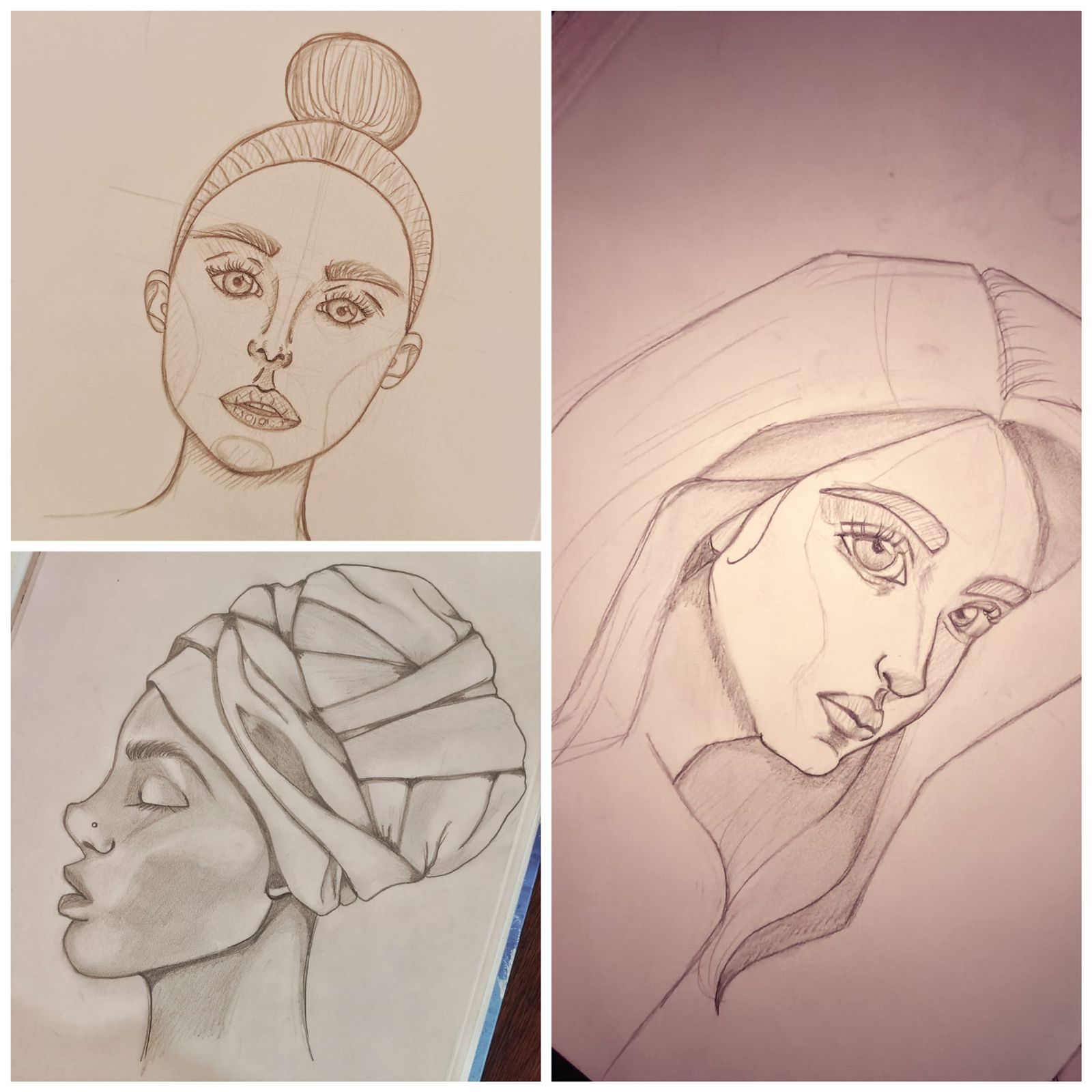 Well done! I like the geometrical forms and stylization of your drawings! 👏 I like the fabric folds in the profile view. It's a very good shading practice to draw such forms. The 3/4 is wonderful and has a beautiful expression. In the front view I think you can try to make the hairline around her forehead a bit lighter. Now the line is very strong and thick. With some breaks it would look more natural. You can try if you want 😊