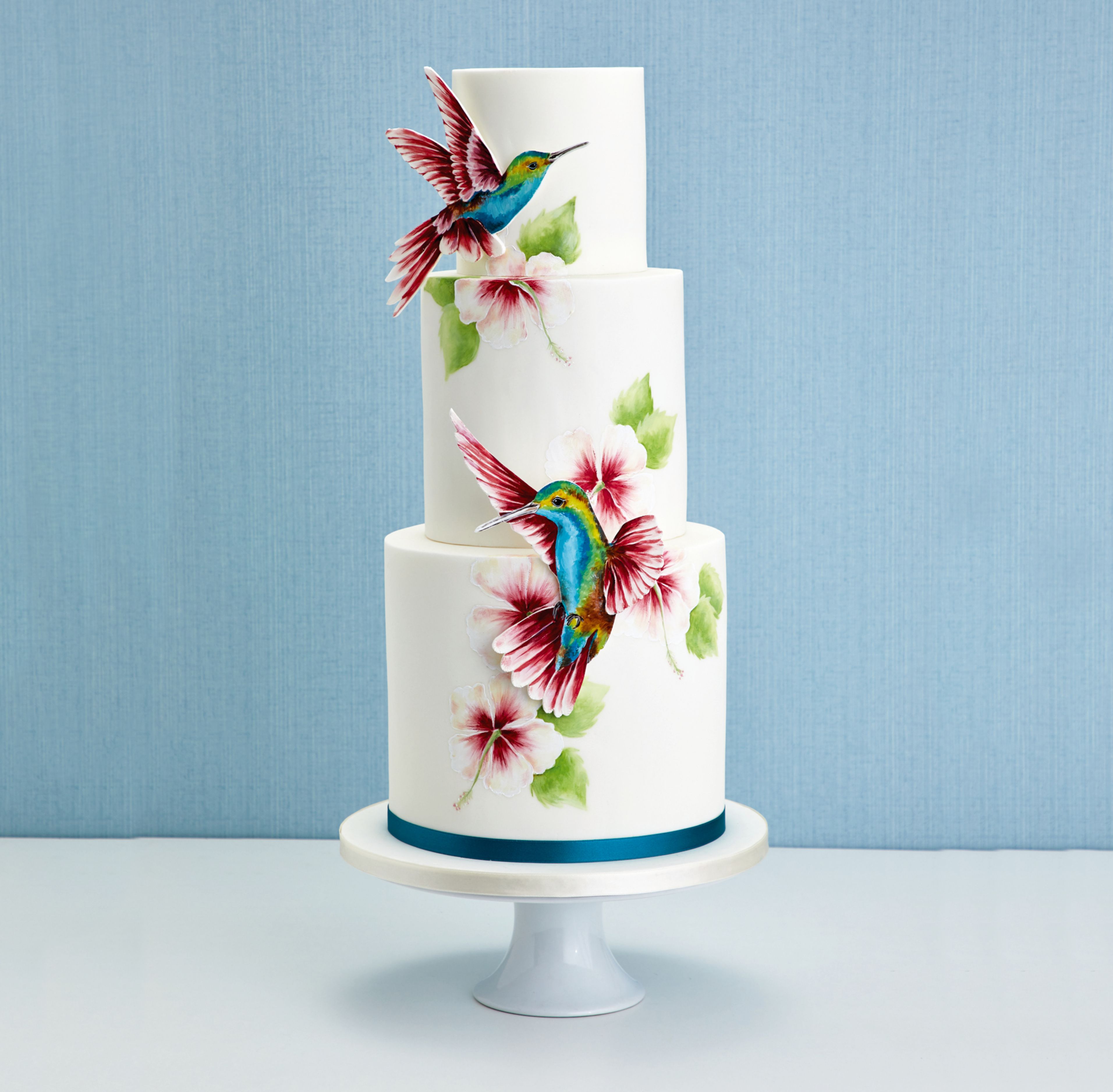 This cake features 2D cutout hummingbirds alongside the painted flowers - There are cut from floral paste and painted flat and stuck onto the cake when set - they add a lovely textural element in addition to the flat painting.