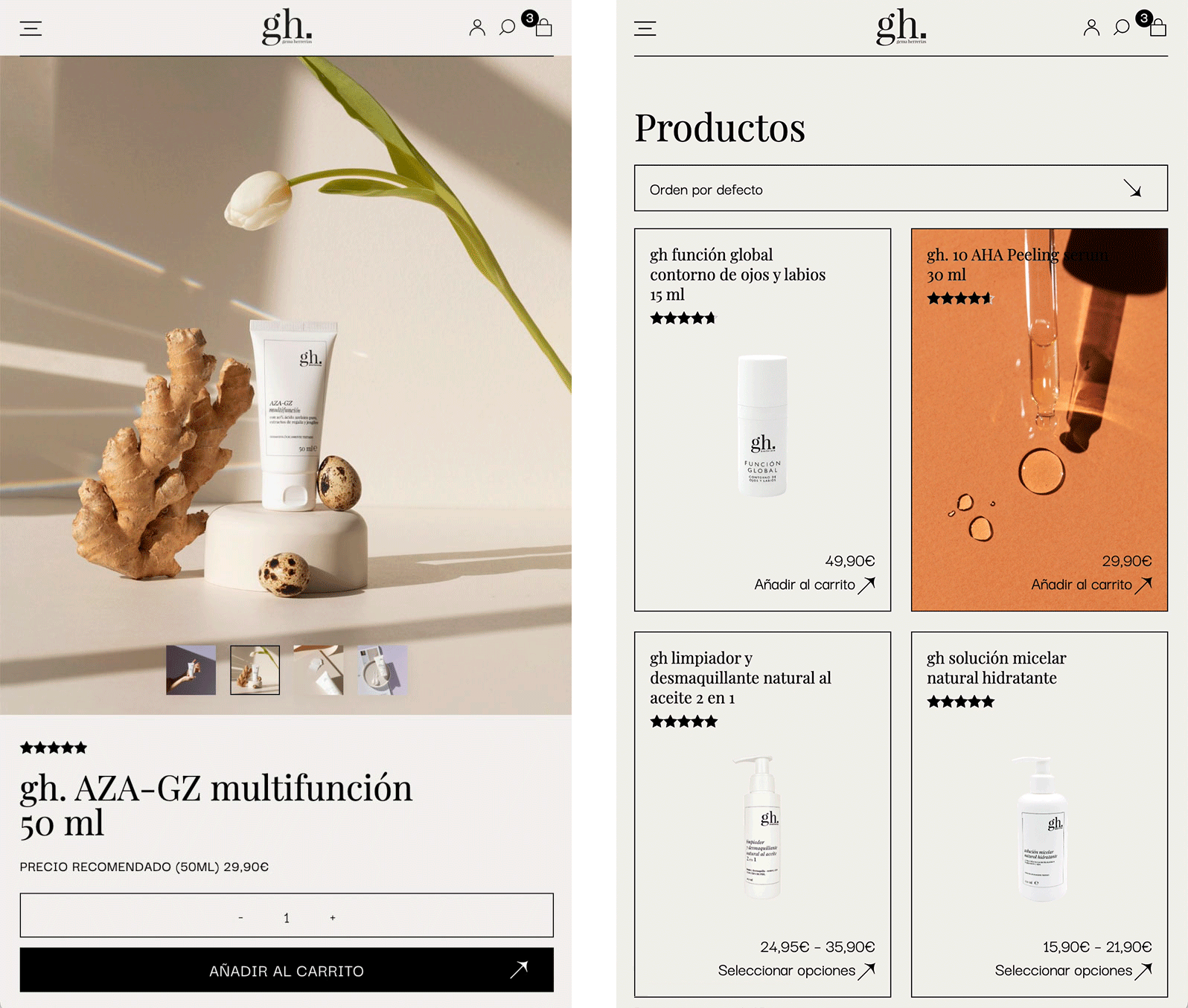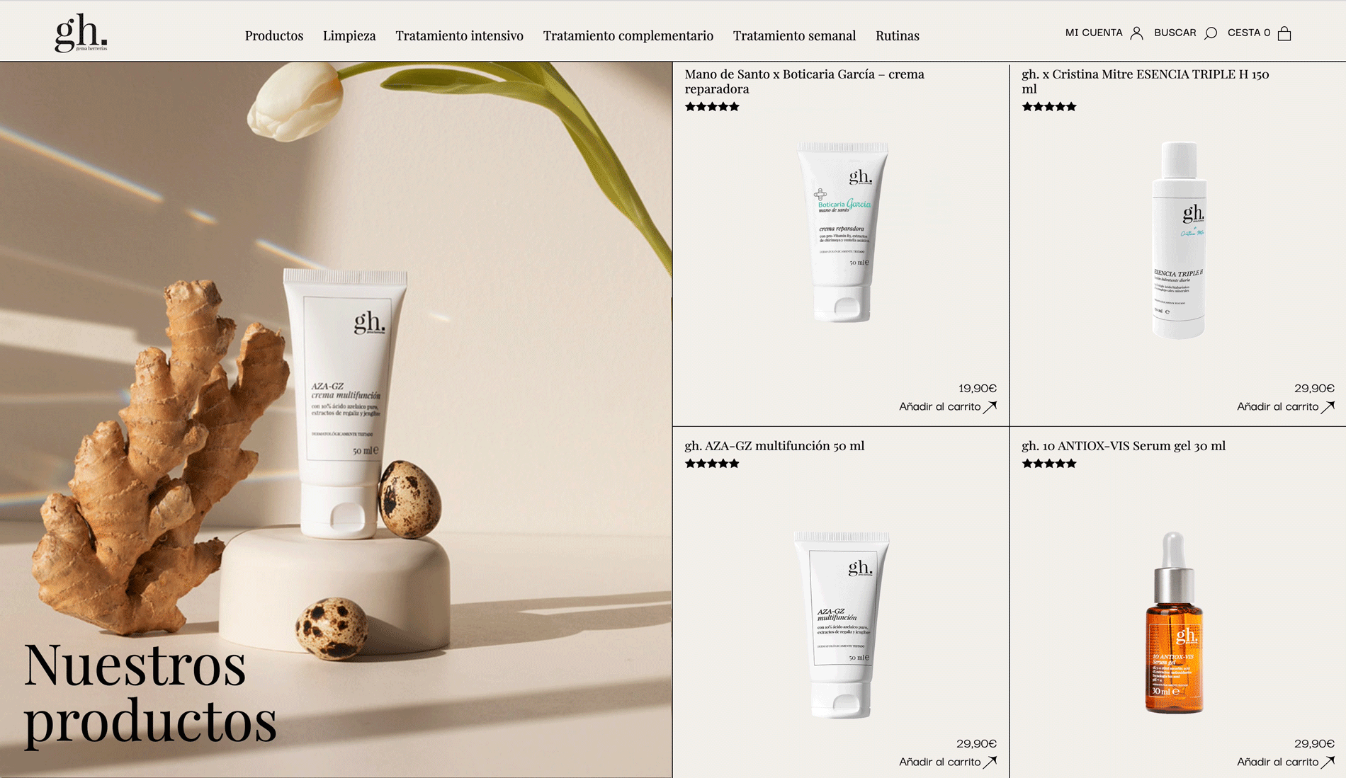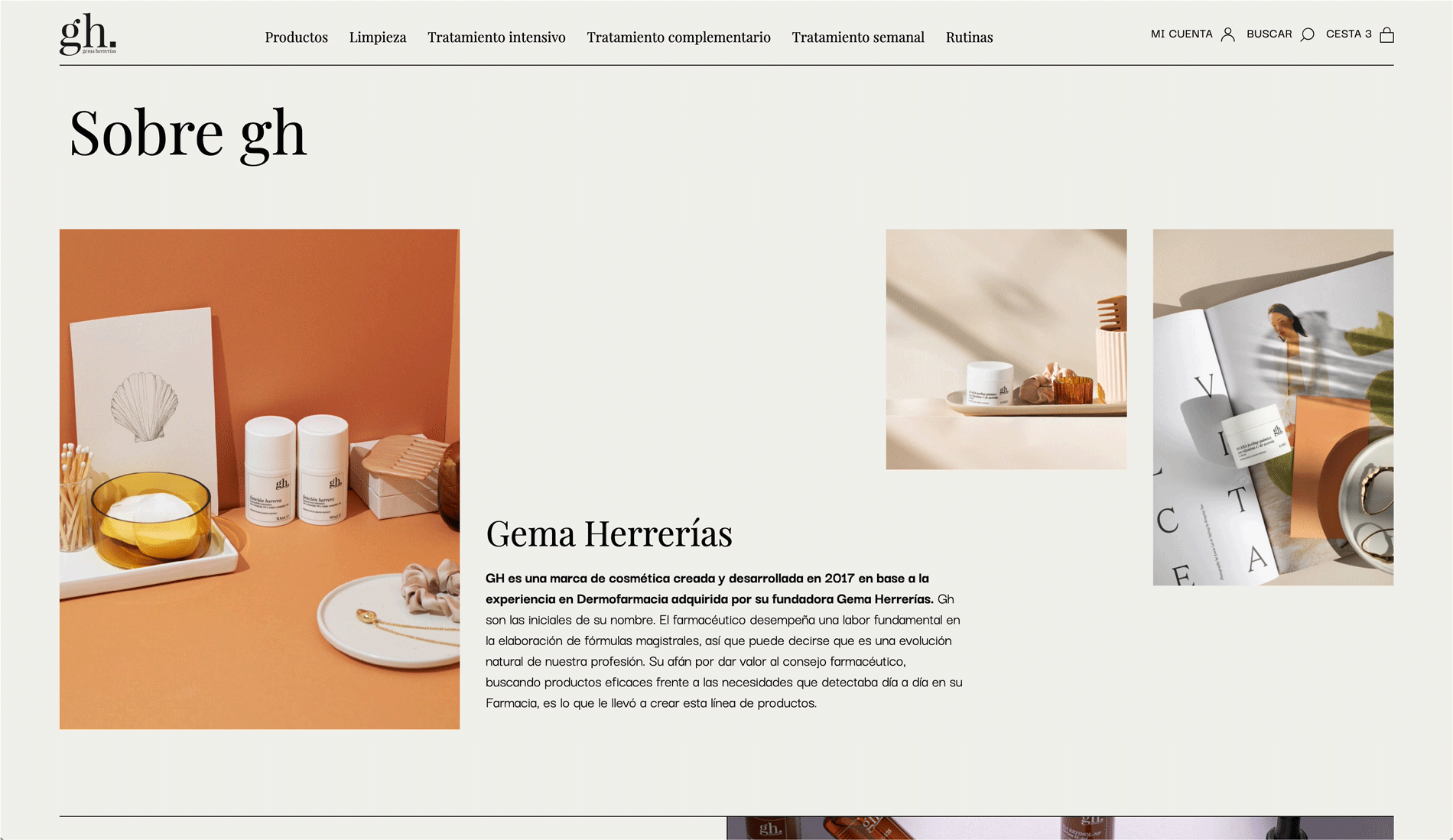 Lo cierto es que cuando ya has diseñado un montón de webs de cosmética conoces súper bien las necesidades de estos clientes, y podrías crear sus webs con los ojos cerrado. Pero con la web de GH queríamos y NECESITÁBAMOS ir más allá y no diseñar la típica web de dermocosmética. Por eso tuvimos claro desde el principio que nos íbamos a alejar del estilo, paleta de colores, estructuras y funcionamiento clásicos de este tipo de sitios webs.