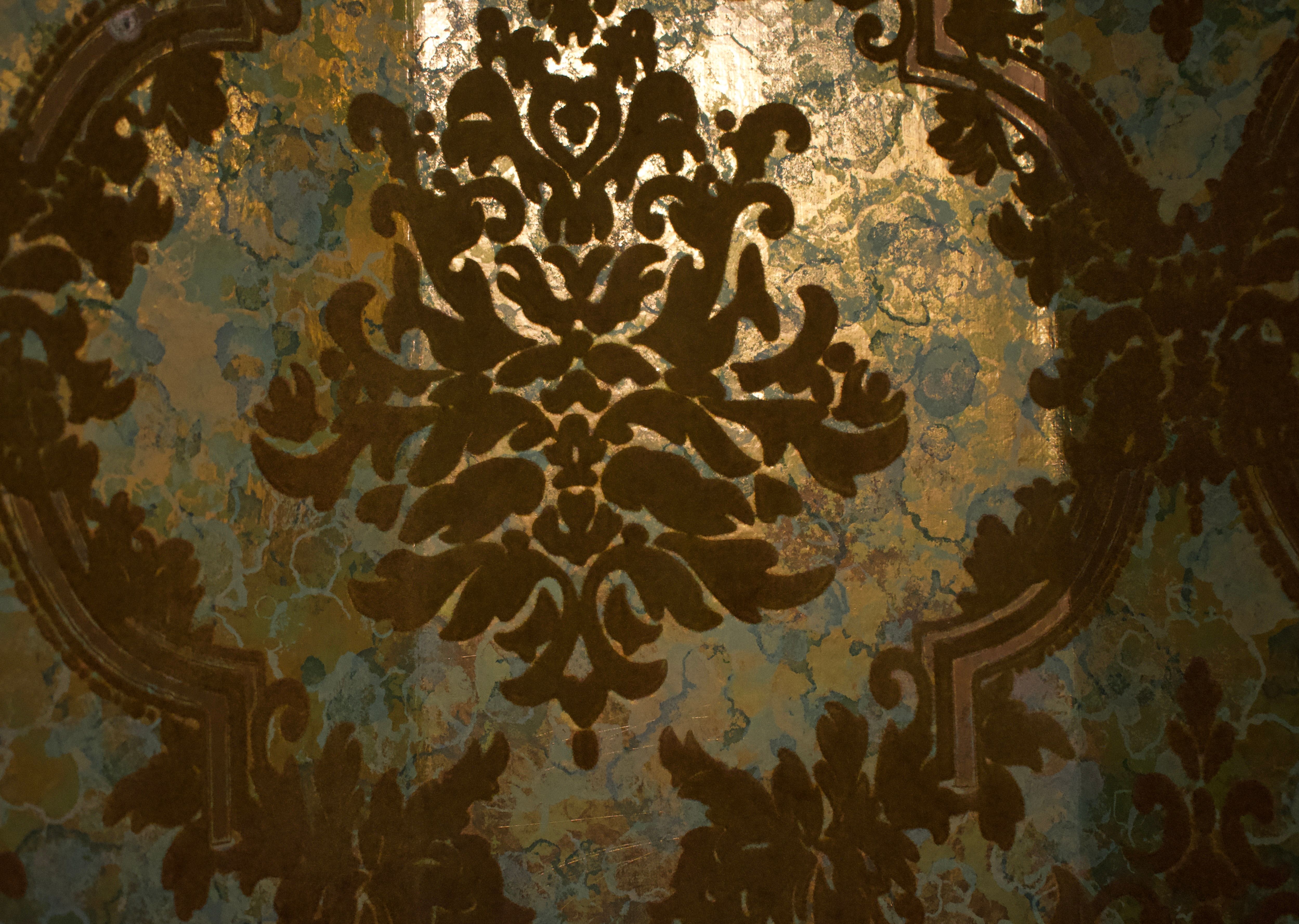 1. Este papel tapiz cubre cada rinconcito del baño y tiene tantos detalles y matices que captarlos todos en 5 fotos era imposible. Es por eso que escogí capturar el brillo que refleja el recubrimiento dorado que tiene y que aparece como verde asulozo cuando no le pega la luz. Ese brillo dorado me transporta a otros lugares y otros tiempos.