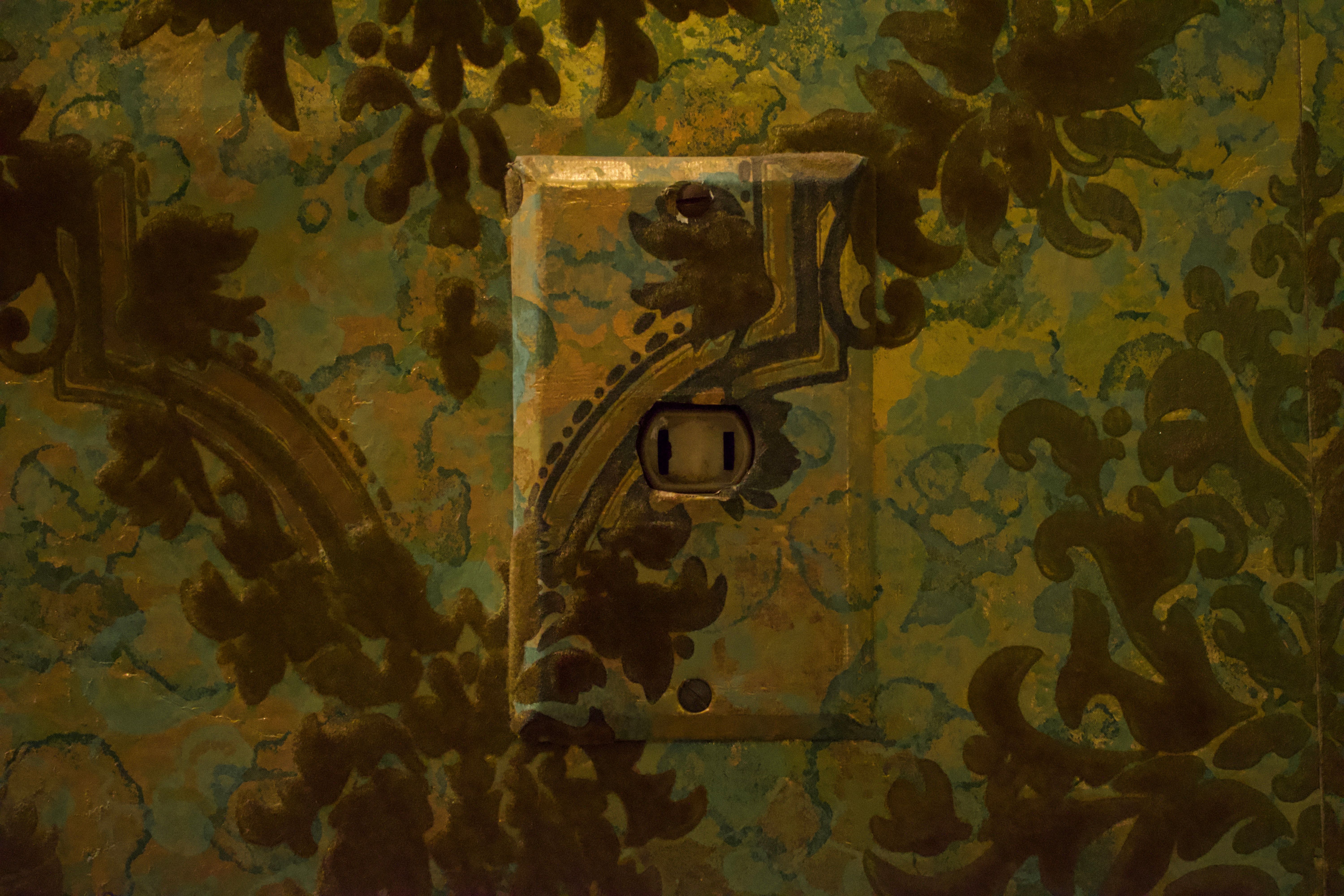 3. Este enchufe está al lado del escusado, un lugar que me parece muy extraño para ponerlo. Además, me pareció que se ve degastado y amarillento al tiempo que absore la belleza del diseño del papel tapiz. Además, me gusta que el papel tapiz de aquí se ve diferente al de la primera foto justamente por como aquí la luz le pega distinto.