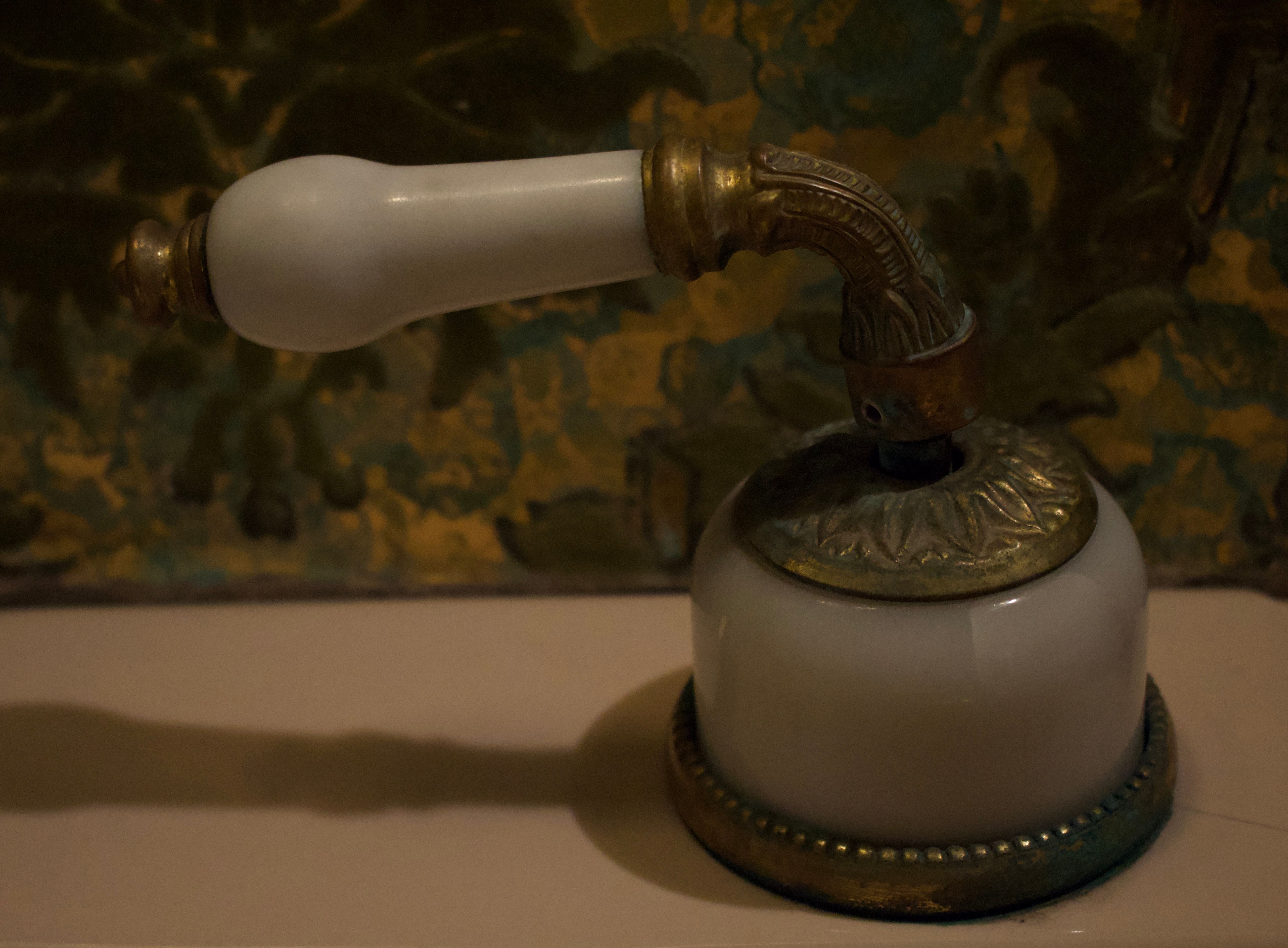 4. Esta es una de las llaves del lavabo. Me encantan los detalles que tiene y cómo hace un juego perfecto con el tapiz, pues el tiempo que ha pasado por la llave le ha dado unos toques azulosos al dorado que hace que combine muy bien con las paredes.