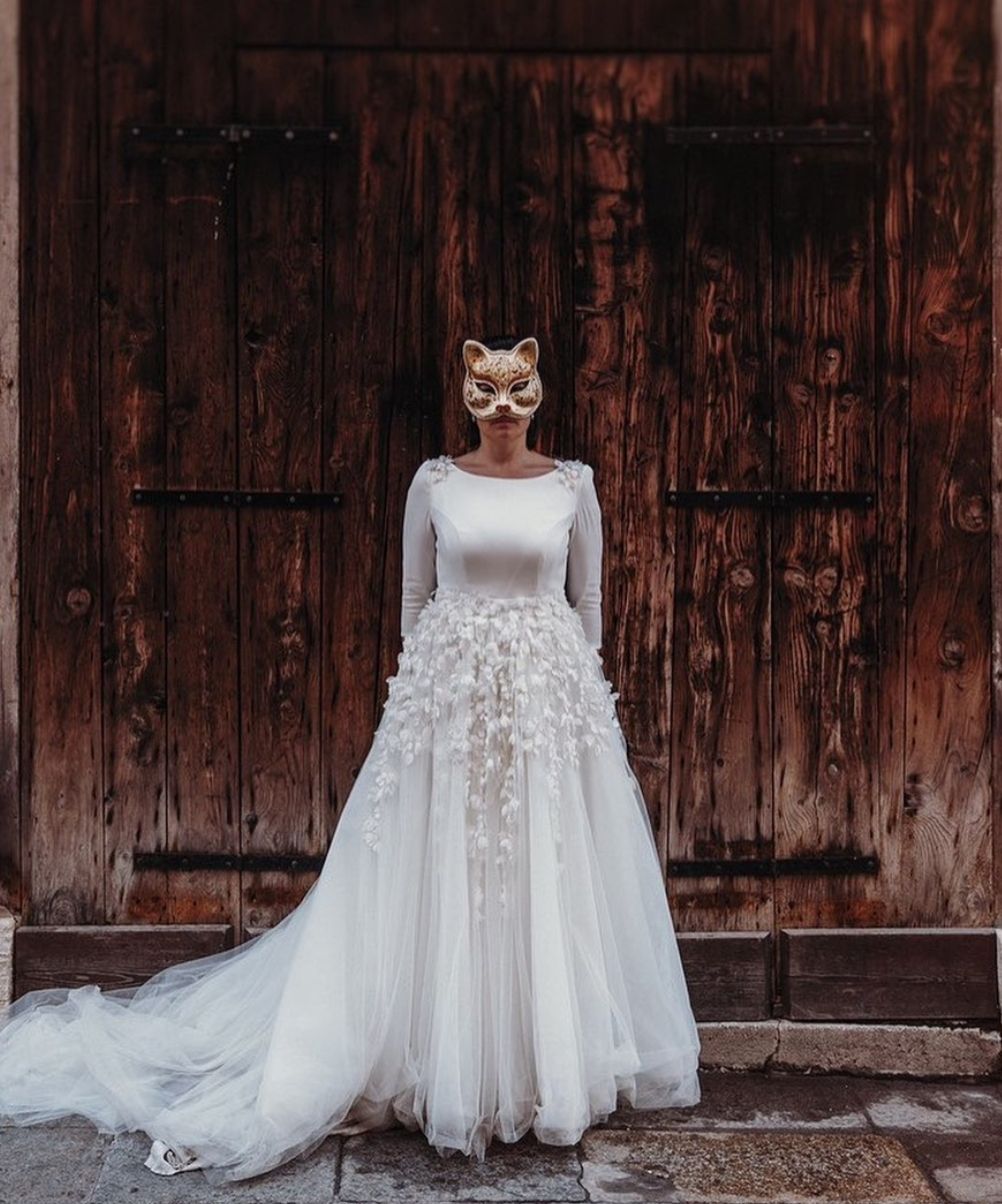 Bordado realizado en seda con flores 3D en degradado de color y cristal Japones, mezcla de técnicas, modelado de flores de seda, luneville y bordado tradicional. Realizado para Raquel Ferreiro.
