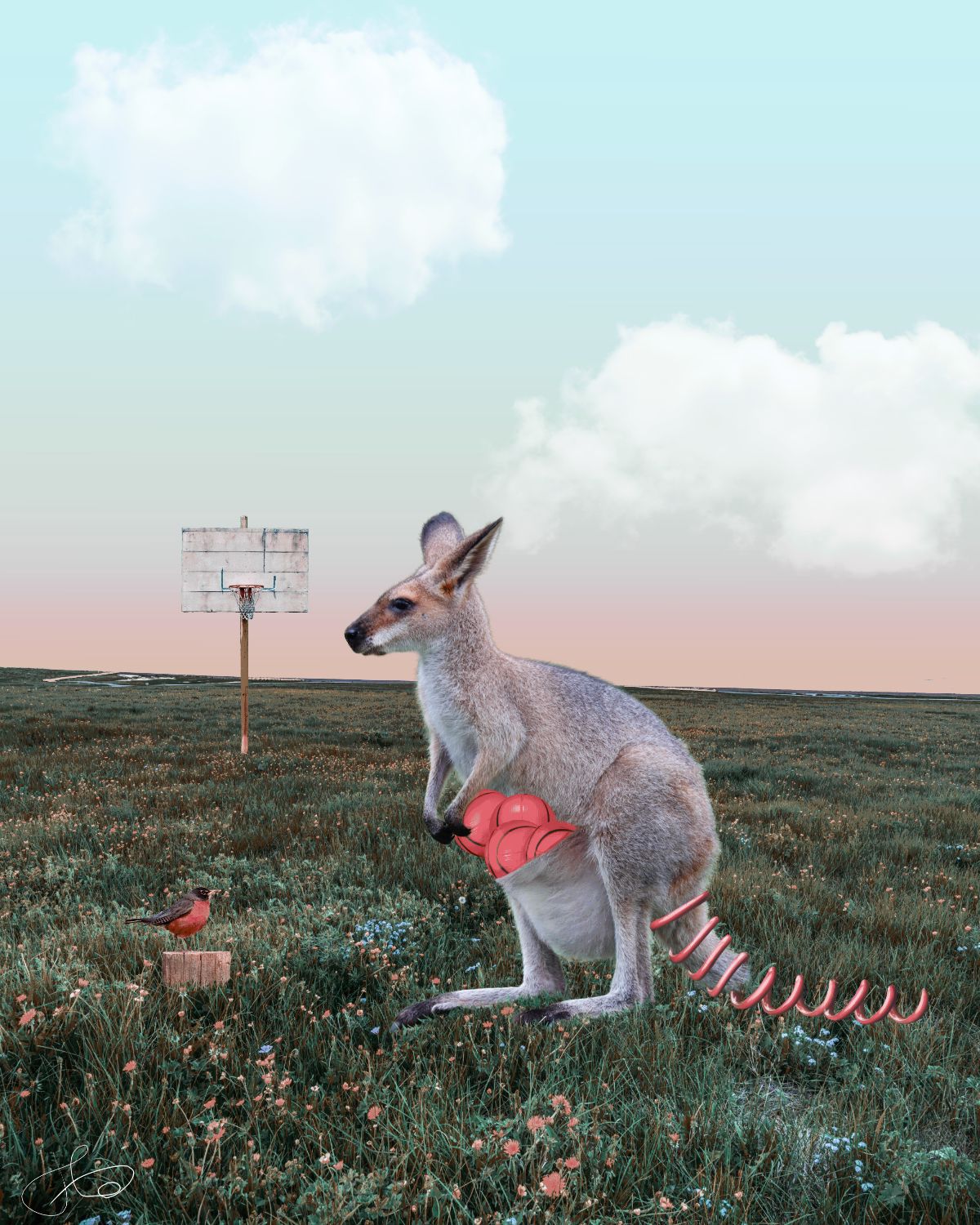 Fait à partir d'un kangourou (handicapé de la queue ! Et la texture de la poche du kangourou pourrait être encore améliorée et le ressort plus serré sur la queue), d'un oiseau, d'un ressort, d'un ballon, d'un paysage, d'un panier de basket et d'un ciel.