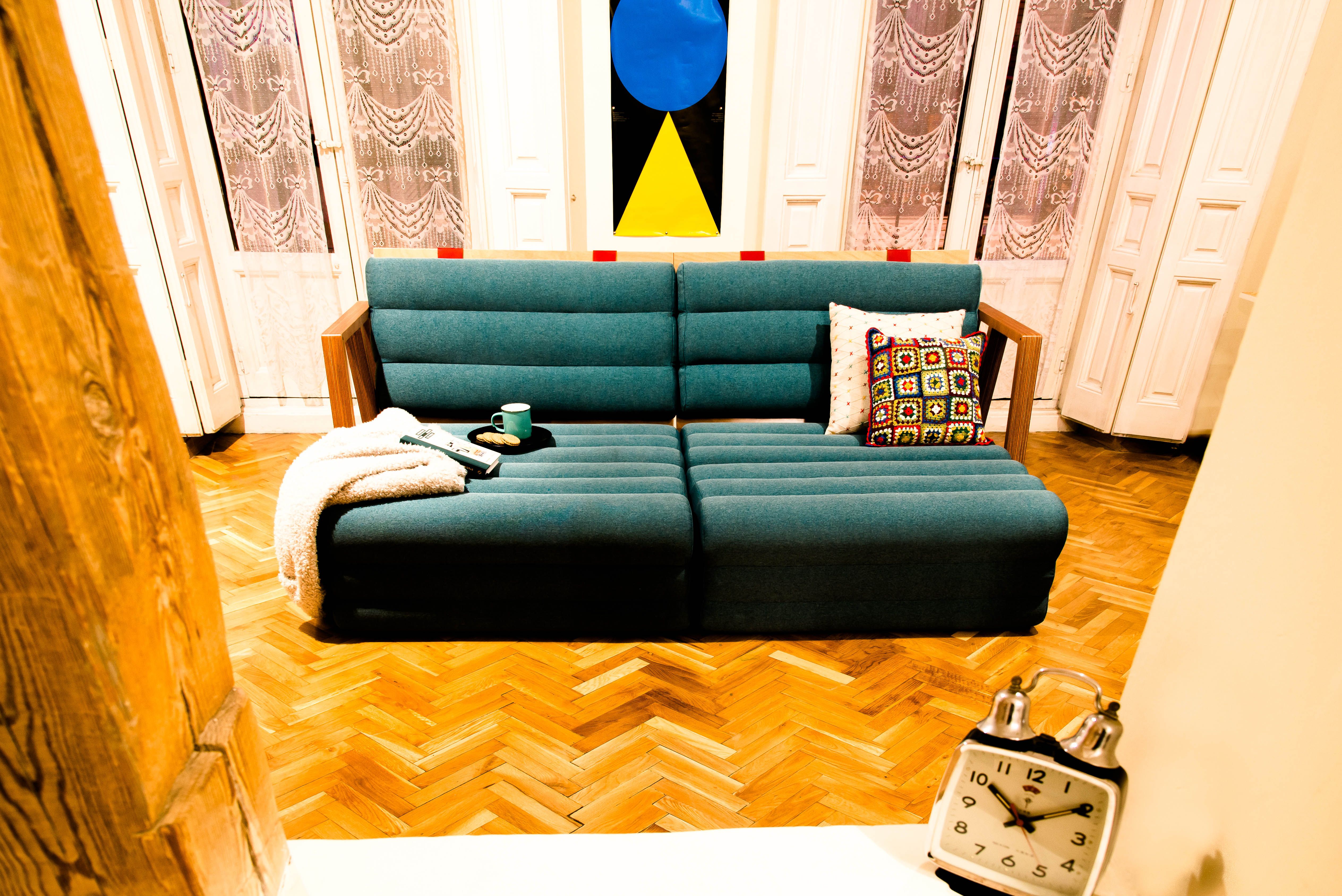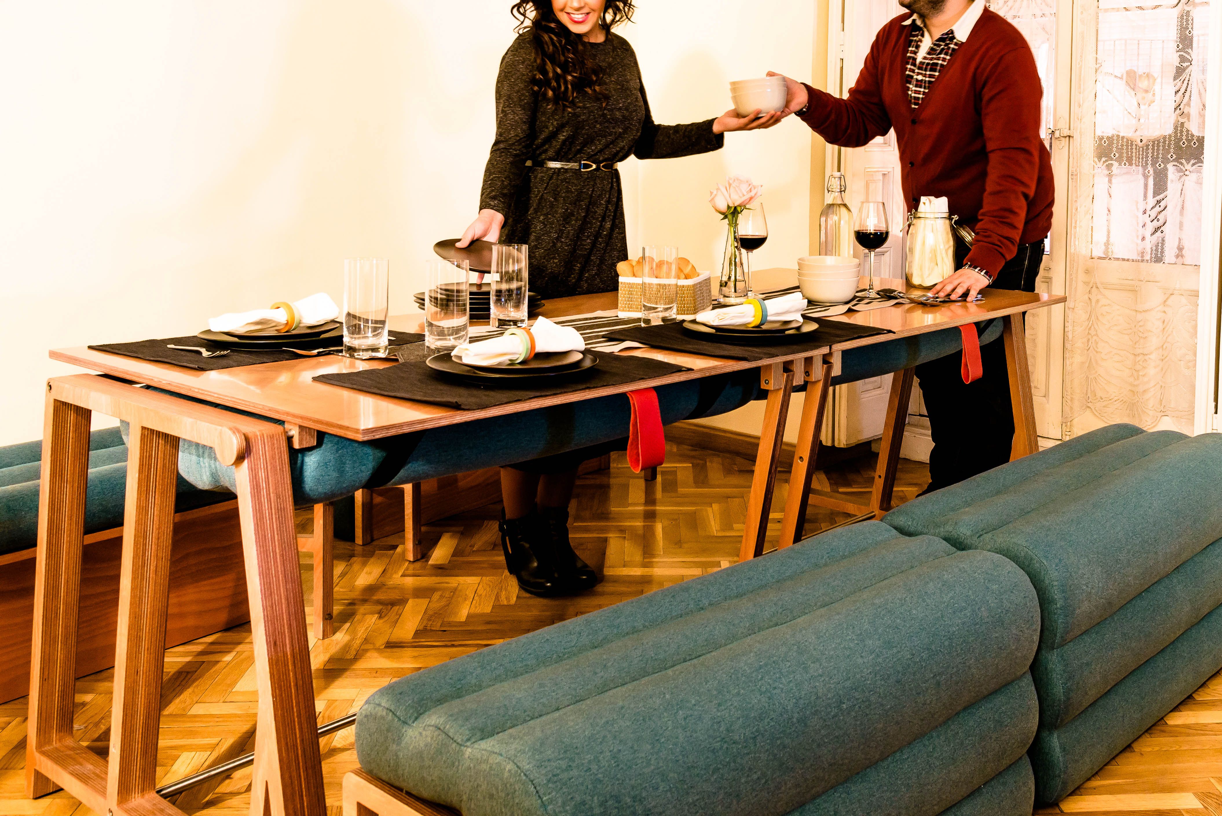 Mobiliario transformable diseñado especialmente para hogares pequeños o para personas que persiguen la funcionalidad espacial. Es versátil, sencillo y liviano. El único sofá del mundo con tantas transformaciones: sofá para 4-8 personas, cama, escritorio con butaca, chaise-longue y mesa de comedor para 8 comensales con asientos. Es un living room en toda regla y en un solo producto.
