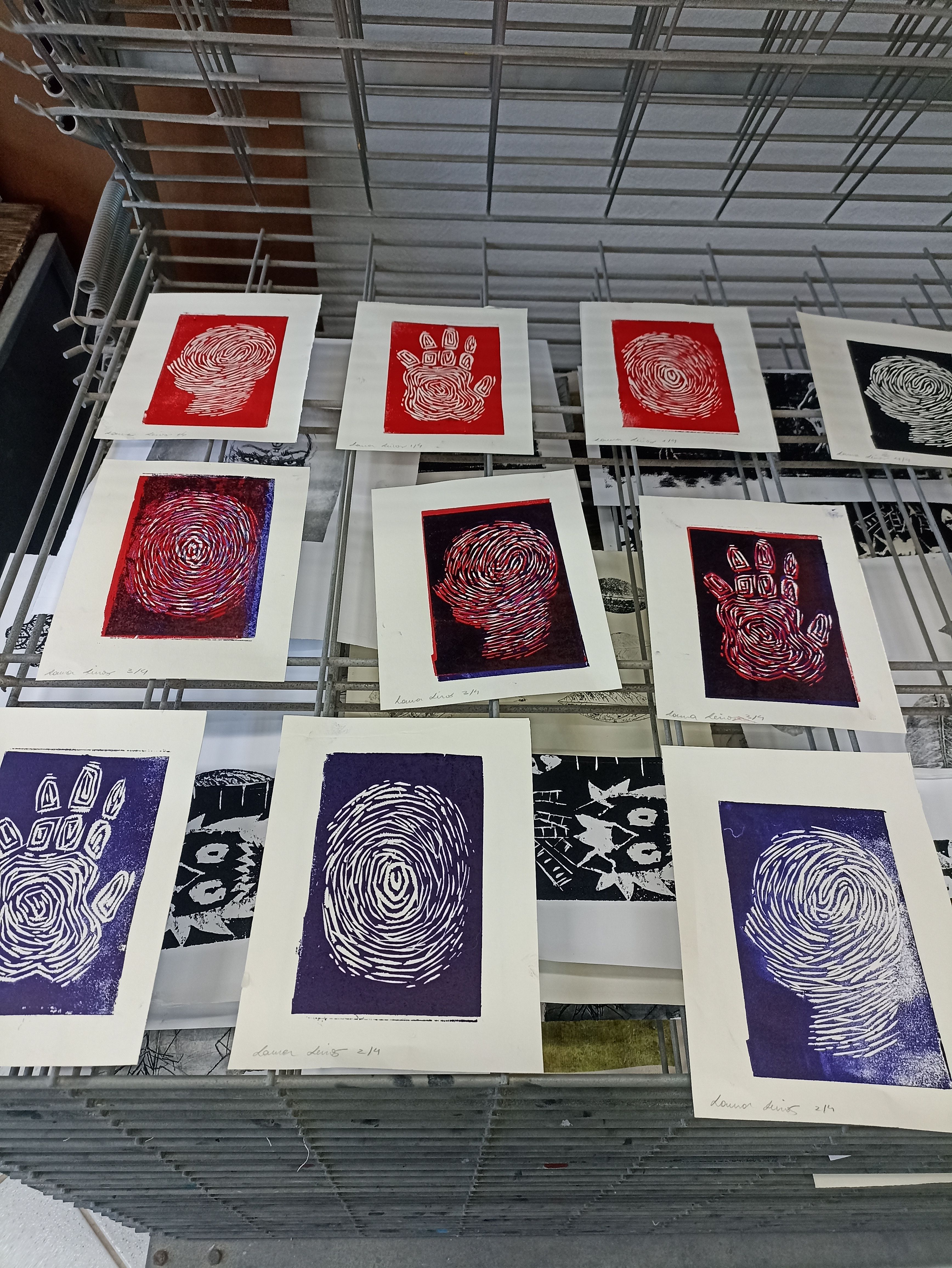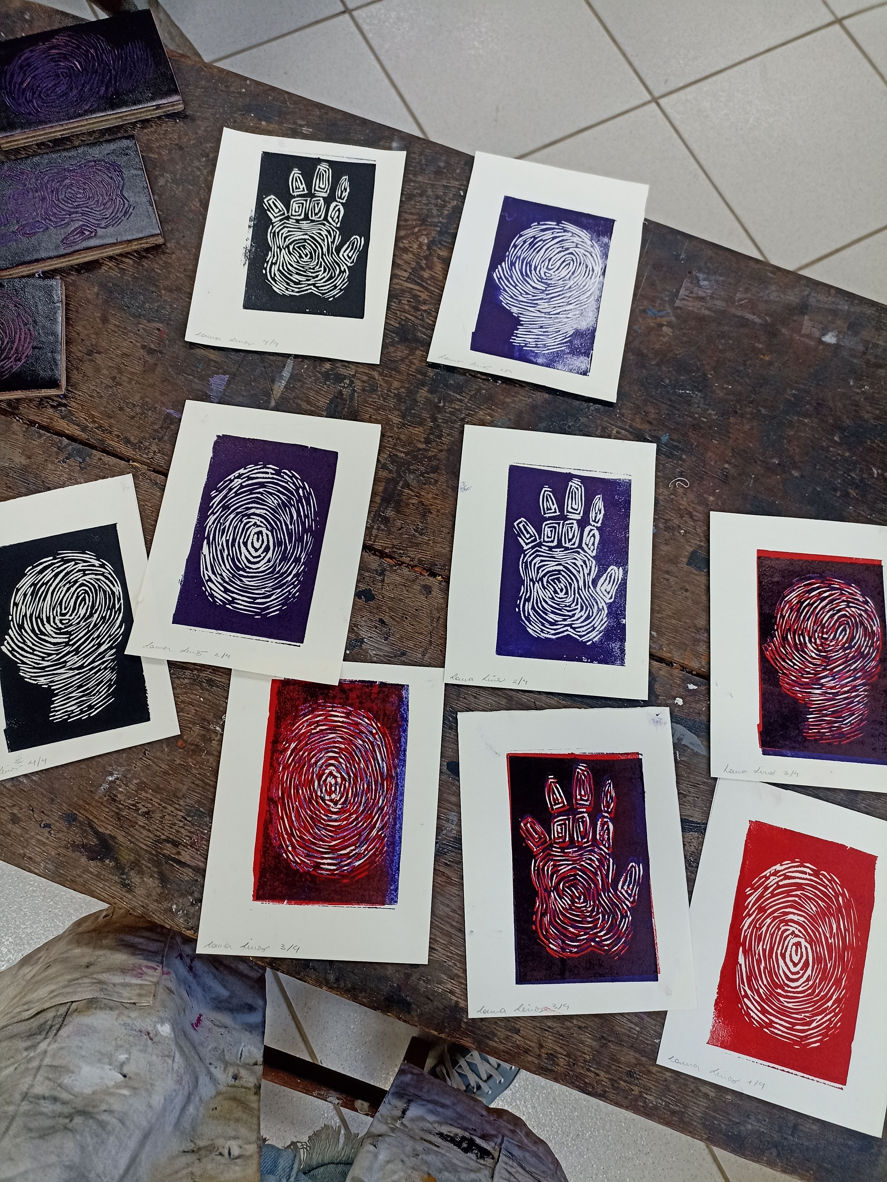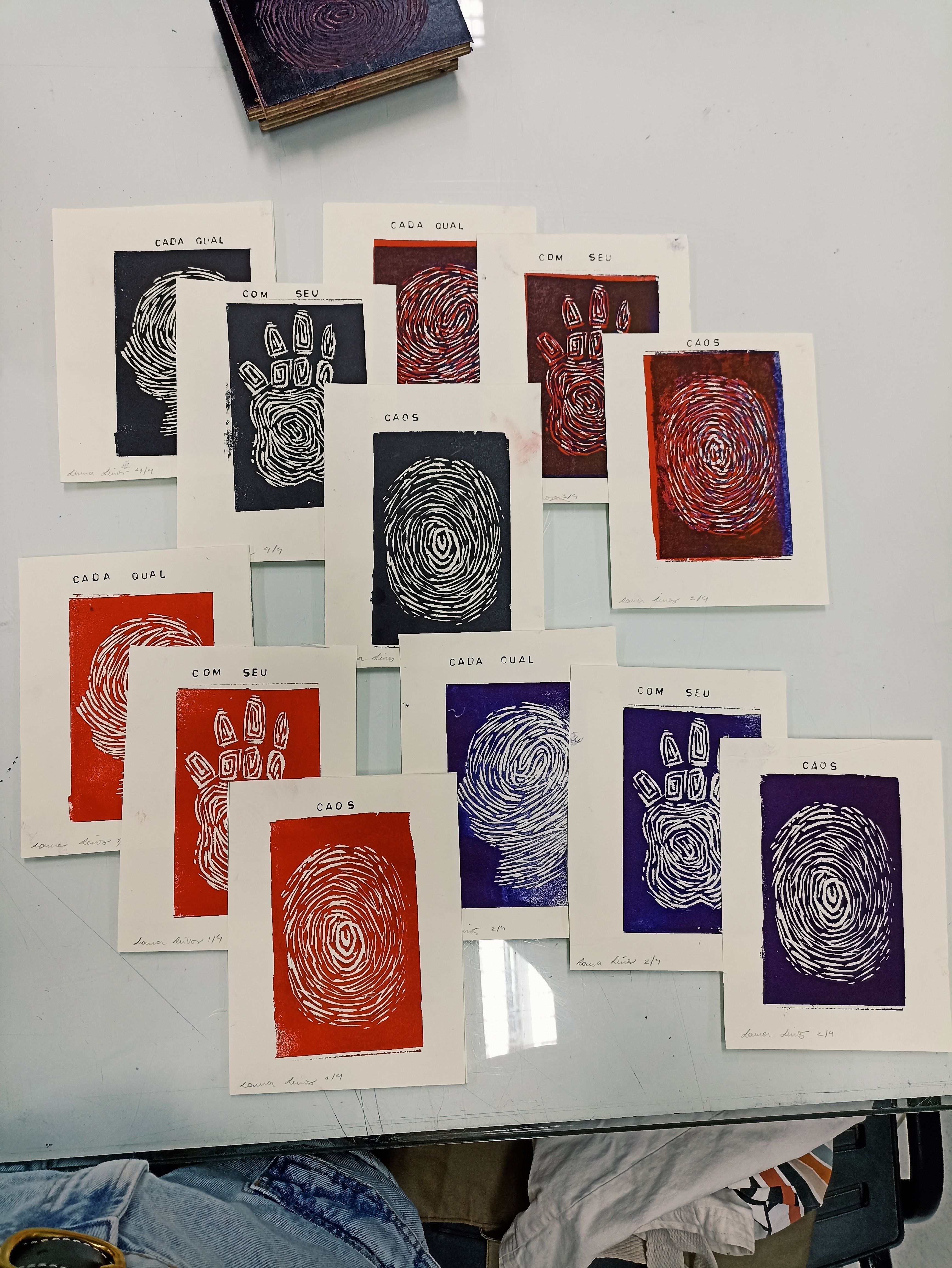 Xilogravuras em linóleo de 14x18cm, feitas em prensa gráfica uma por uma. Projeto desenvolvido na disciplina de Processos Gráficos no curso de artes visuais, tendo como tema principal a individualidade.