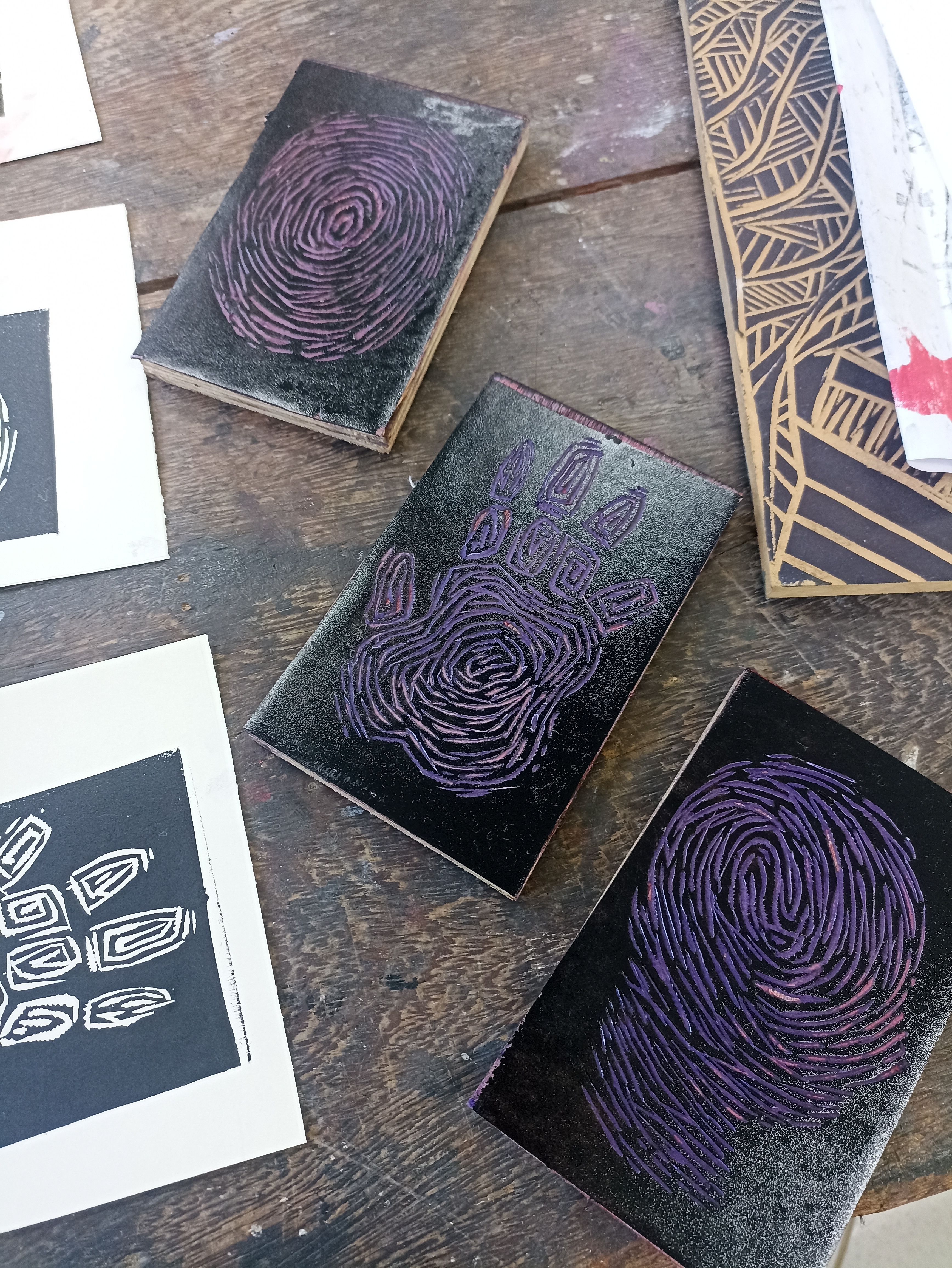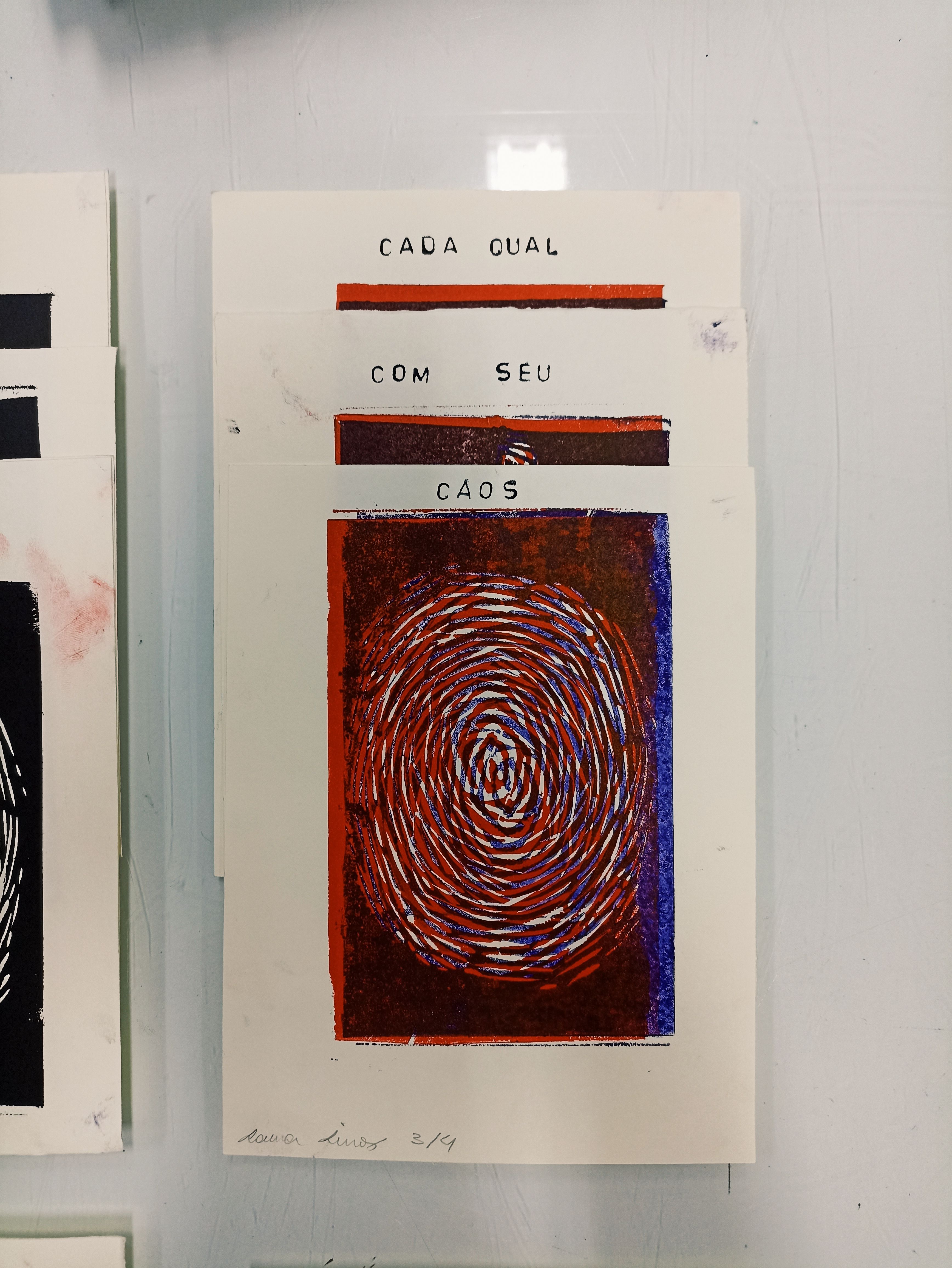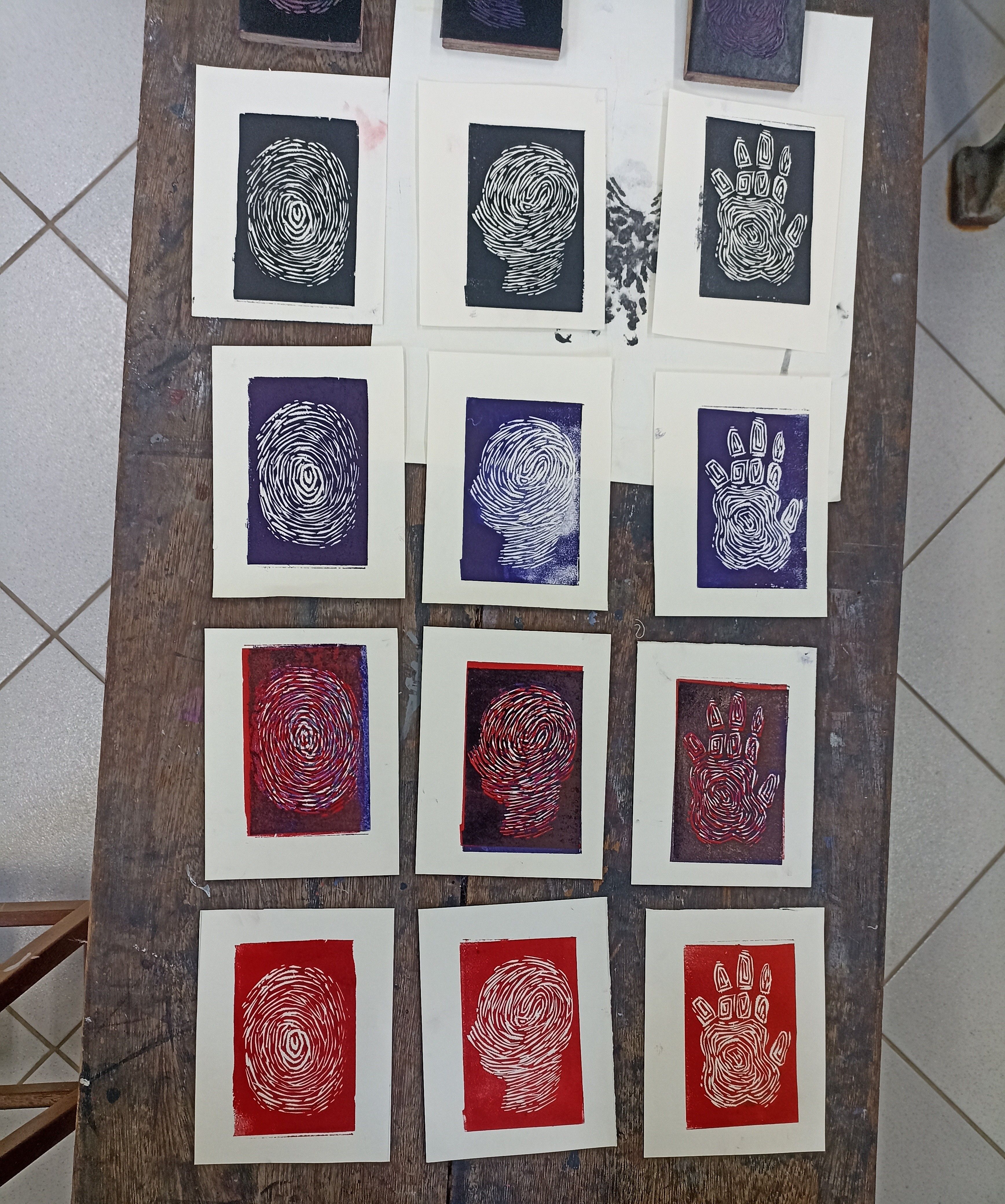 Xilogravuras em linóleo de 14x18cm, feitas em prensa gráfica uma por uma. Projeto desenvolvido na disciplina de Processos Gráficos no curso de artes visuais, tendo como tema principal a individualidade.