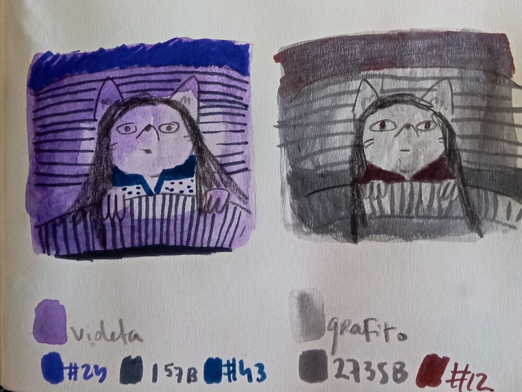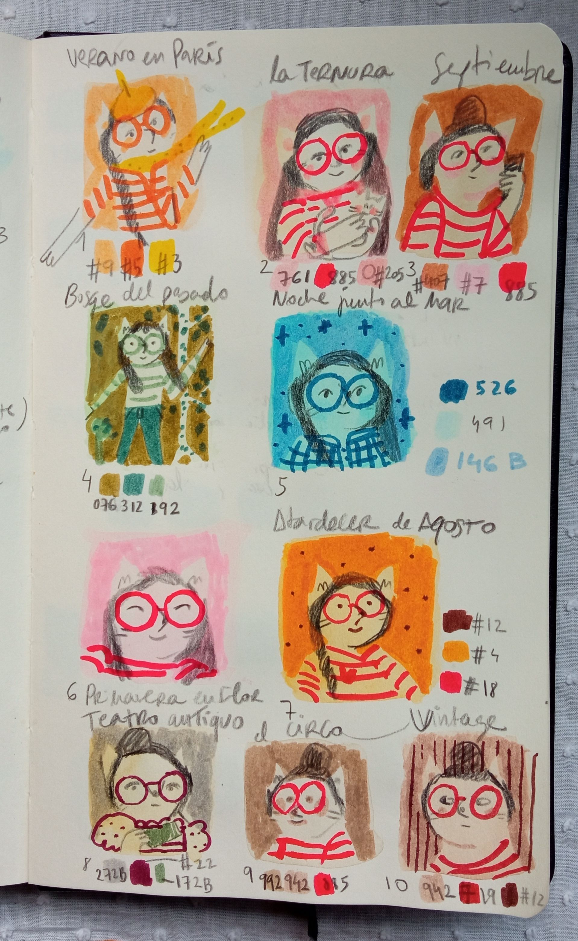 Probando combinaciones de colores cada una me sugería algo y les puse título. Para el proyecto utilicé la que me recordaba a un verano en París, y crear una pequeña narrativa muy simple para practicar.
