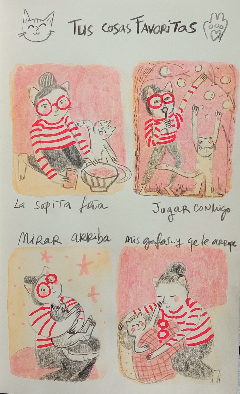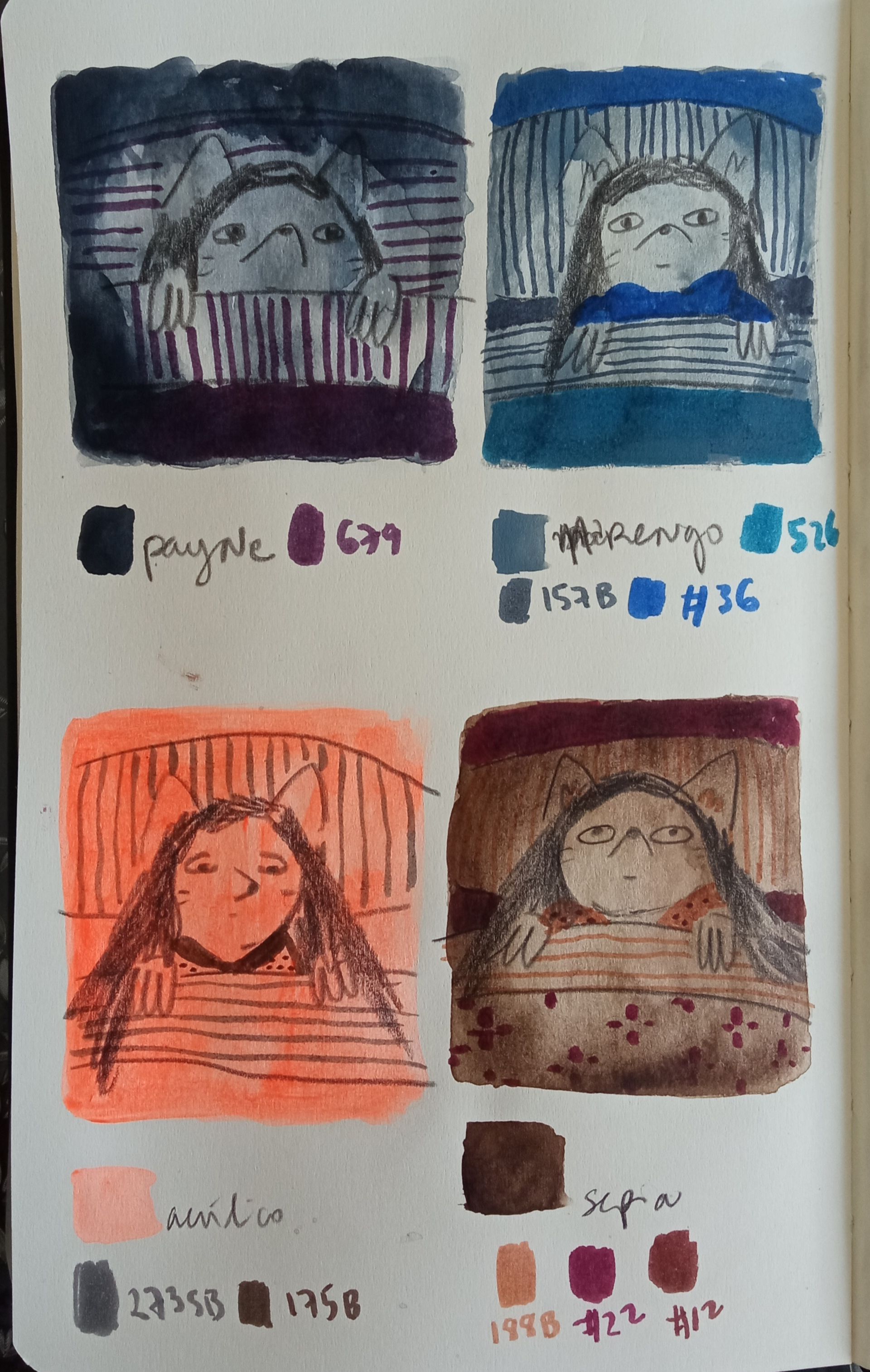 Hice alguna prueba más para la lluvia y con la paleta Ternura también hice unas viñetas con mi amiga la gata.