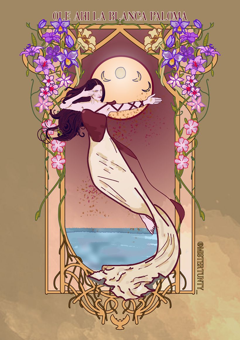 Ilustración con estilo ART Nouveau, inspirado principalmente en la cantante alicantina Blanca Paloma.