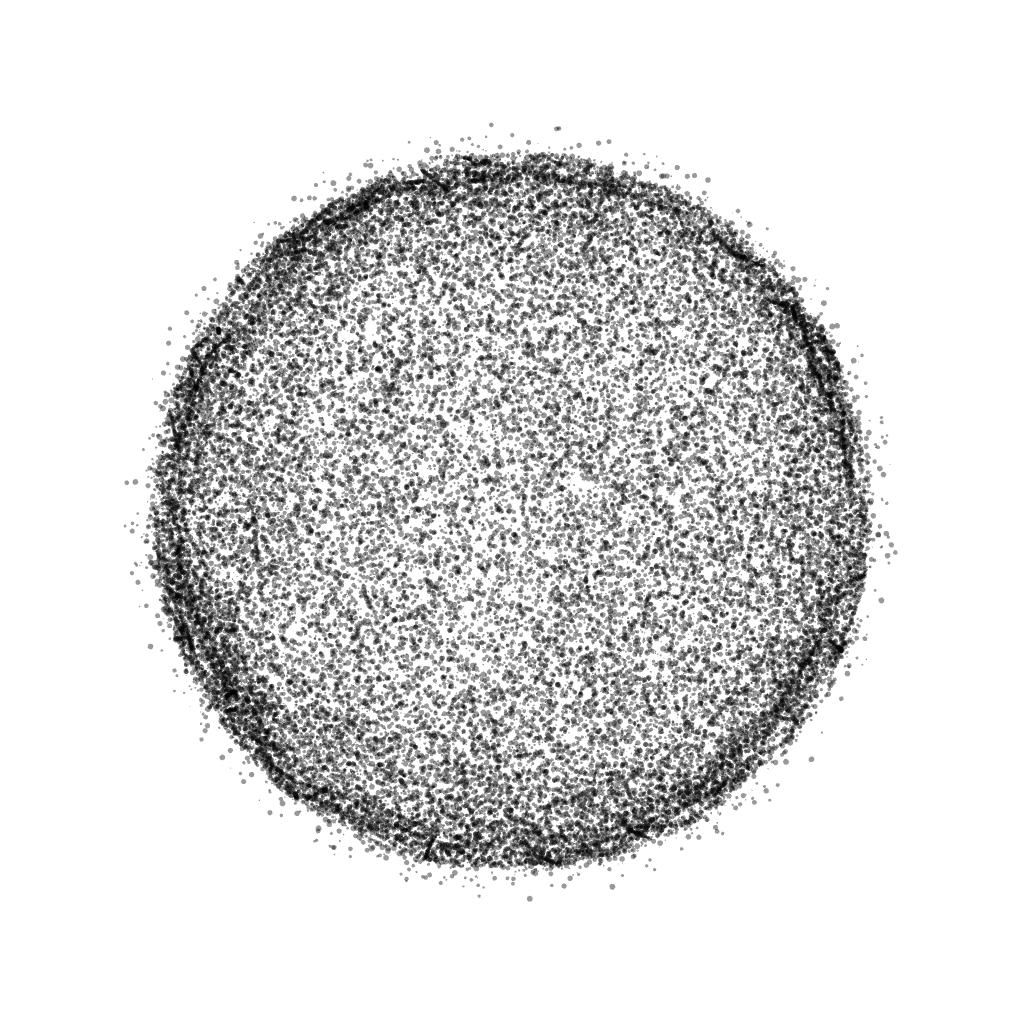 I wanted to experiment with a way to soften the outline of the circle, and I landed on adding a minor random variation to the size of the `random.onCircle()` radius that selects the start and end-points. Below is the result.