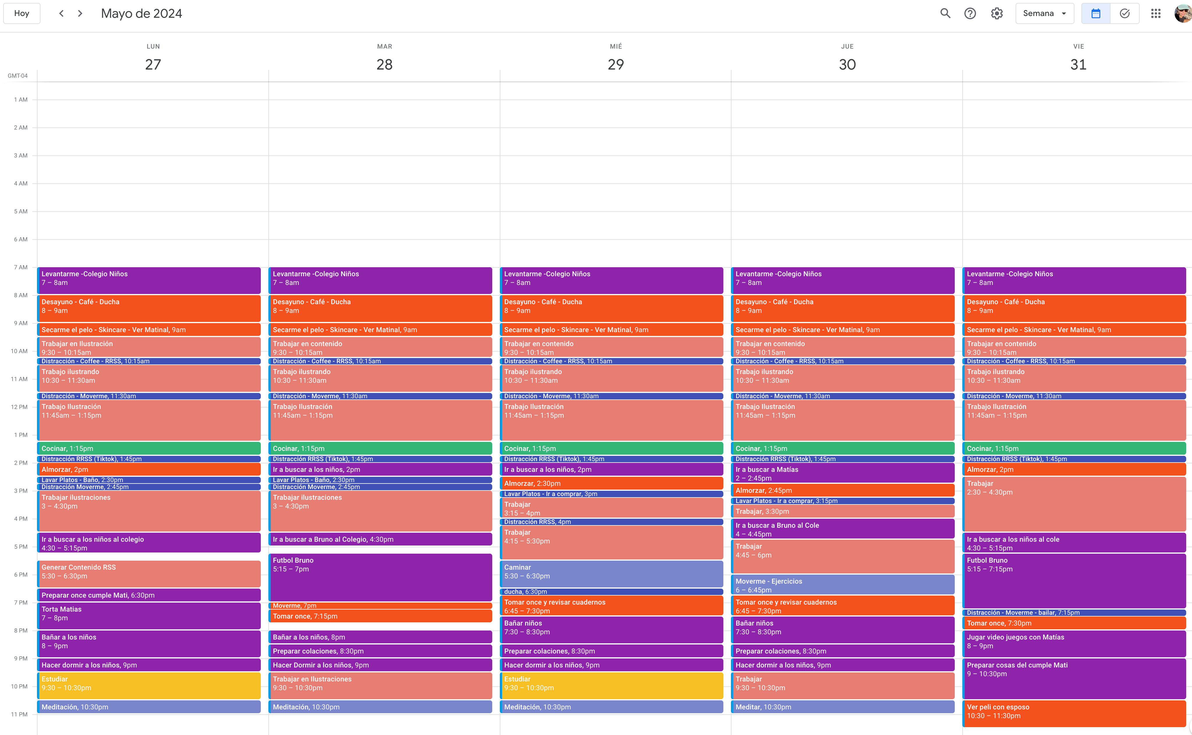 Buenas noches, primero que todo, debo decir que el curso es excelente, la profesora muy buena, explica muy bien y fue de verdad un muy buen curso, soy una persona con muchas cosas durante el día y no podía organizarme bien, pero con este curso creo poder comenzar de a poco a realizarlo, para que mis proyectos salgan adelante y no esté estresada todo el tiempo. Muchas gracias. Muestro mi calendario, creo que irá cambiando de acuerdo a las responsabilidades que tengo con mis hijos, pero ya teniendo en cuenta el modo de organizarme podré lograrlo. Muchas gracias ¡¡¡