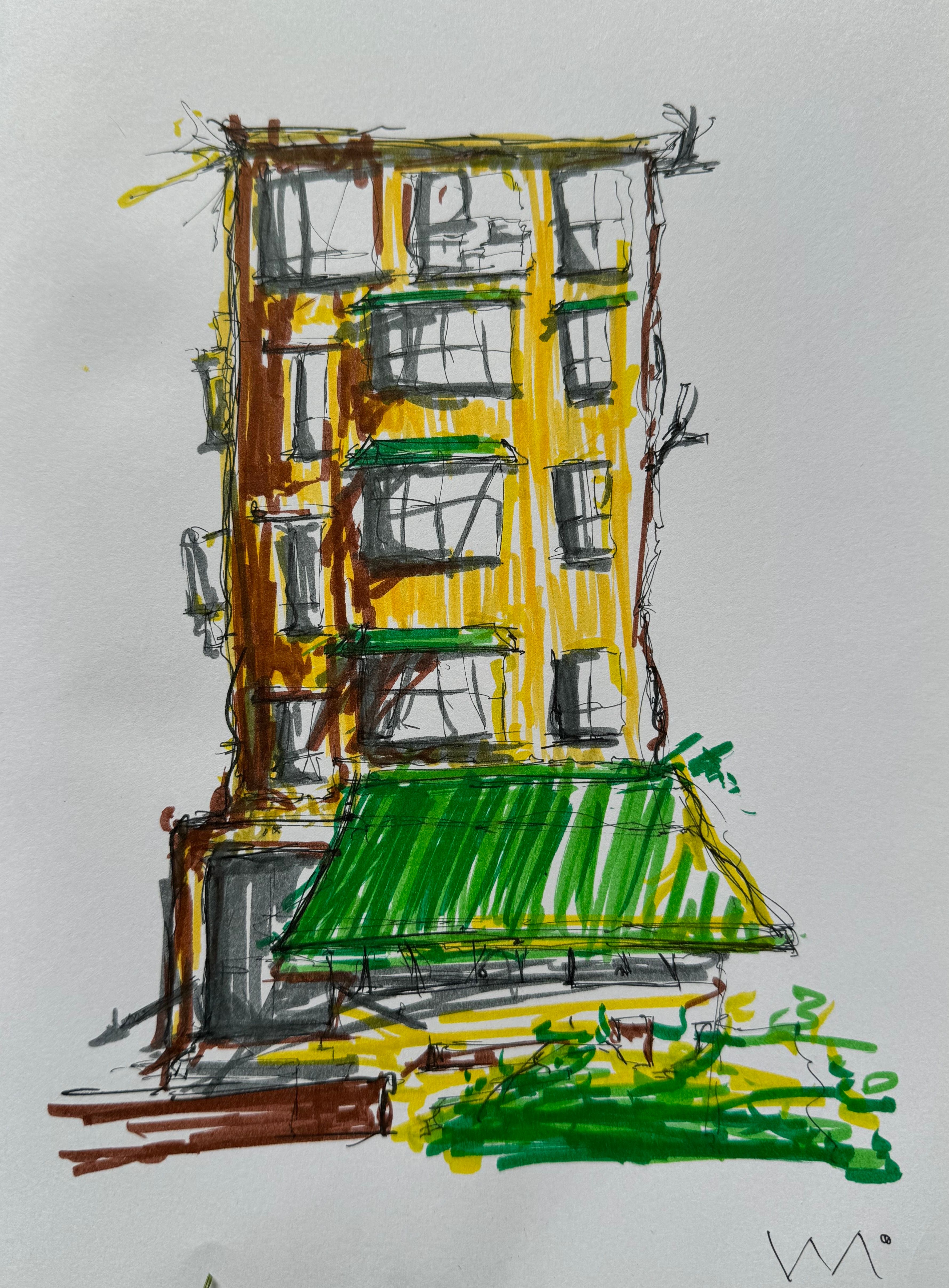 Then, I went out and got some markers (a bit randomly) and started taking a stab at the same previous cartoonish shape for the building, but now with the right markers (some w&n)