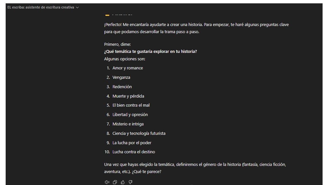 Este GPT es un asistente para generar historias. Se le dió información sobre esquemas como El viaje del héroe, las funciones de Propp y otros documentos de temáticas, contrucción de personajes, tiempo y espacio narrativos etc. Al asistente te hace preguntas claras y sencillas y te brinda información y opciones par continuar la historia. Le puedes pedir sugerencias y también la generación de imágenes automáticas sobre lo que estás contruyendo.