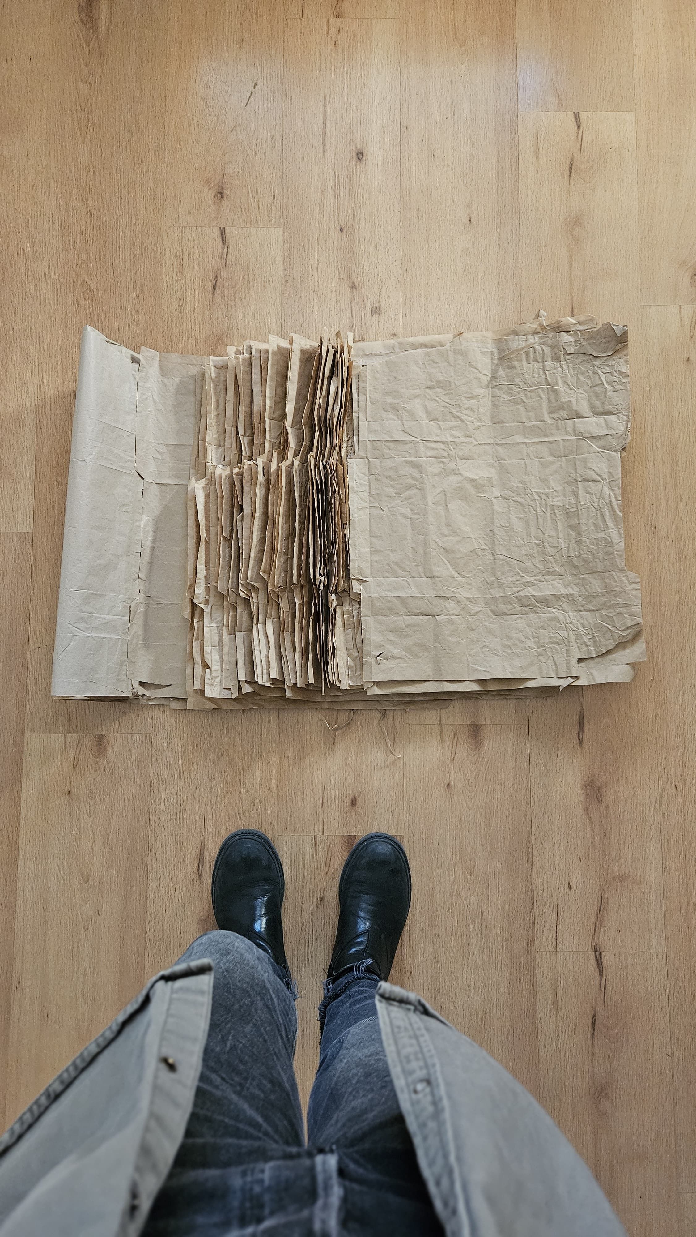 Consiste en un lienzo de bolsas de papel craft unidos entre ellos con la finalidad de crear arte con ellos. Estas bolsitas las entrega el área de alimentación donde trabajo, al retirar el almuerzo o comida del día. Dentro de la bolsita te puedes encontrar con aliños para la ensalada y un juego, o un snack y una bebida dependiendo si retiras ensalada o sandwich respectivamente.