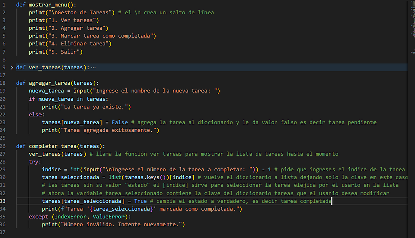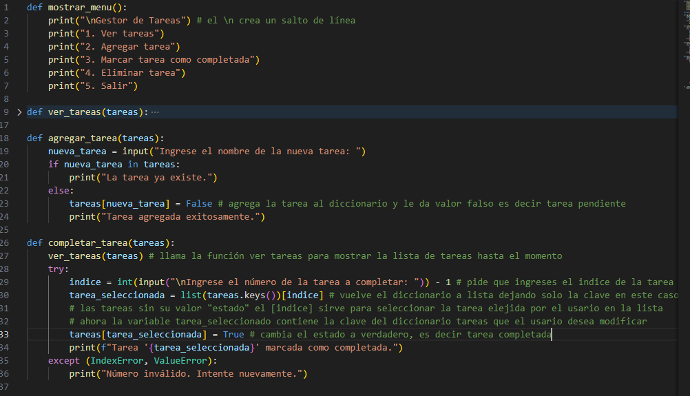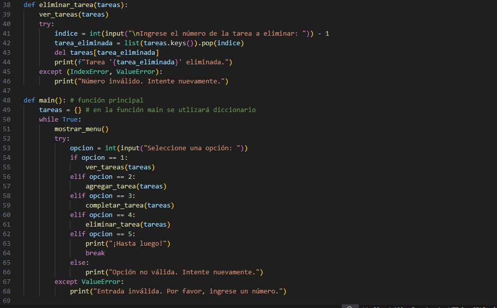 Es un programa interactivo escrito en Python que funciona como un gestor básico de tareas. Permite al usuario administar una lista de tareas personales con funciones para visualizar, agregar, completar y eliminar tareas. Todo este se realiza desde un menú interactivo